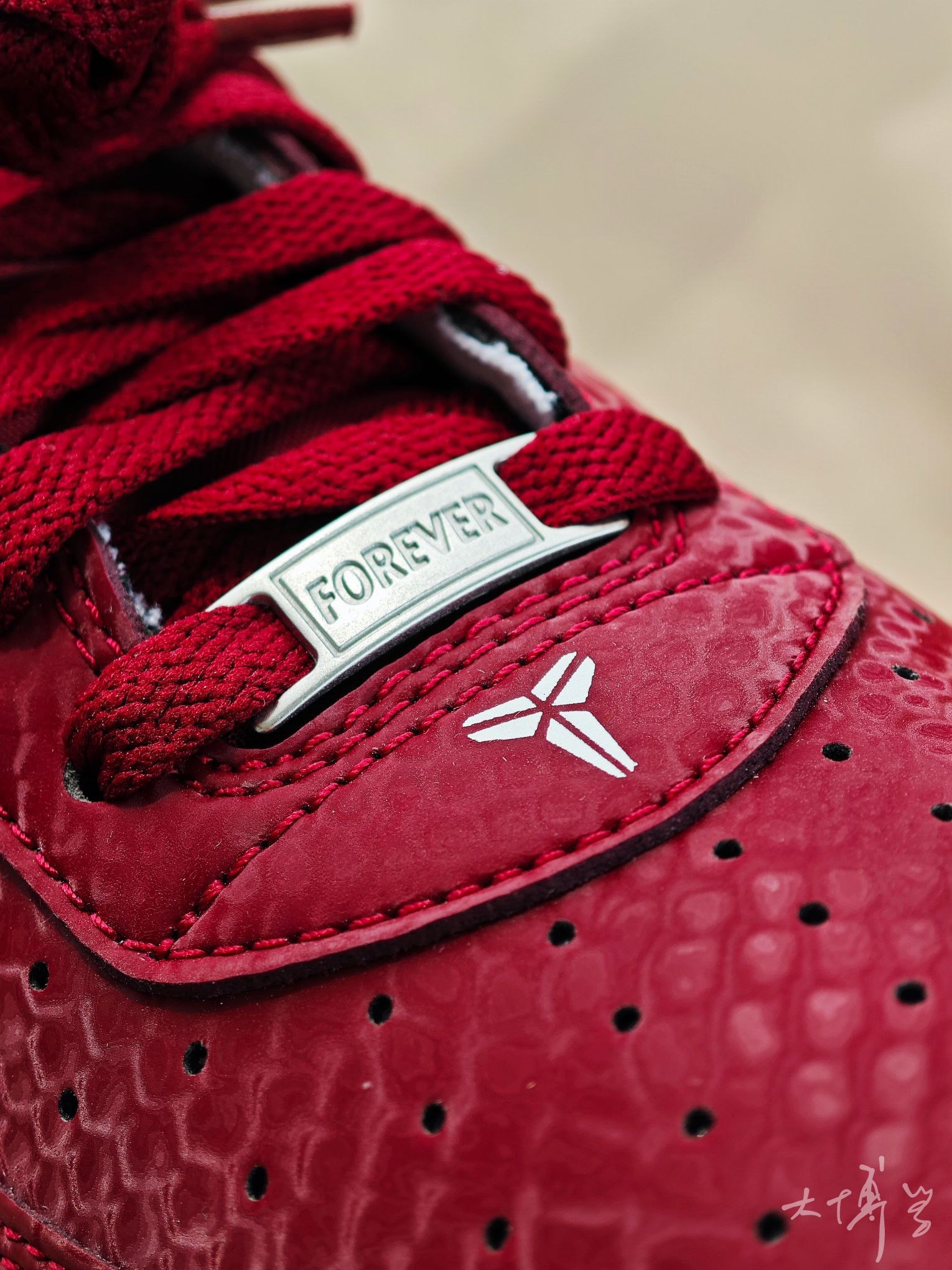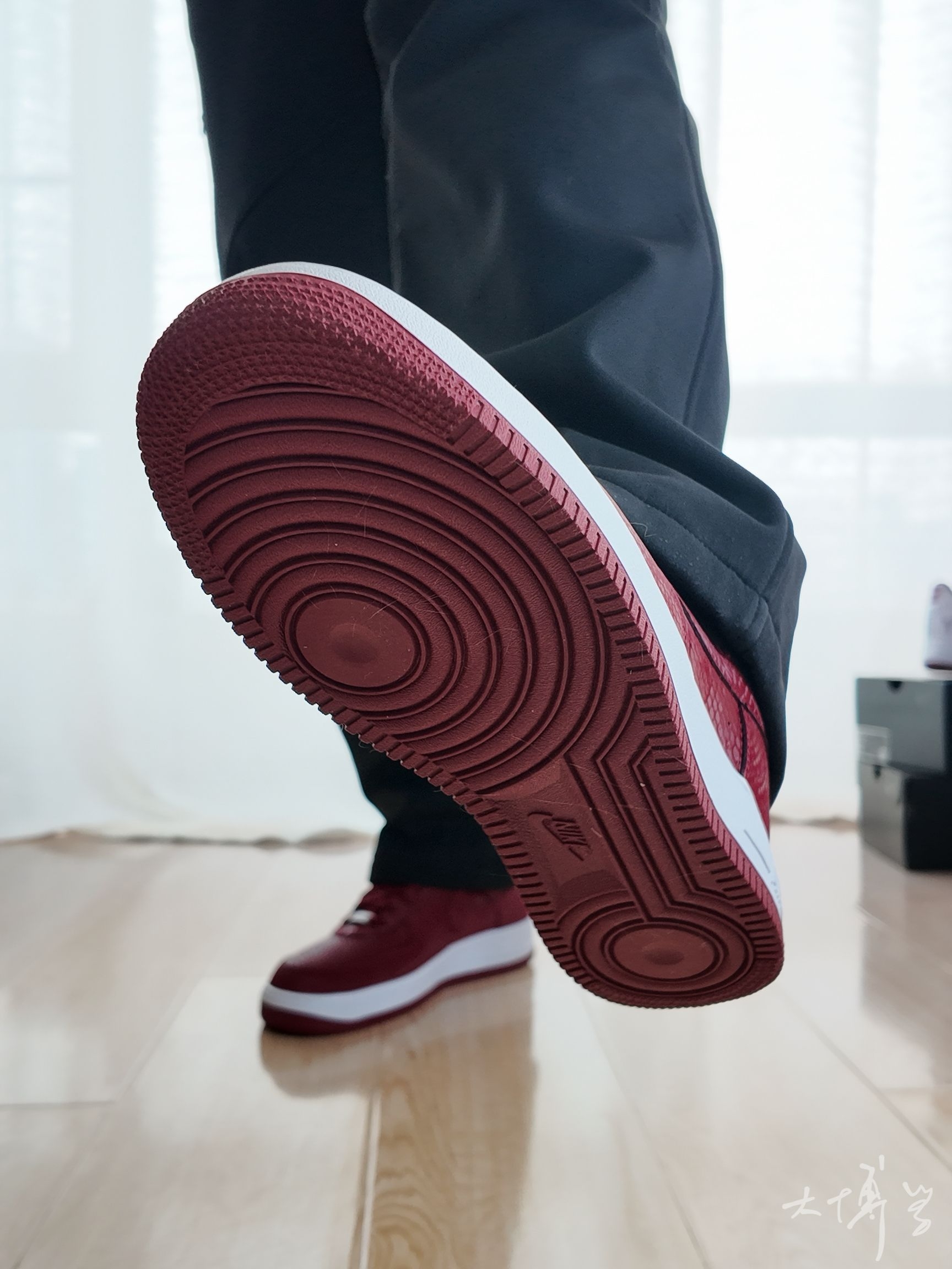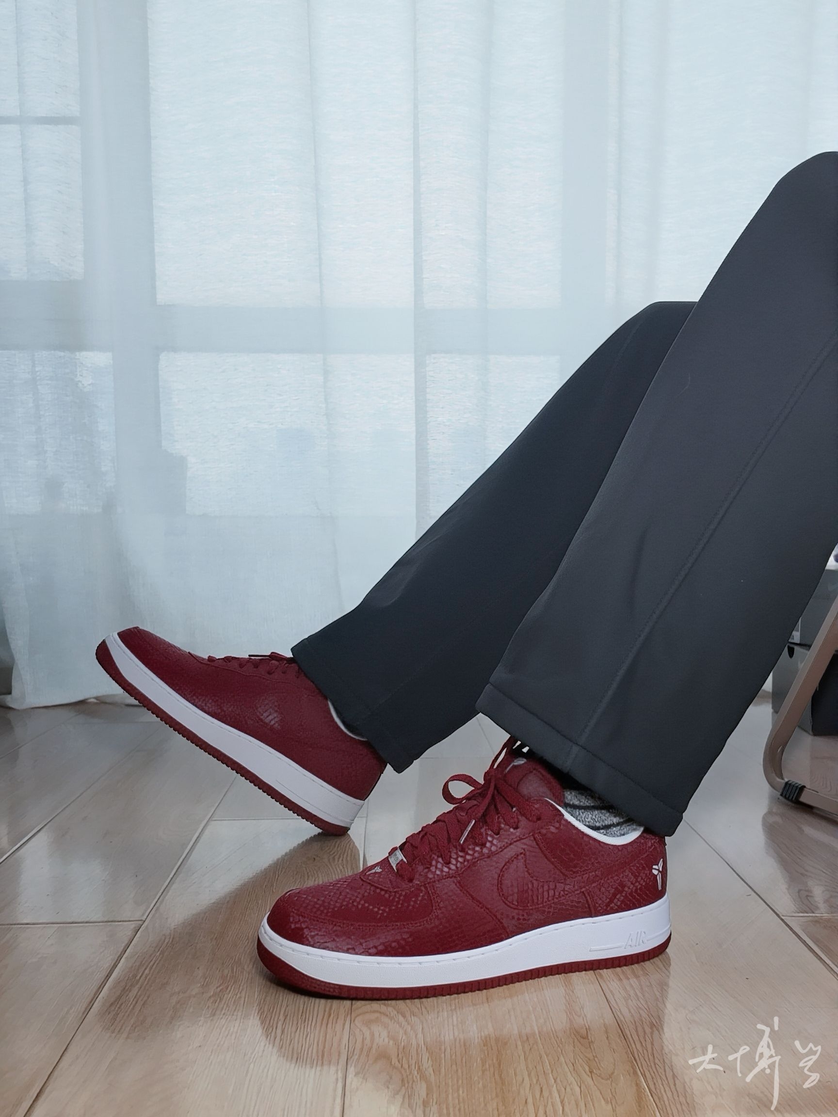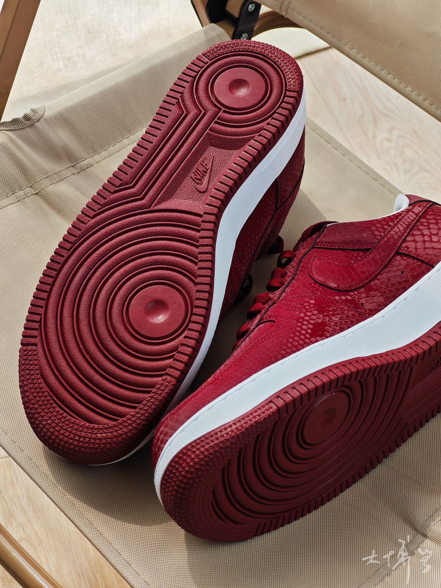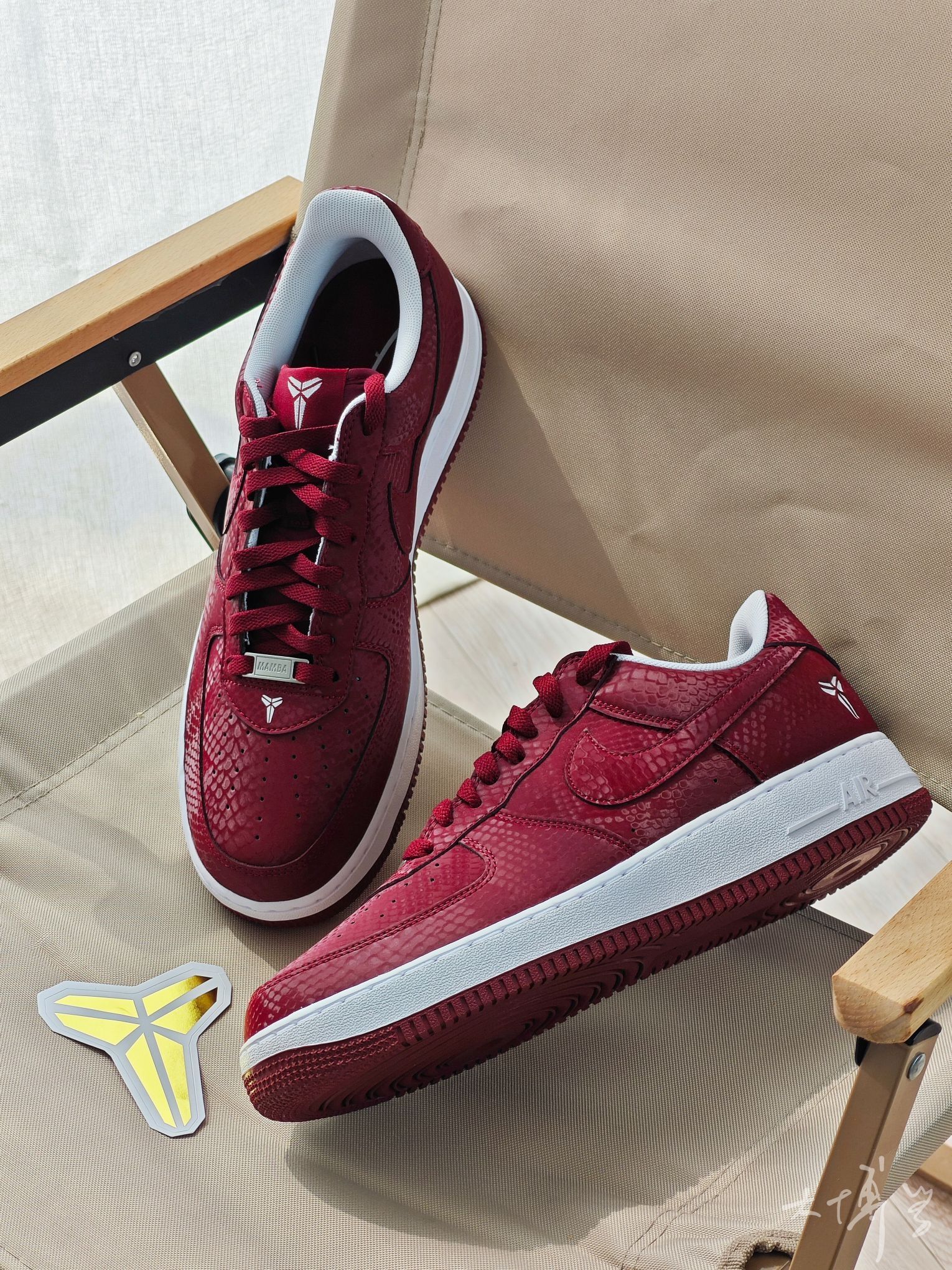 在AF1系列中 这双算是轻便款,海绵填充薄,皮质也薄 鞋面带有蛇鳞暗纹 算是一把双刃剑 充满个性而且明确了曼巴主题 但合成革质感确实不如真皮 有舍有得 颜色除了这个红色,还有一双白色的 这双红色可能更能代表劳尔梅里恩高中