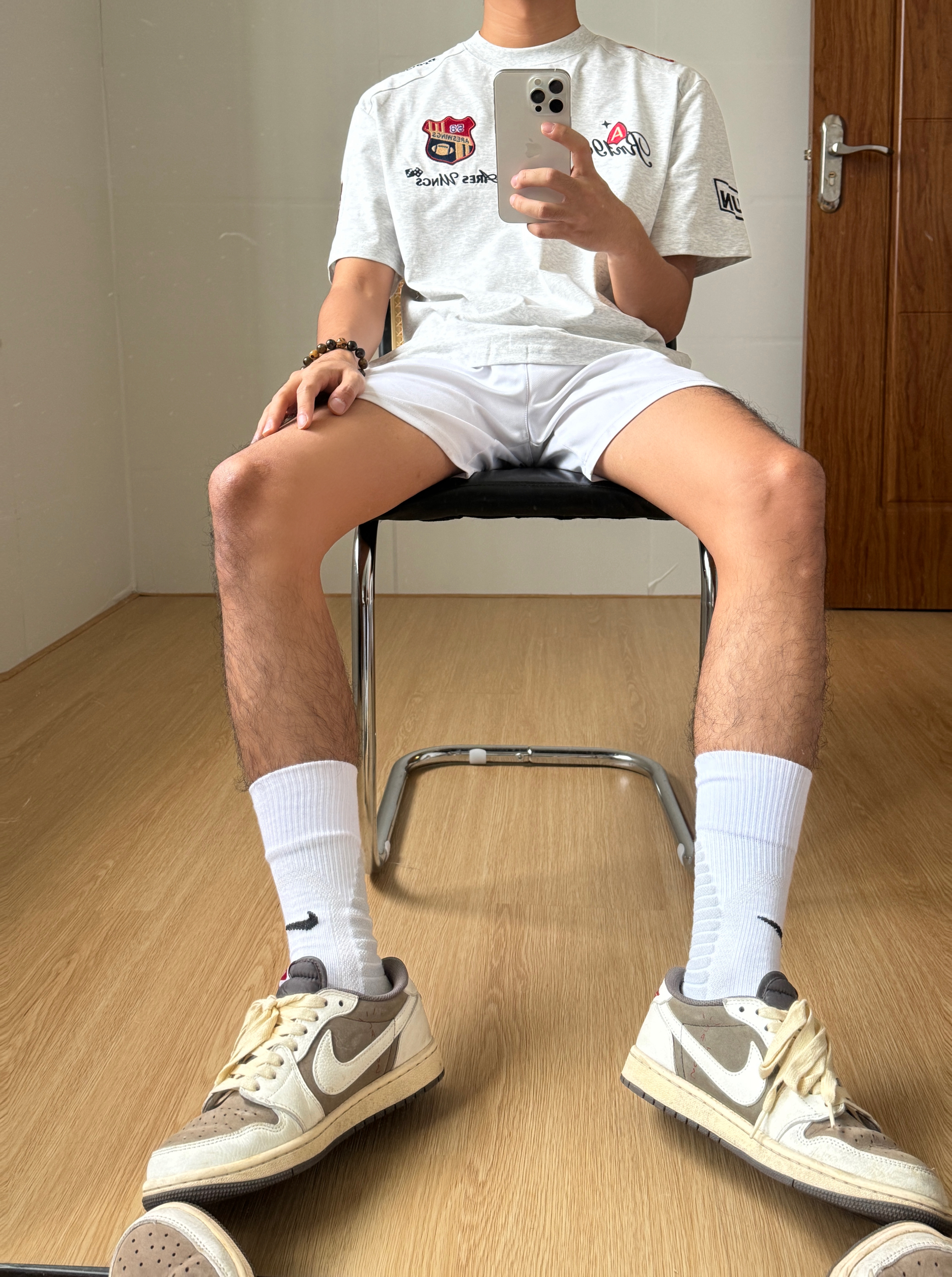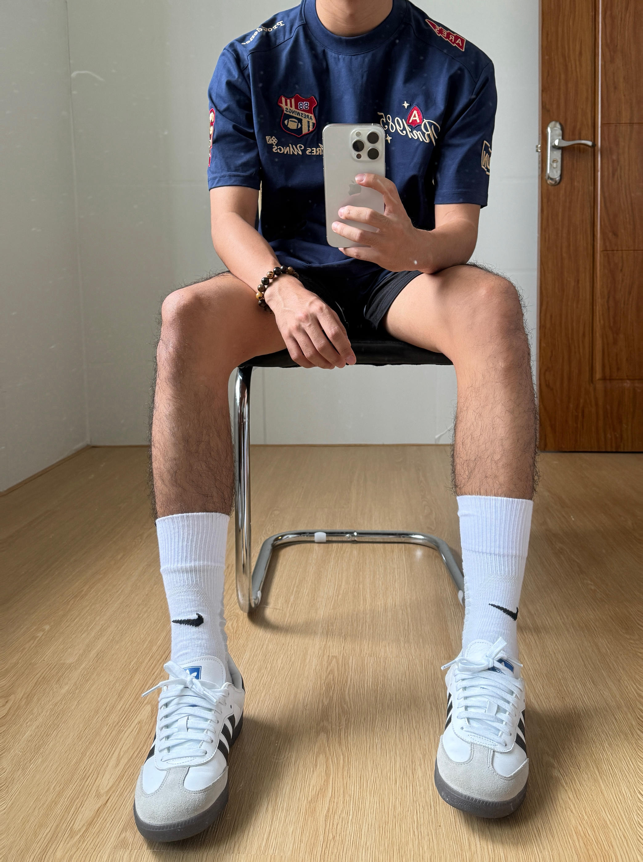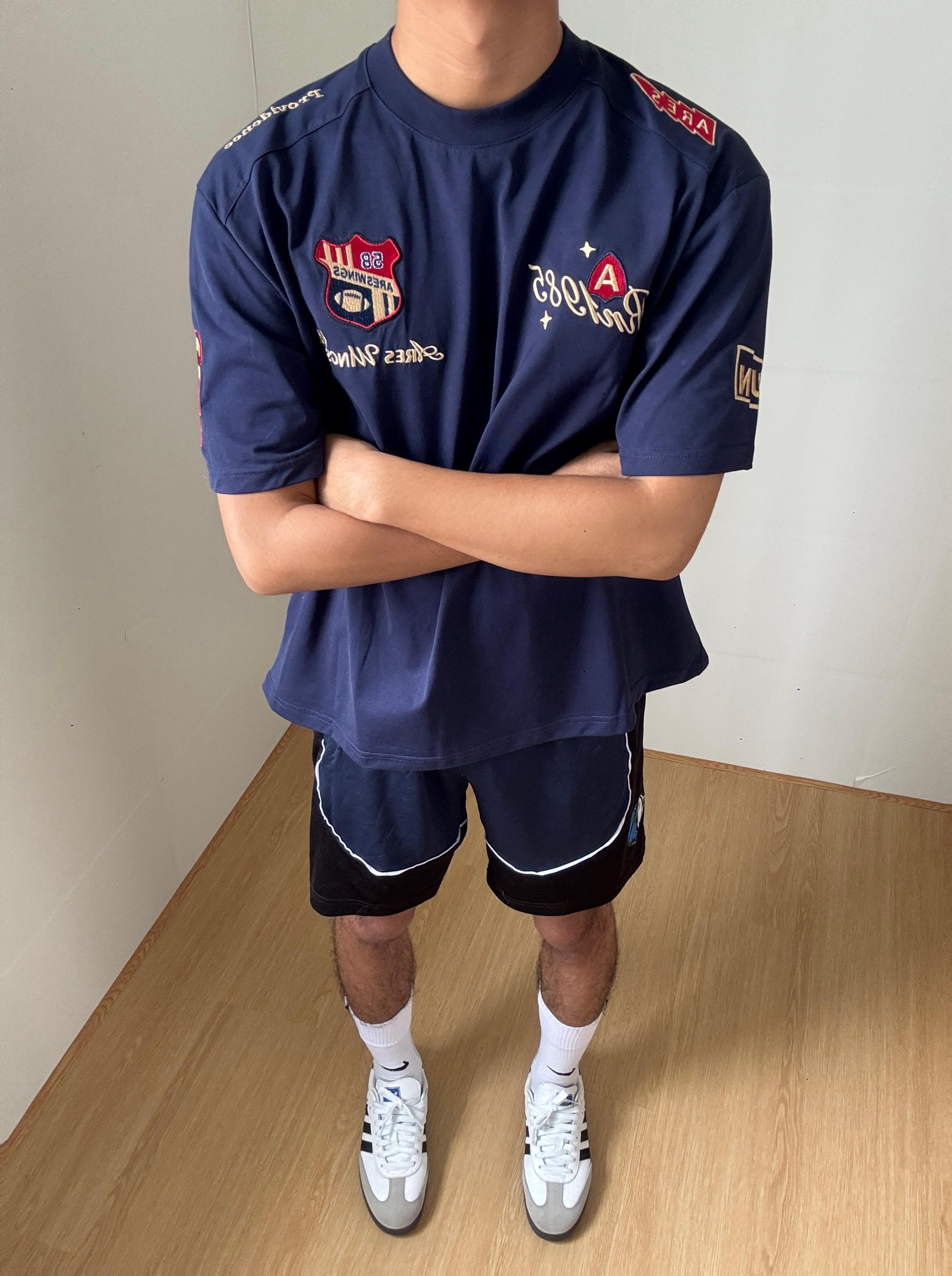 上身这件藏蓝复古刺绣短袖🤌 做旧徽章+手写体印花,美式复古感直接拉满!宽松落肩版型不挑身材,藏肉又显利落,单穿就自带腔调,出门随便搭都有范儿~ 搭配同色系撞色运动短裤👖 黑白拼接设计超有层次感,网眼面料透气不闷汗,运动感拉满,日常出街、打球健身都适配,清爽又实用! 白袜+德训鞋是灵魂组合👟 干净小白鞋中和深色厚重感,中筒白袜堆出少年感细节,瞬间拉长腿线~ 整套同色系呼应,松弛感和高级感双在线,男生...