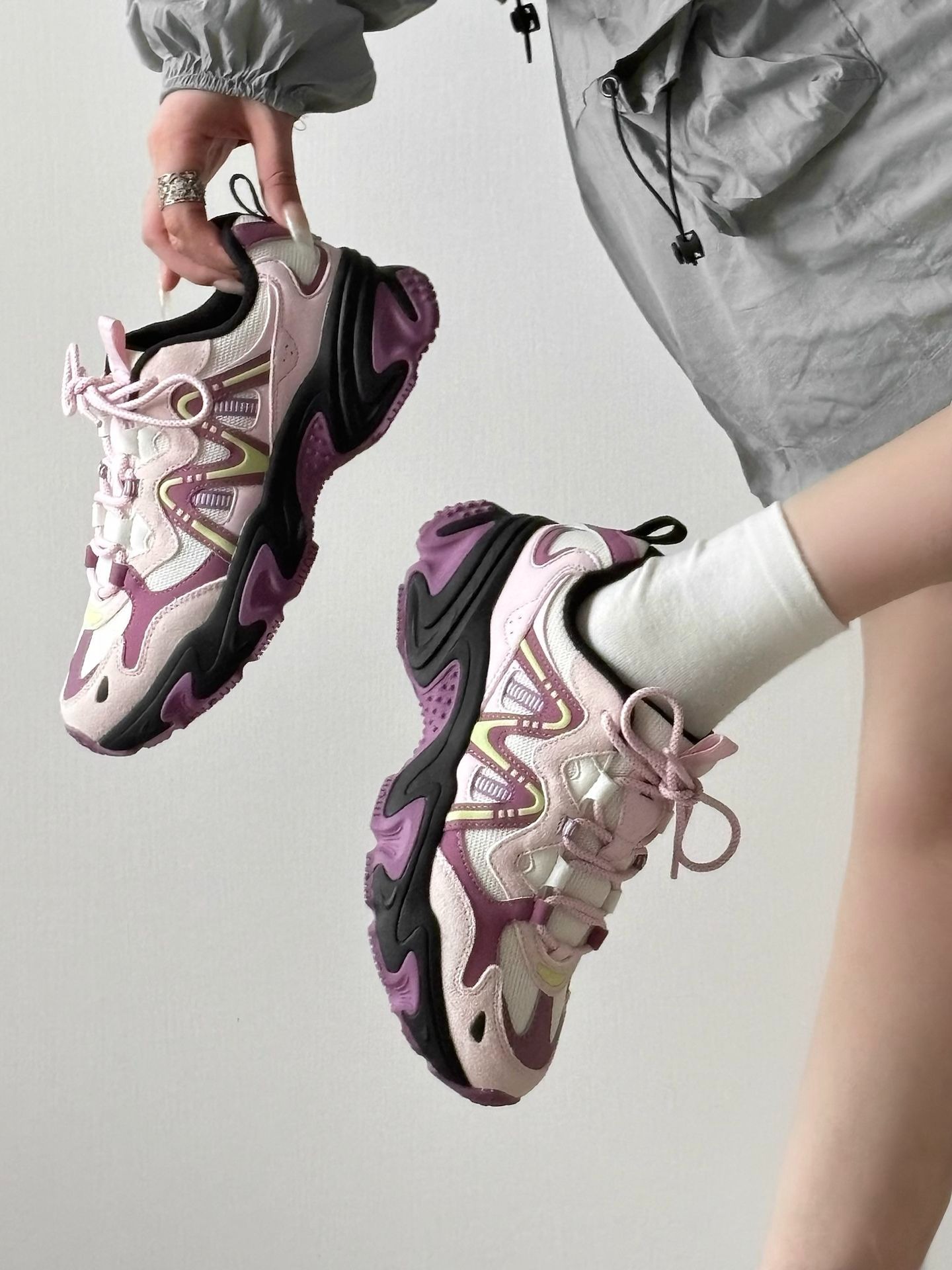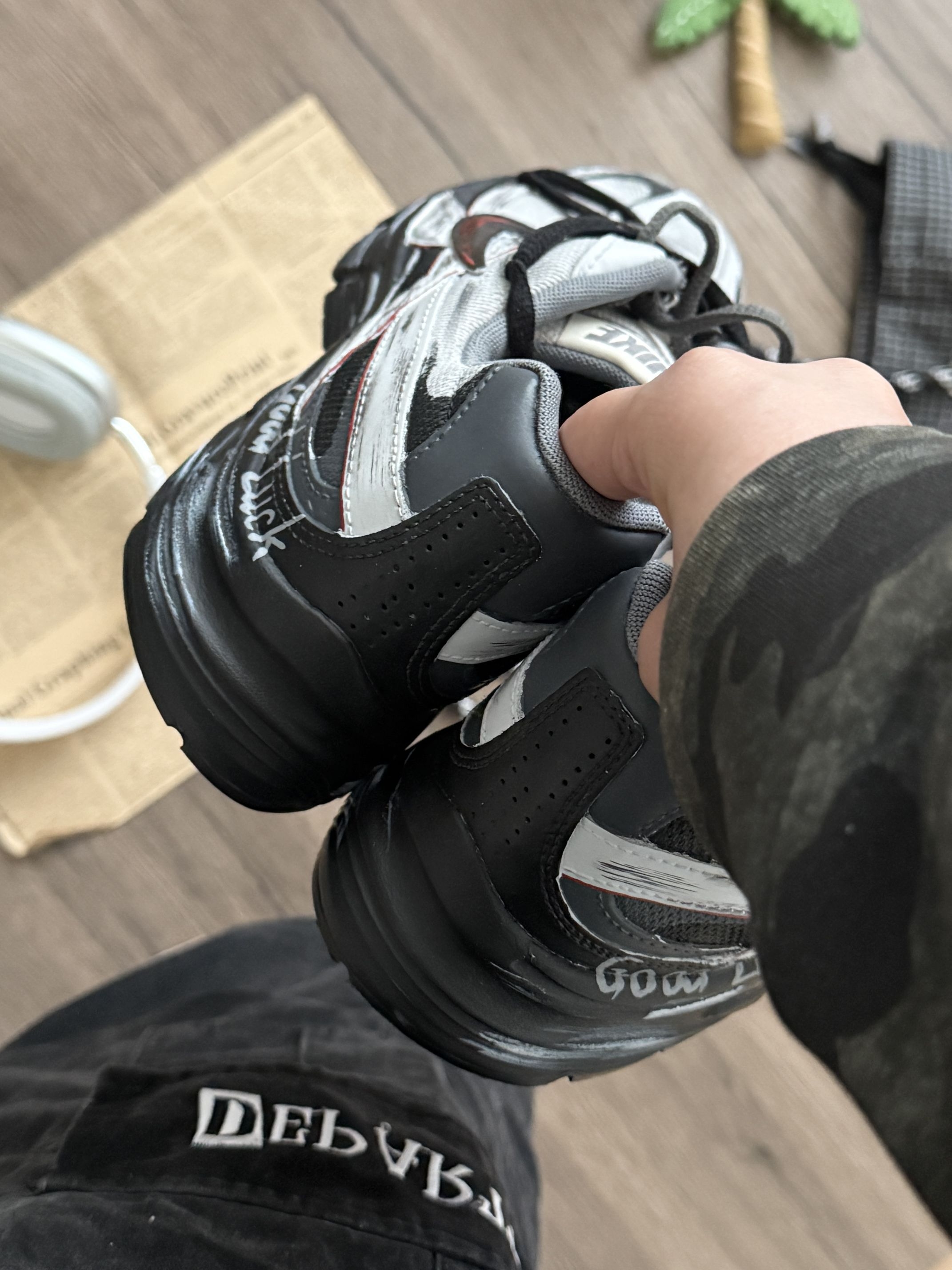 我这双鞋真的是我近期的穿搭本命鞋了! 首先颜值就很戳我,做旧的银灰黑配色,加上手写涂鸦感的细节,复古又有个性,不是那种烂大街的款,随便搭牛仔裤、工装裤都很有那味儿,出门回头率超高。 我穿上脚的脚感也完全在线,鞋底软乎乎的,走路久了也不会累脚,日常通勤、逛街穿一整天都没压力。鞋型是那种显脚小的老爹鞋款,还能悄悄增高,对小个子也很友好。 而且面料很耐造,网眼+皮革的组合,脏了擦一擦就干净,不用费心打理...