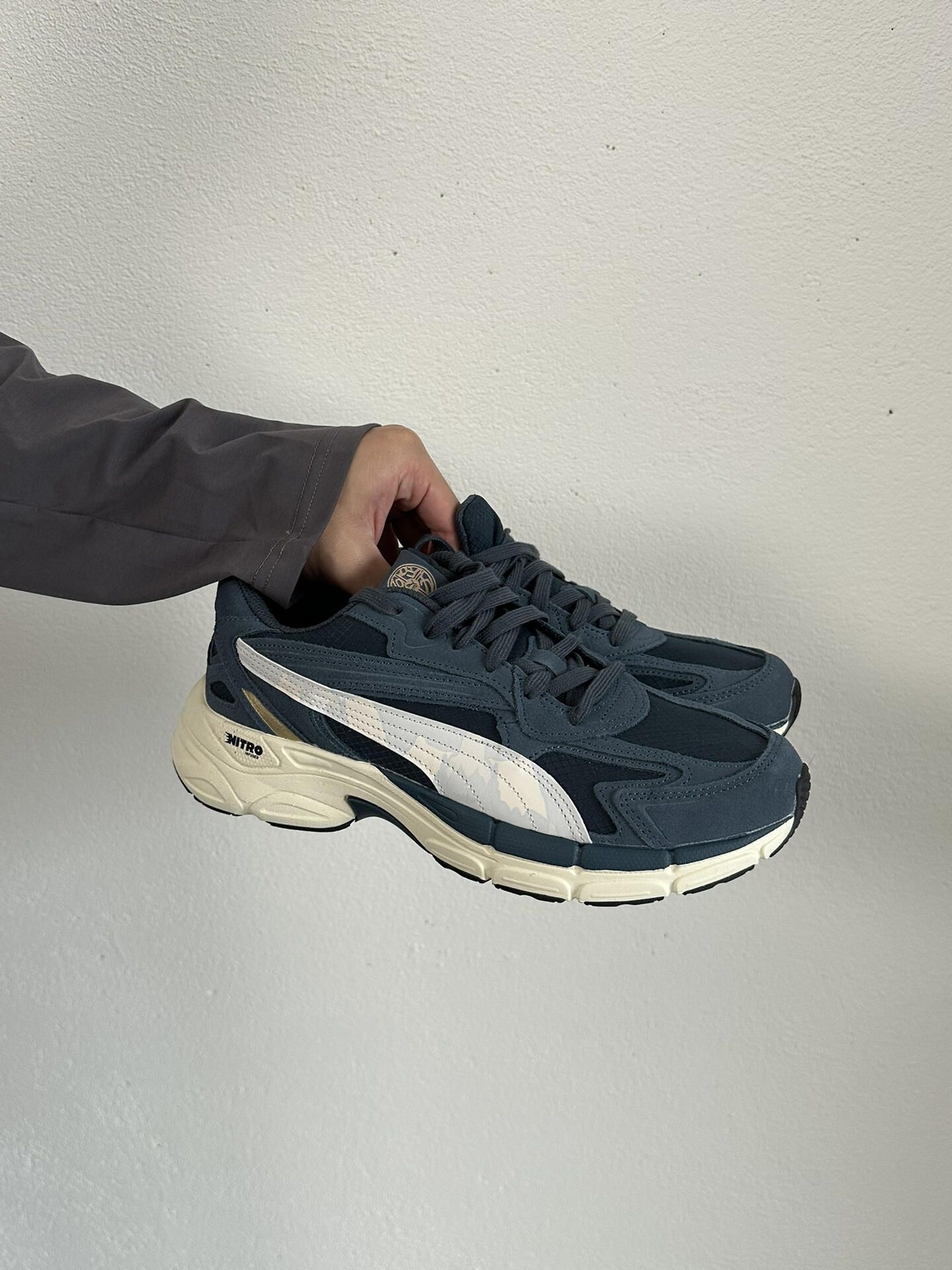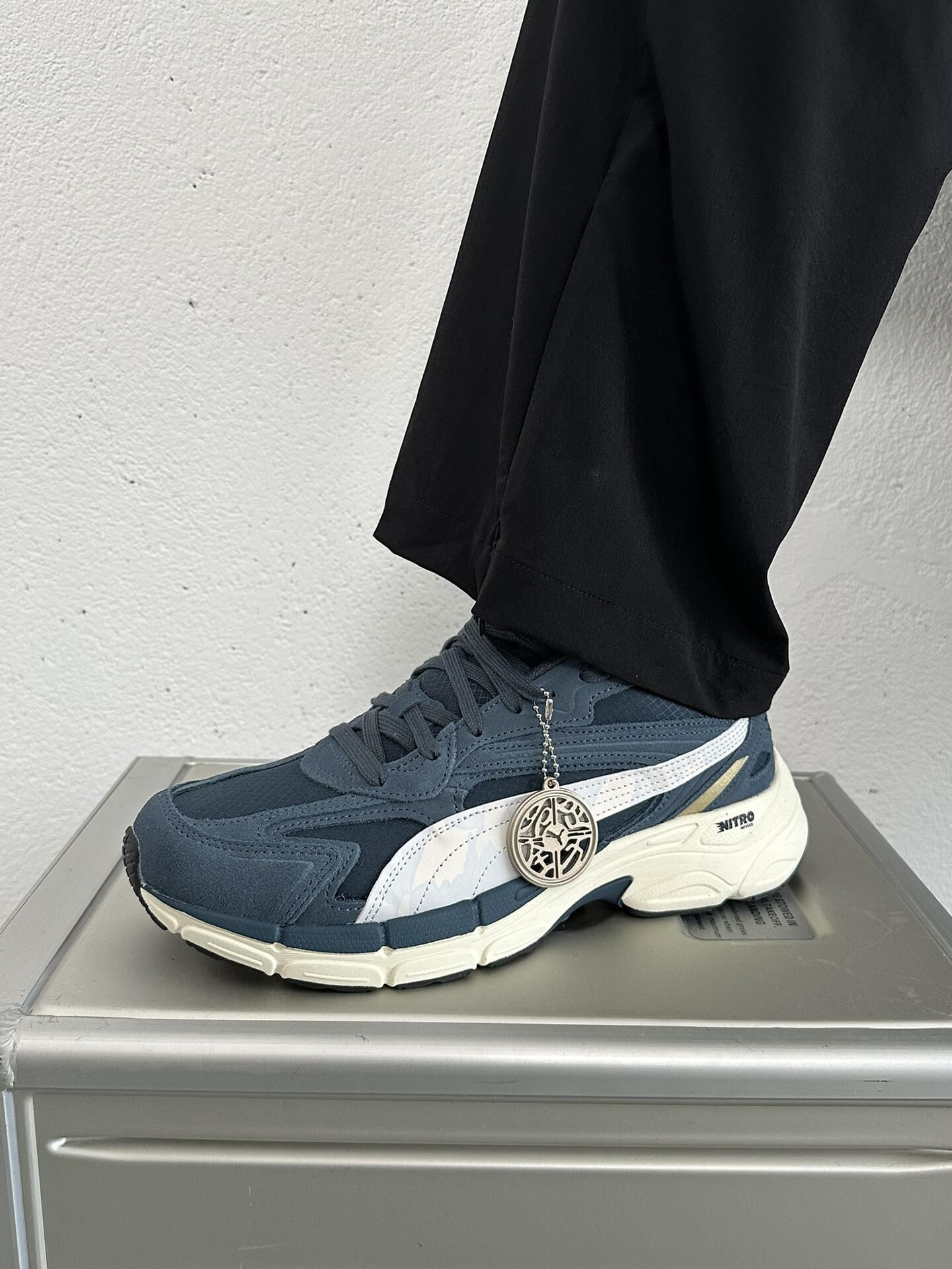 👟PUMA NITRO复古跑鞋,深蓝+白色拼接,织物+合成革材质,透气又耐穿!鞋侧有经典PUMA条纹,金属吊牌超有辨识度✨。NITRO泡棉中底,缓震舒适,日常穿搭或轻运动都OK。复古风设计,时尚又实用,尺码覆盖广,男女都能轻松驾驭!