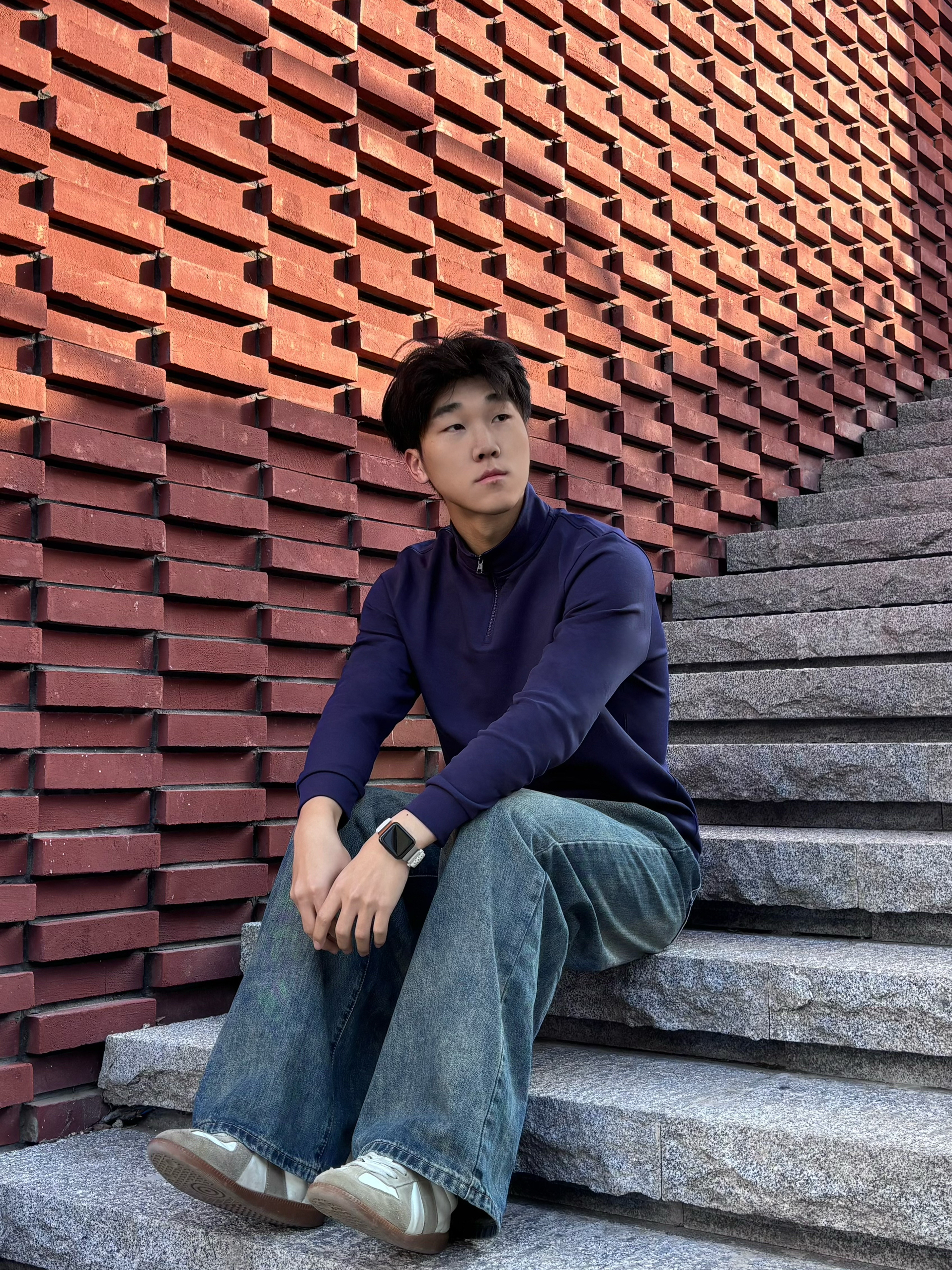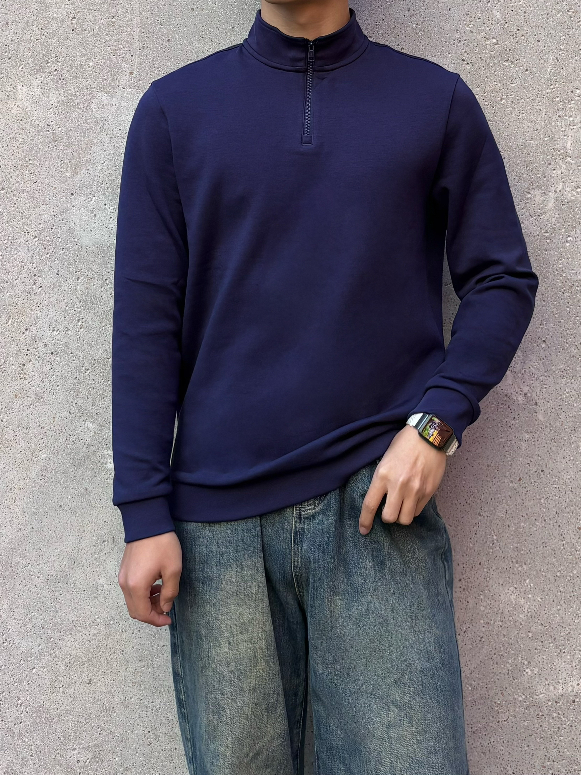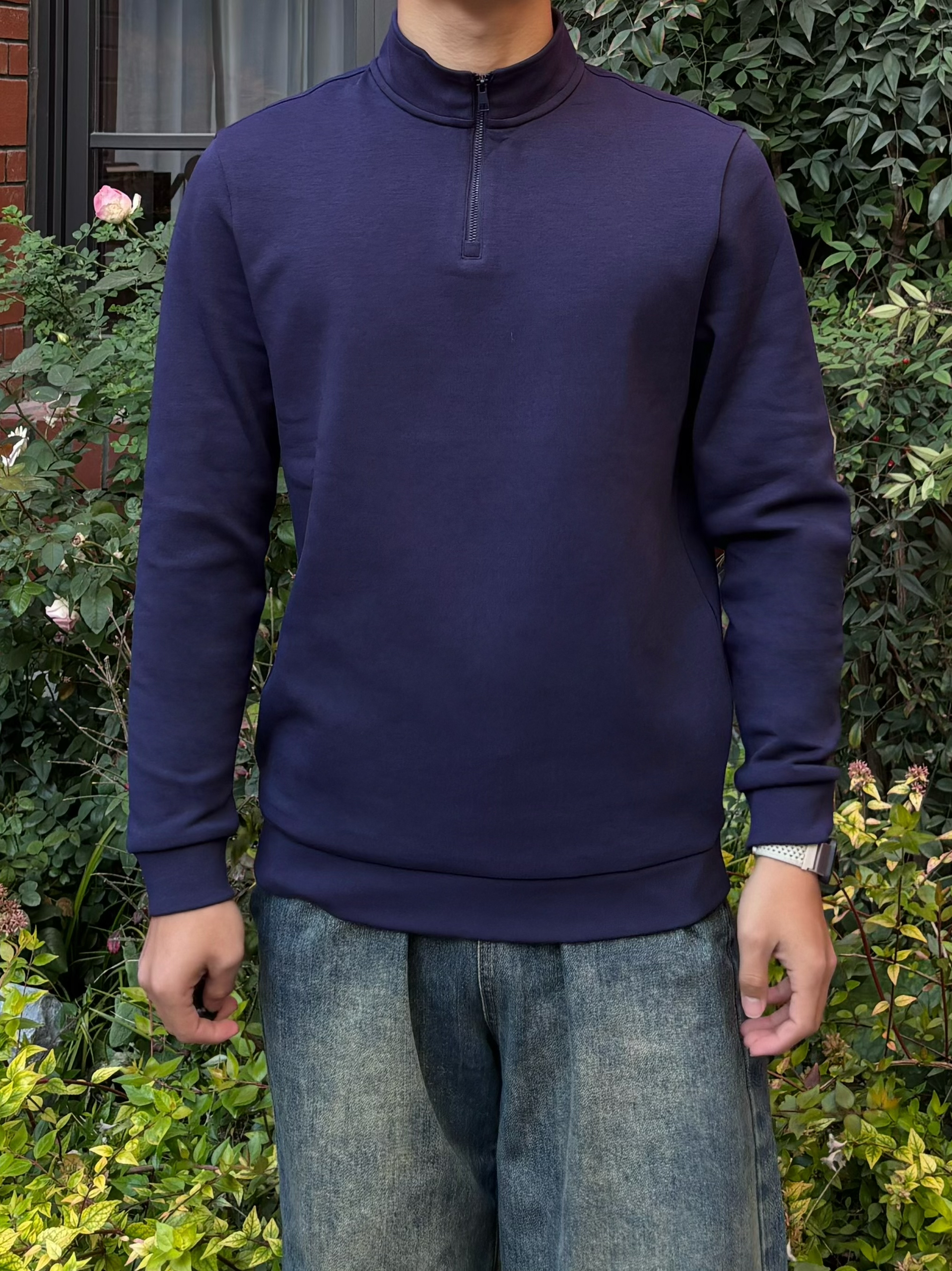 春天的松弛感,是把红砖台阶当座椅,把随性焊在身上 这件藏青色半拉链上衣,打破了基础款的沉闷,半开领的设计精致又不失利落,面料软糯有质感,在光影里显得特别沉稳。搭配做旧水洗的阔腿牛,脚下是复古德训鞋,整个人的气质一下就“野”了起来 不用刻意追求花哨,这种沉稳中带点随性的穿搭,才是春天里最舒服的状态。把春天踩在脚下,随性去野,自在出发