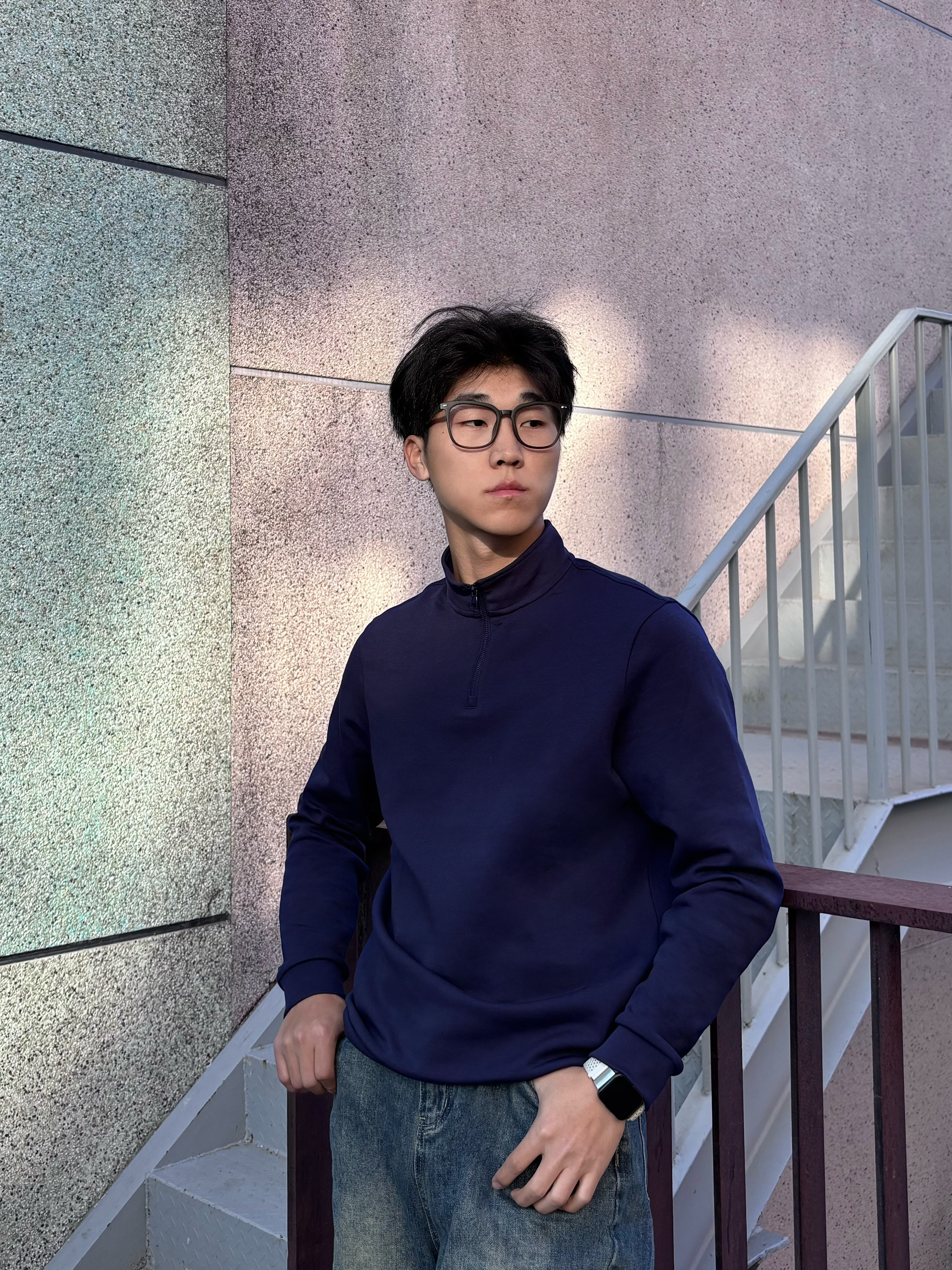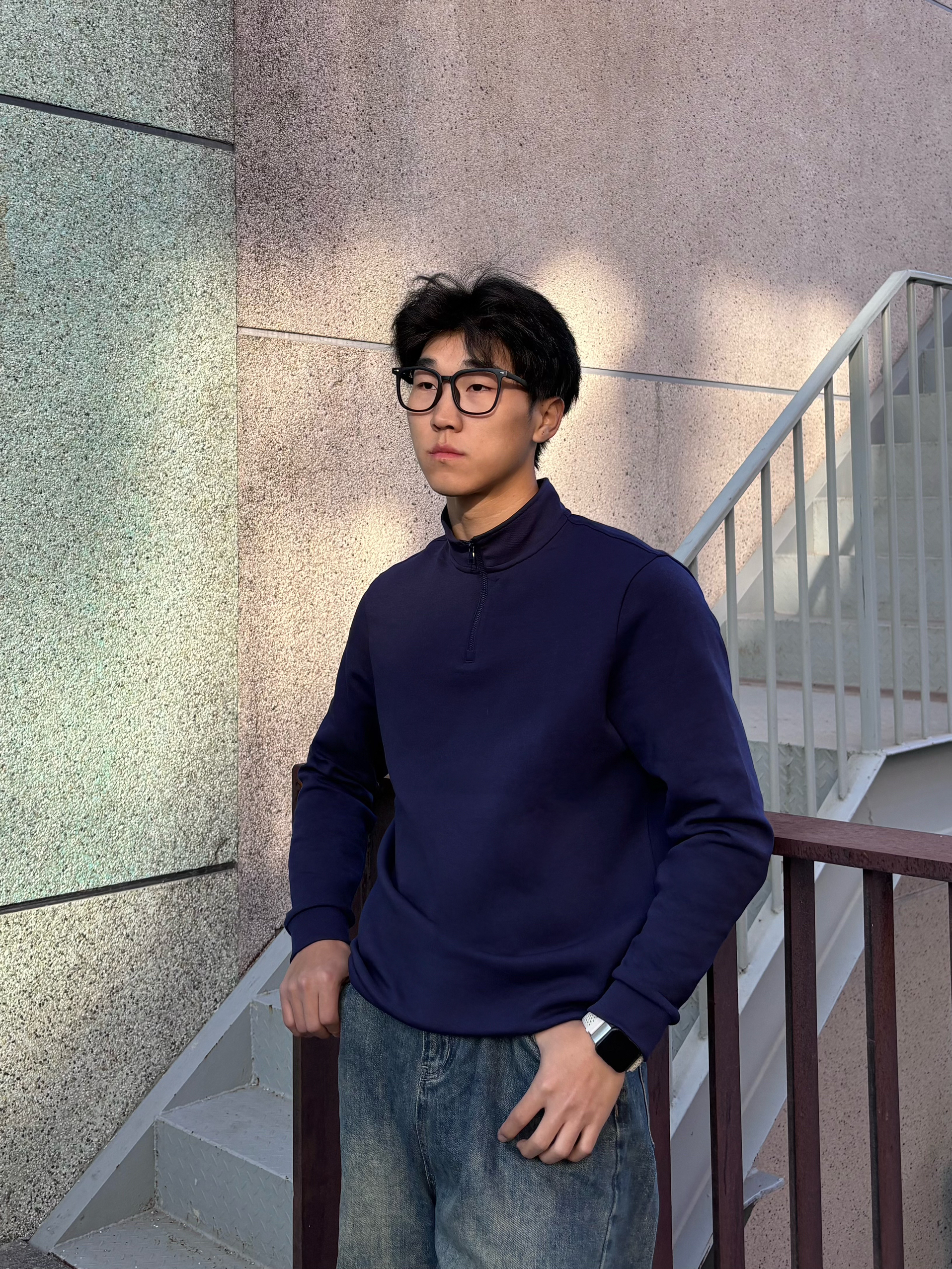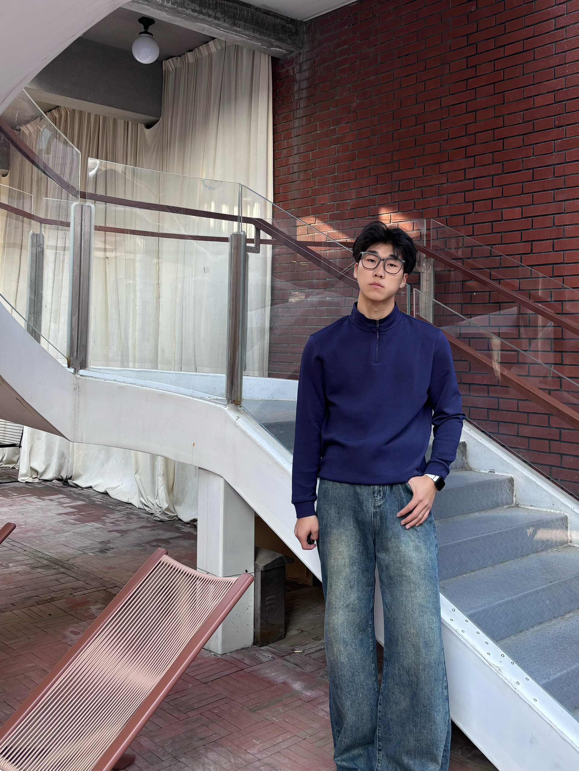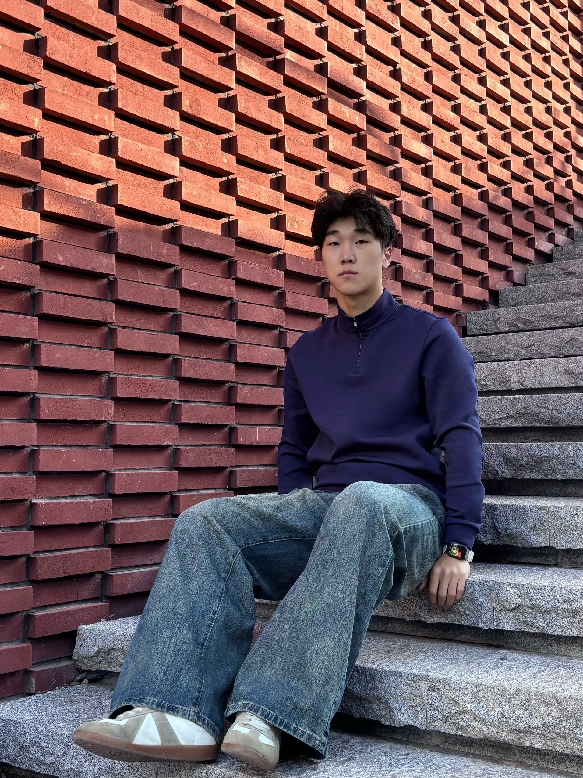 春天的松弛感,是把红砖台阶当座椅,把随性焊在身上 这件藏青色半拉链上衣,打破了基础款的沉闷,半开领的设计精致又不失利落,面料软糯有质感,在光影里显得特别沉稳。搭配做旧水洗的阔腿牛,脚下是复古德训鞋,整个人的气质一下就“野”了起来 不用刻意追求花哨,这种沉稳中带点随性的穿搭,才是春天里最舒服的状态。把春天踩在脚下,随性去野,自在出发