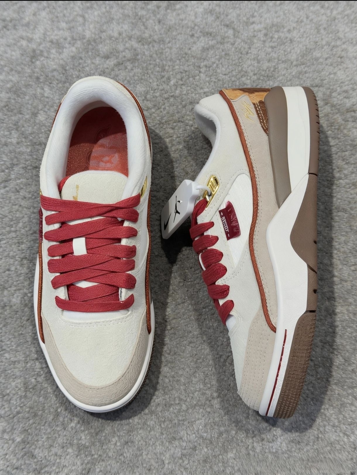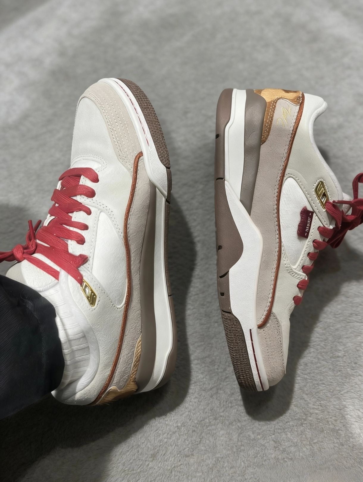 今日到手马年限定复古篮球鞋,米白加上酒红的配色很有复古年味,鞋面麂皮的材质让整双鞋显得很有质感,中底的软硬也很适中,日常行走通勤都不会累脚,而且鞋身上还挂有金属吊坠,设计的很到位,真的是一双不错的鞋款