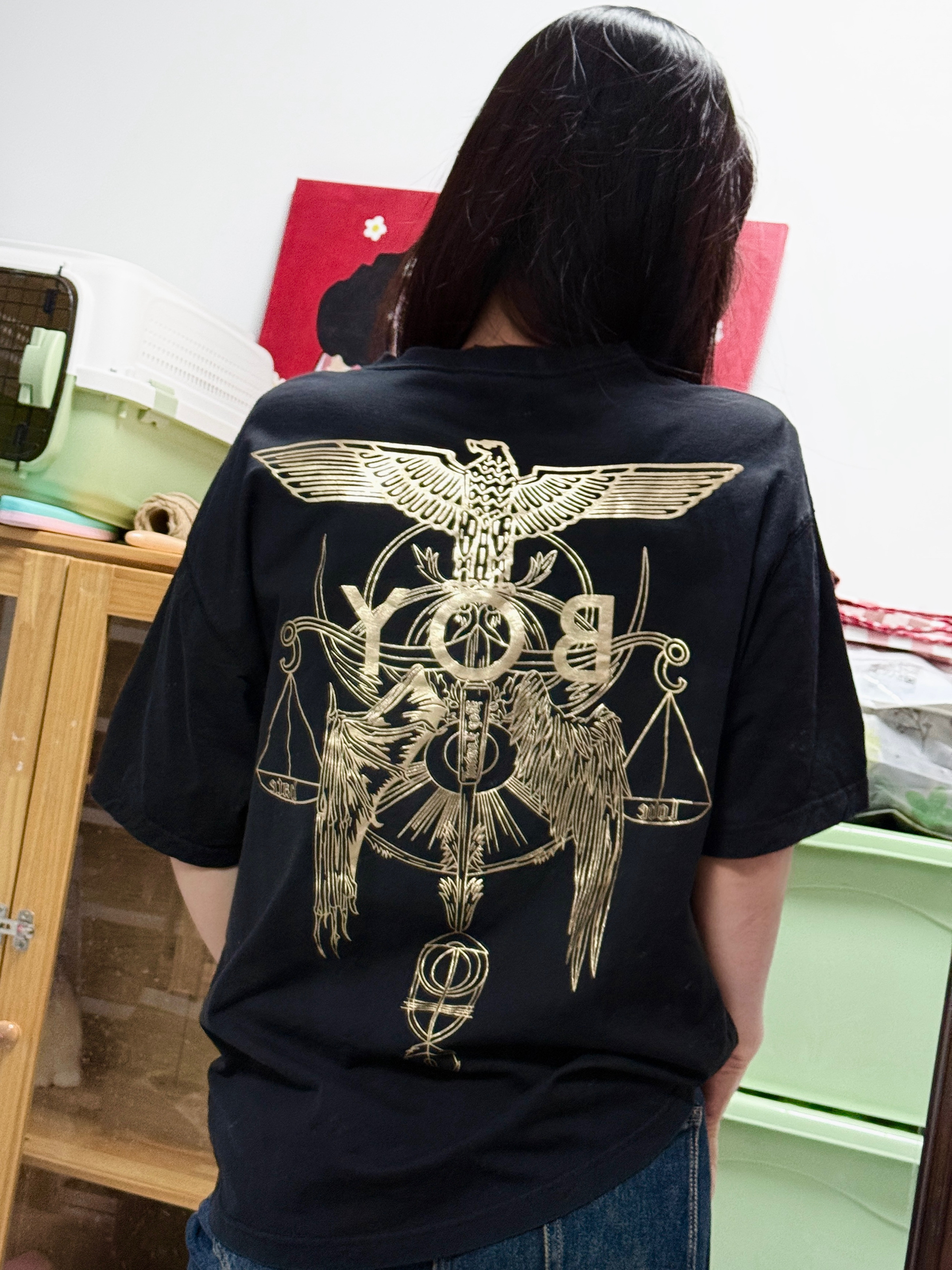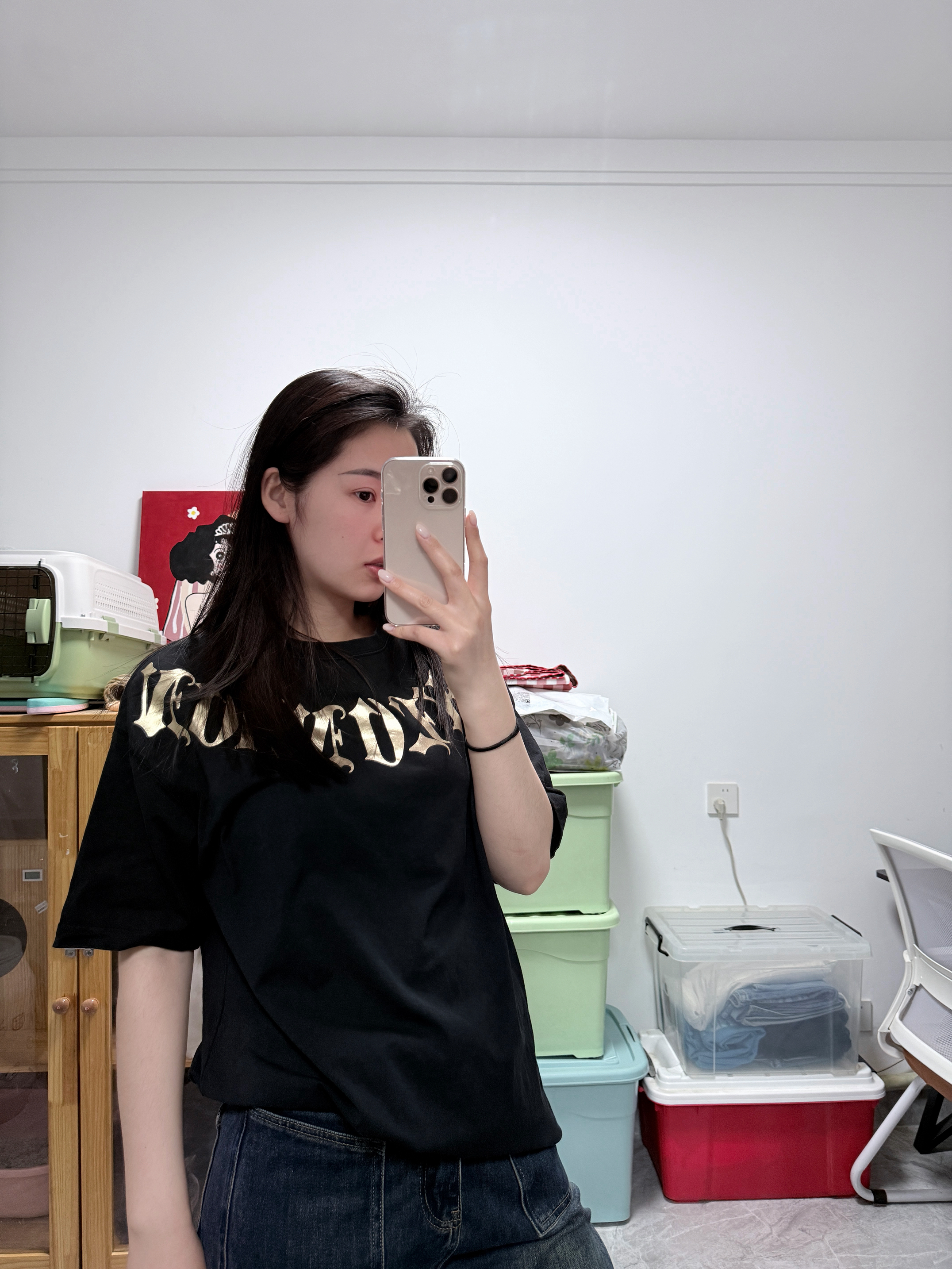 谁懂啊!这件黑底烫金字母短袖真的太戳我了! 宽松落肩版型对孕期/微胖身材超友好,完全不挑身材,藏肉显瘦一绝~ 烫金哥特字母做旧感拉满,美式复古那味儿直接拿捏,单穿就很有气场,搭牛仔裤、运动裤都超绝! 纯棉面料软乎乎的,贴身穿巨舒服,日常出街、居家穿都合适,百搭不挑人,闭眼入不亏!