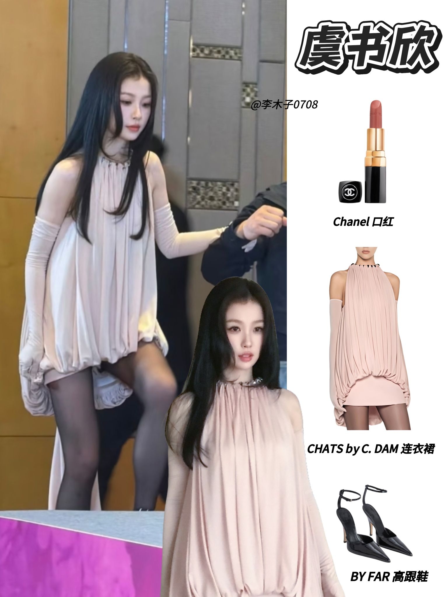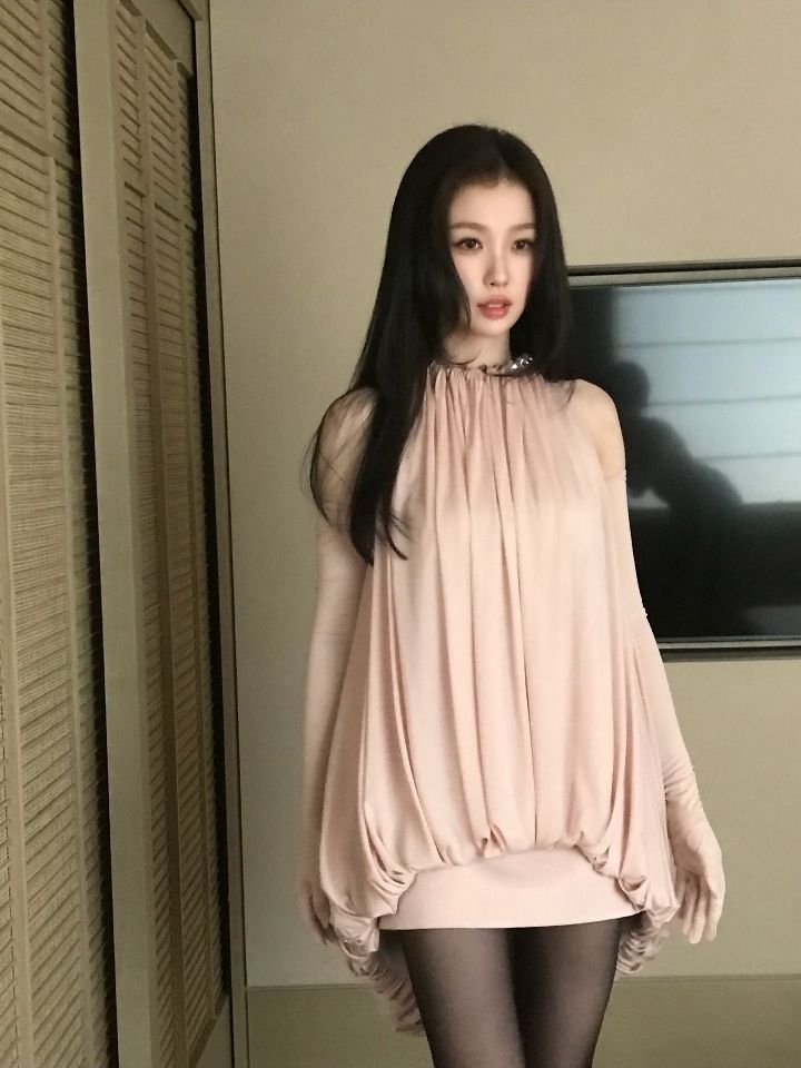 裸粉色挂脖花苞裙,垂坠感满分的褶皱面料+同色系长手套,松弛又精致,下衣失踪的设计搭配黑丝,纯欲感满满,谁看了不迷糊!