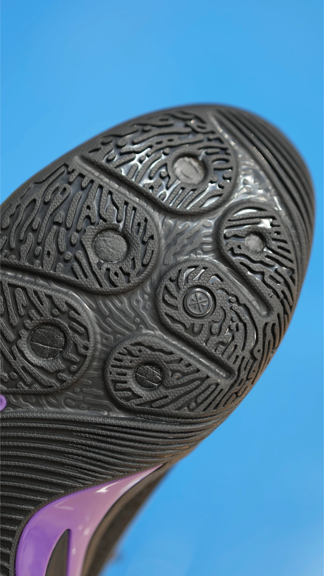 今天穿这双DLO2打了一下午,有点东西,赶紧码一段! 我脚下这个是“门徒”配色,拉塞尔致敬科比的。鞋面那种鳞片的感觉若隐若现,侧面那个蝴蝶TPU还在,但这次线条更利落一点。后跟还有蛇缠绕的logo,小细节很多! 然后打球的感觉!我今天打的是半场4v4,最明显的一点就是起步那一步特顺!二代鞋底的槽开的更深,而且是全掌开。你往前蹬的时候,鞋底弯得很自然,我做了几次变向,脚底下没有那种“卡一下...