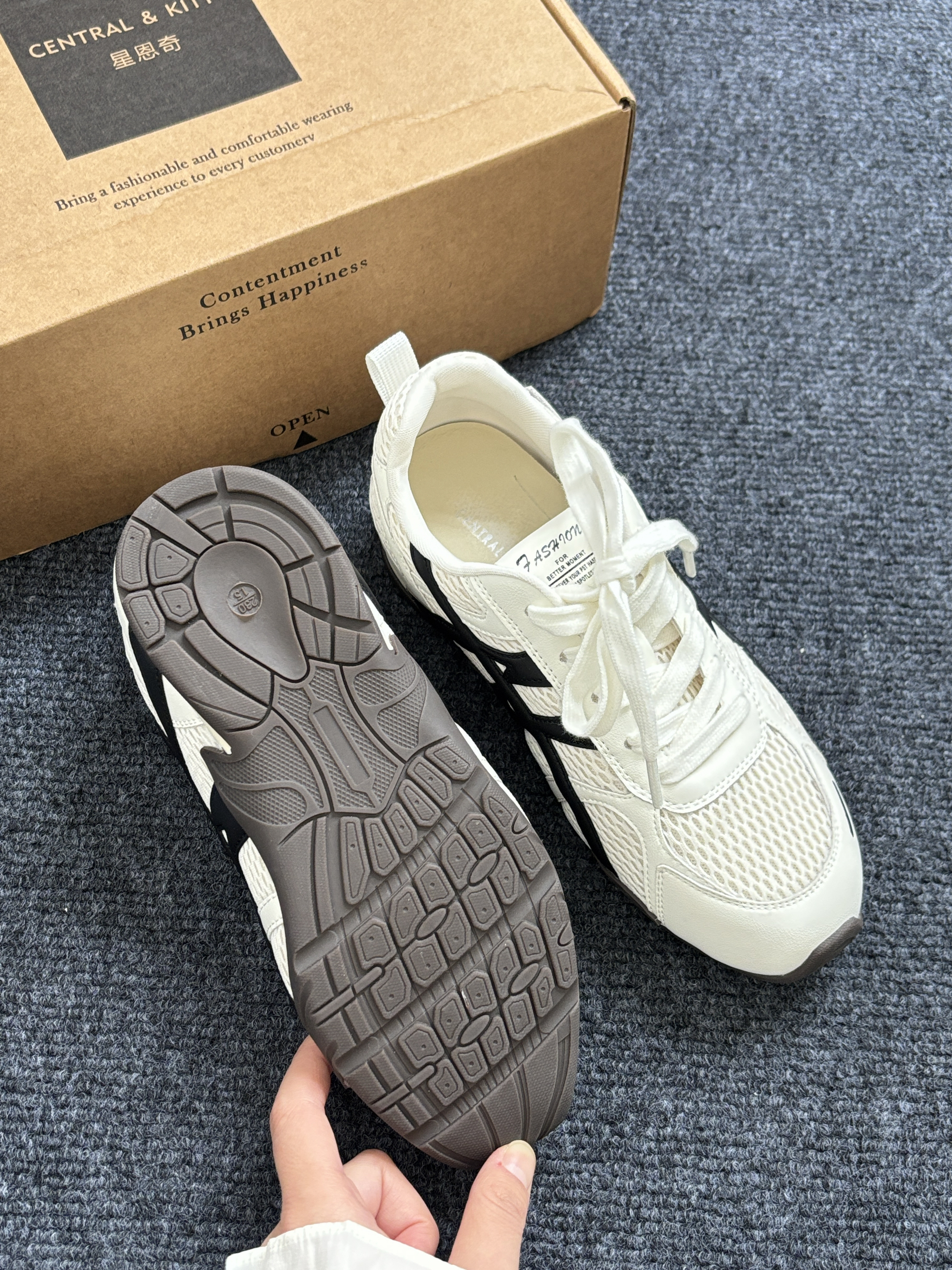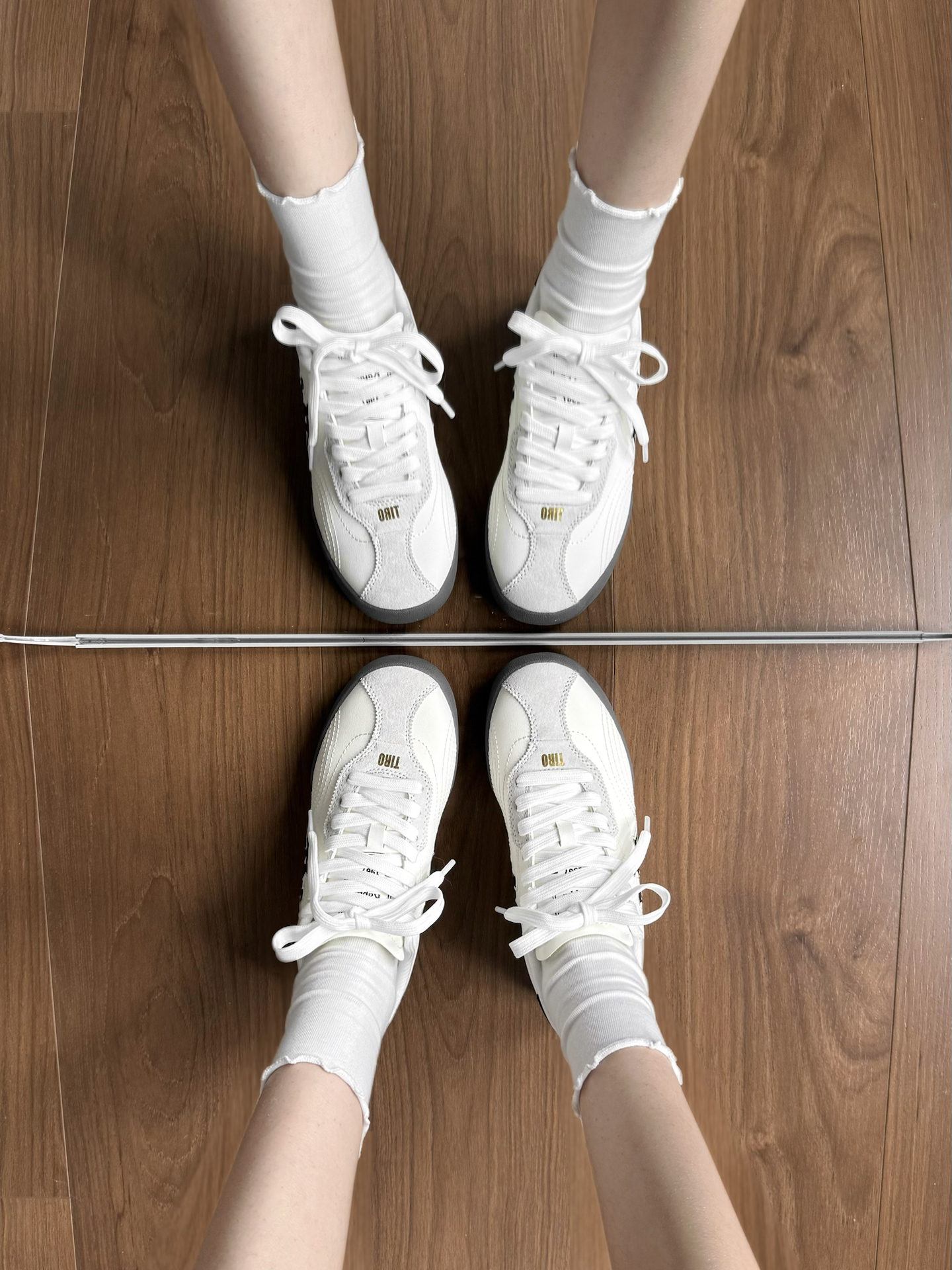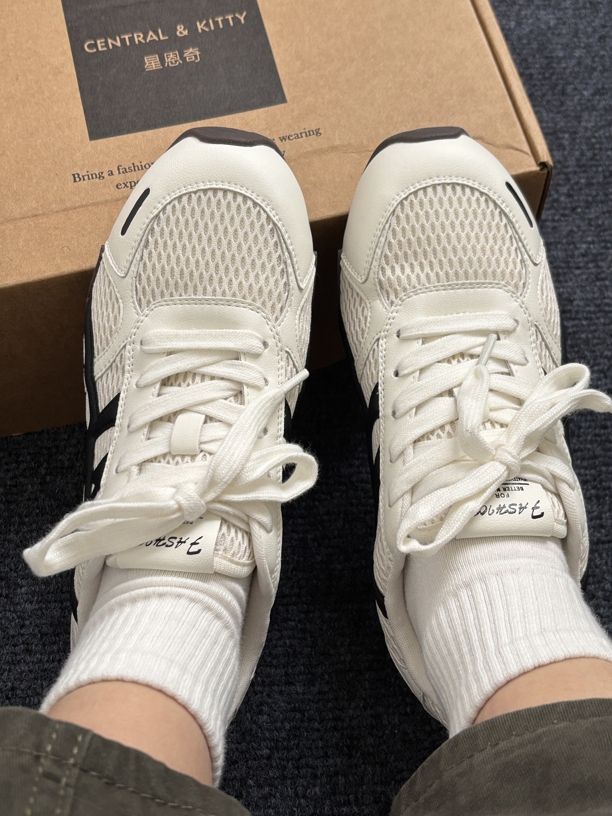 我现在是越来越喜欢简单好穿的东西了 主打一个实用主义派哈哈✌️ 这双 CENTRAL&KITTY 德训鞋就挺不错的 简单的黑白配色 通勤、约会穿都很适配~ 鞋面是网布+皮革拼接透气不闷脚 鞋子整体走线工整细节做工也挺到位👌 侧面的经典条纹Logo辨识度高不浮夸还挺好看✅ 鞋子上脚软软弹弹的很舒服不累脚😌 走路也很稳,越穿越舒服~
