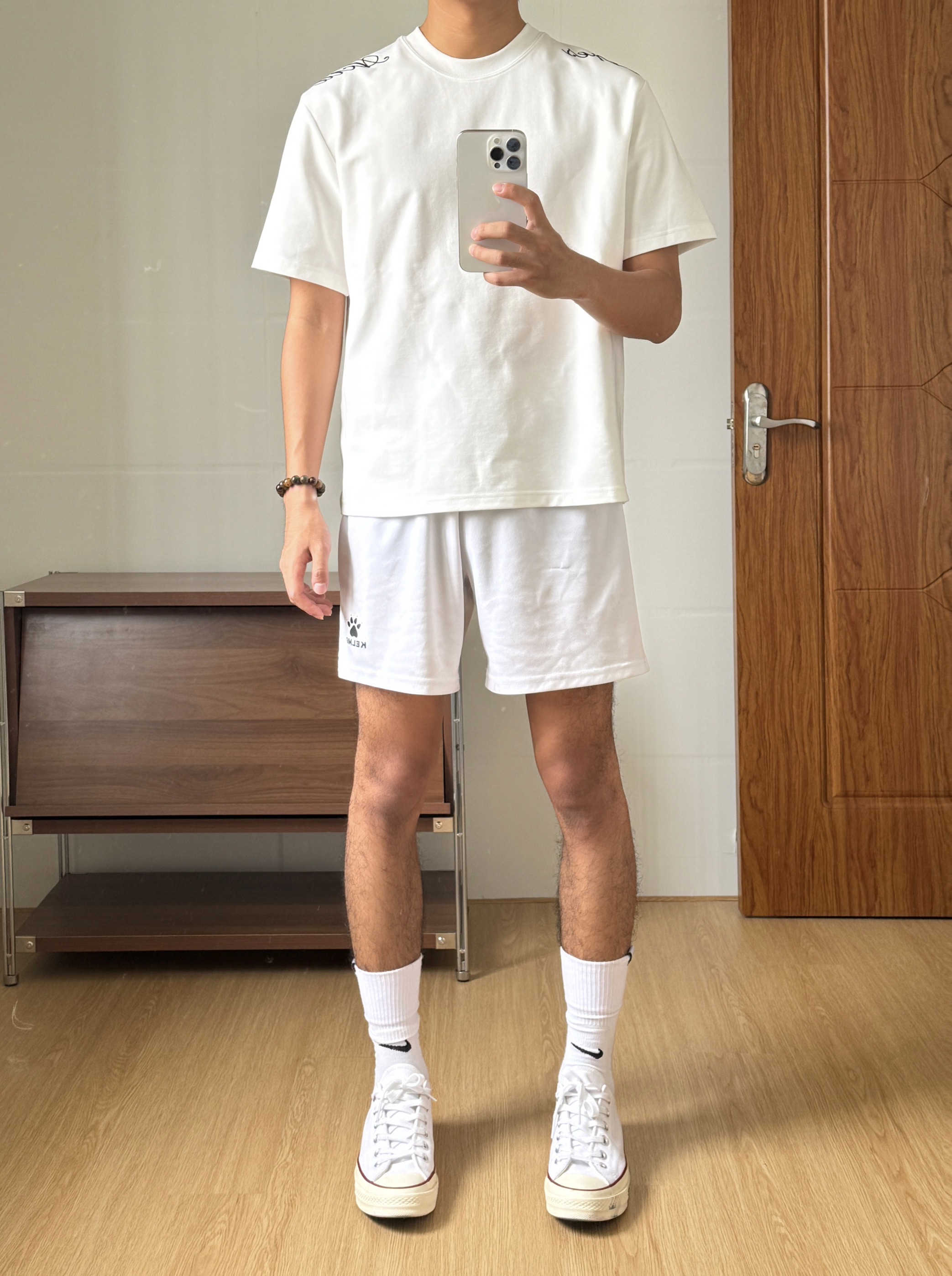 谁能拒绝一套从头到脚的纯白穿搭啊!真的太戳清爽感了✨ 基础款白T+同色系运动短裤,简约到极致就是高级,宽松版型不挑身材,日常穿舒服到不想脱下来。 搭配中筒白袜+经典帆布鞋,少年感直接拉满,手腕上的手串又添了一丝细节感,整套干净又利落,完全是夏日男生穿搭的标准答案! 不管是出门约会还是日常通勤,这套都能轻松拿捏,清爽不油腻,自带阳光少年感☀️