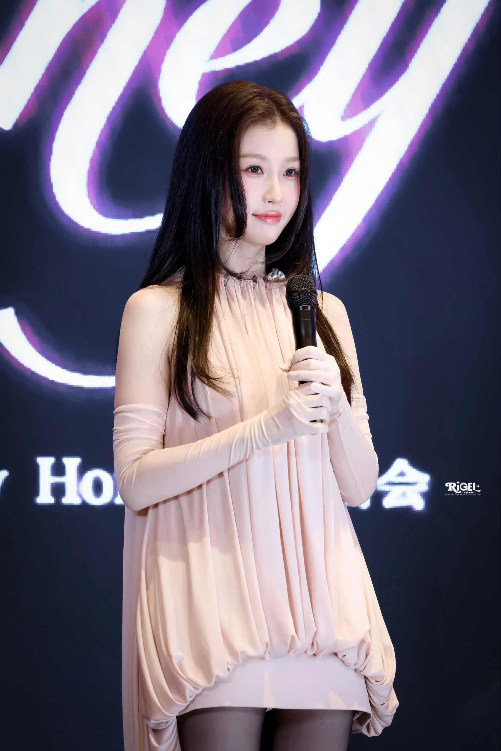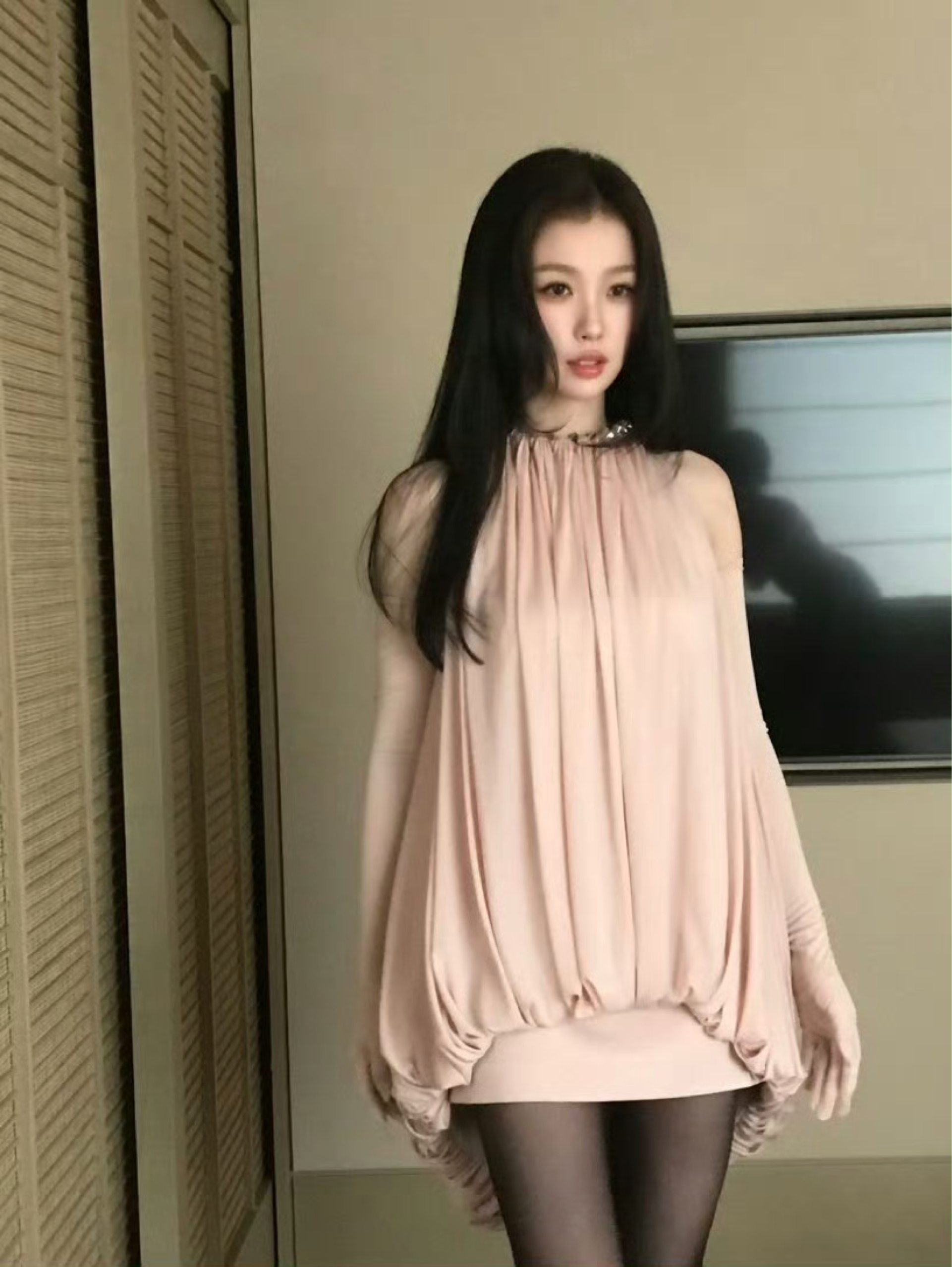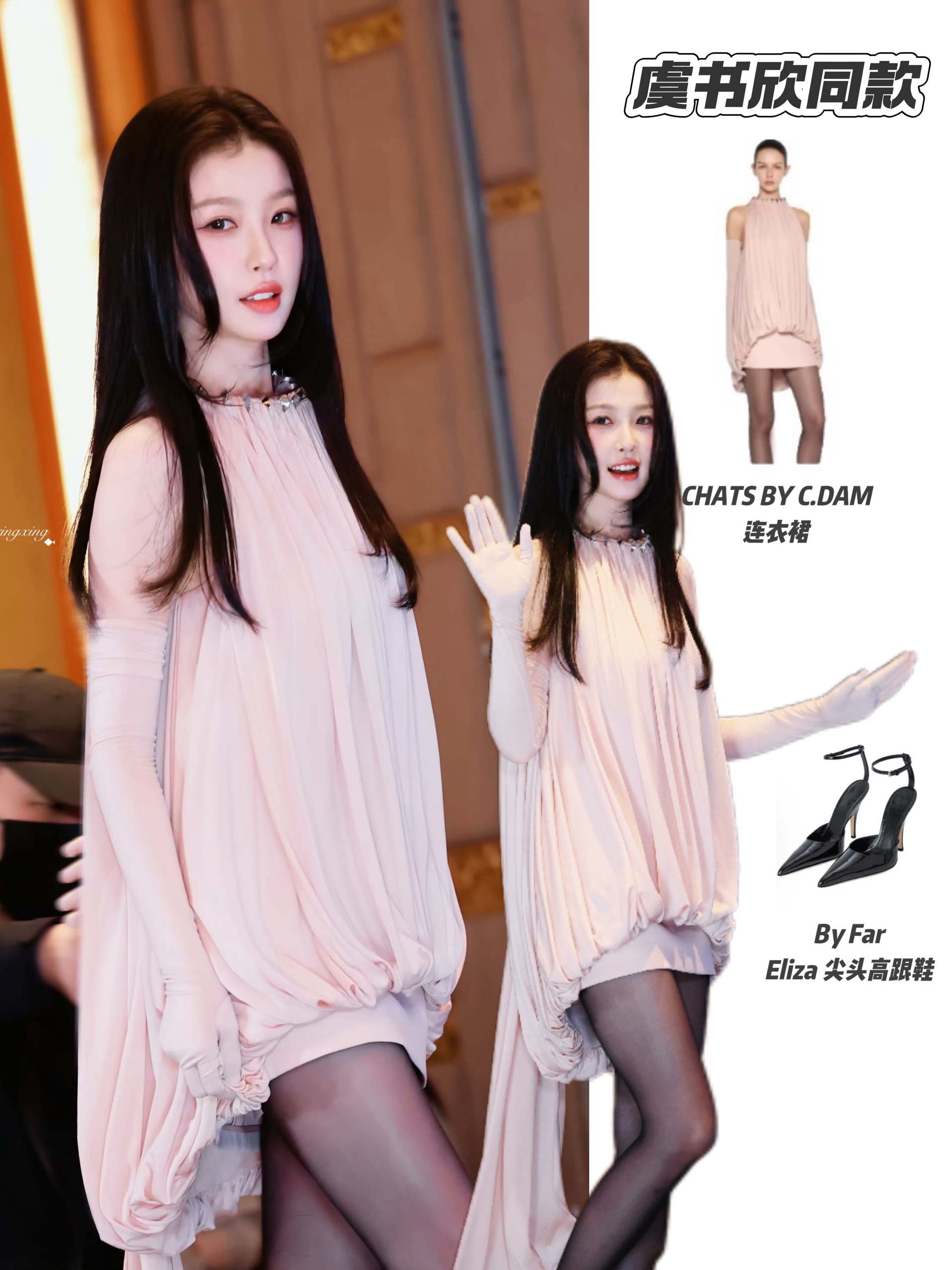 虞书欣这件裸粉色挂脖花苞裙自带柔雾氛围感,垂坠感拉满,不规则下摆灵动又显比例,搭配同色系长手套,温柔又贵气。 黑丝+尖头高跟经典又性感,甜酷平衡得刚刚好,妥妥的春日氛围感女神穿搭,开春穿直接美出圈!