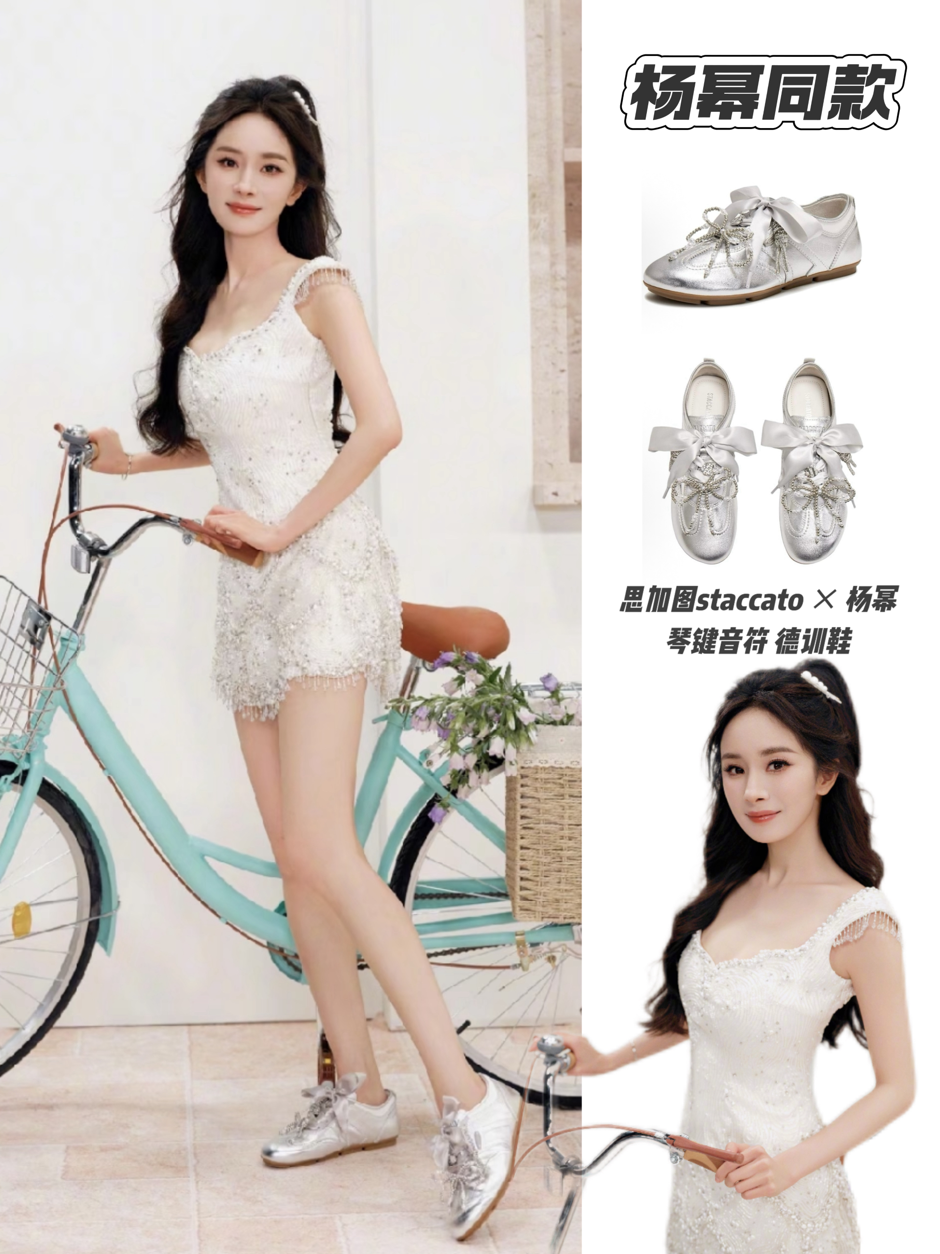 杨幂这套穿搭完全女大👩🏻白色亮片短裙自带温柔氛围感,甜而不腻,最绝的是思加图这款琴键音符德训鞋!银色鞋面+蝴蝶结水钻设计,把甜酷感拉满,打破裙装的柔媚,休闲又精致,上脚显腿长,妥妥的春日穿搭神助攻,明星同款直接焊在脚上!