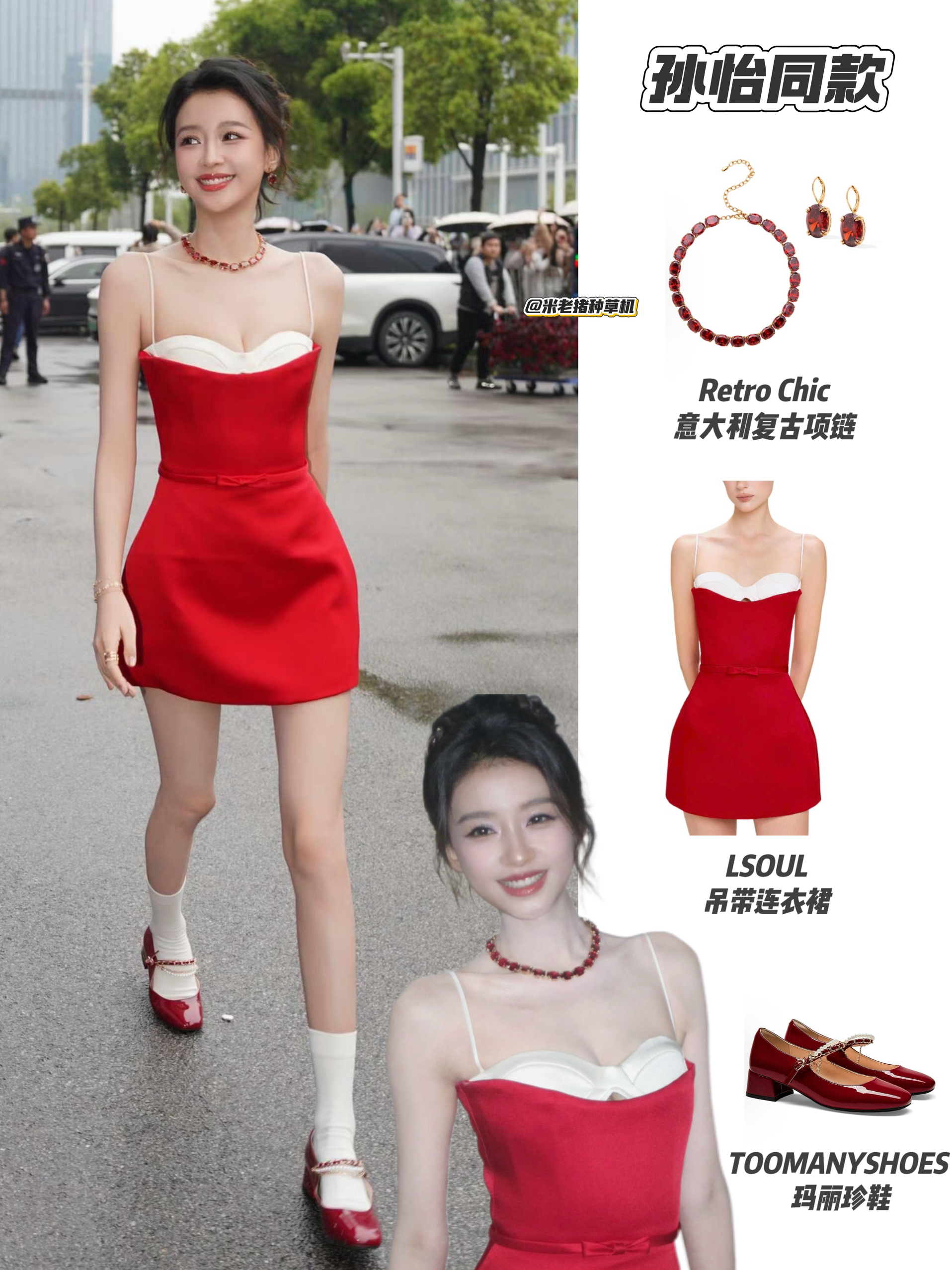 孙怡浪姐路透这套造型美疯了!红白撞色吊带短裙超显白,收腰设计直接掐出蚂蚁腰,大秀美腿。 复古红宝项链+玛丽珍鞋+白袜,甜辣感拉满,复古又灵动,明艳又减龄,一整个明艳大美女既视感~