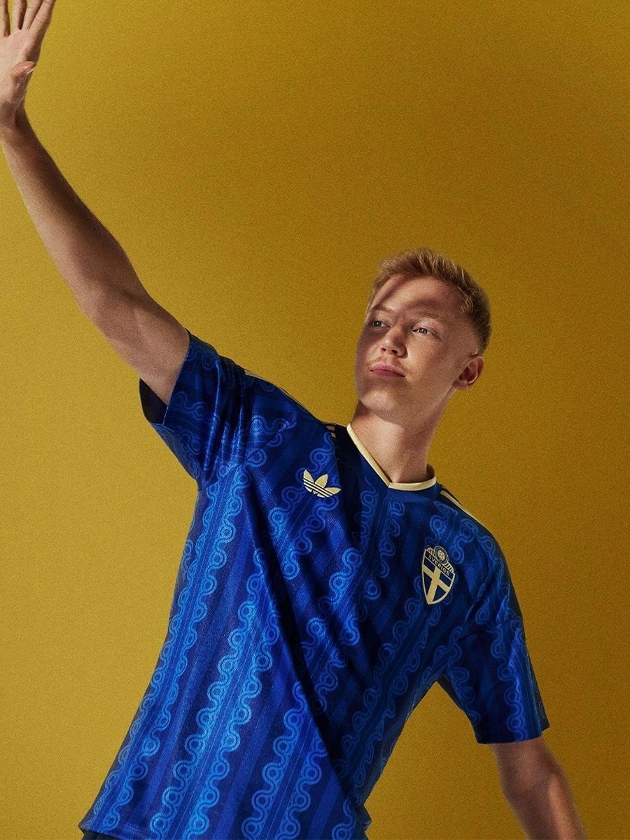 瑞典全新客场球衣的设计灵感,深植于上世纪 70 年代的几何图形美学。三种不同明度的瑞典蓝交相融合,构筑出极具视觉冲击力的全幅图案,以此致敬瑞典深厚的文化遗产与设计传统。作为现代审美的点睛之笔,后领处以现代字体呈现“Sverige(瑞典)”字样。这种复古韵味与先锋设计的巧妙共振,不仅唤醒了经典的记忆,更为当代球迷呈现出焕然一新的感官体验。