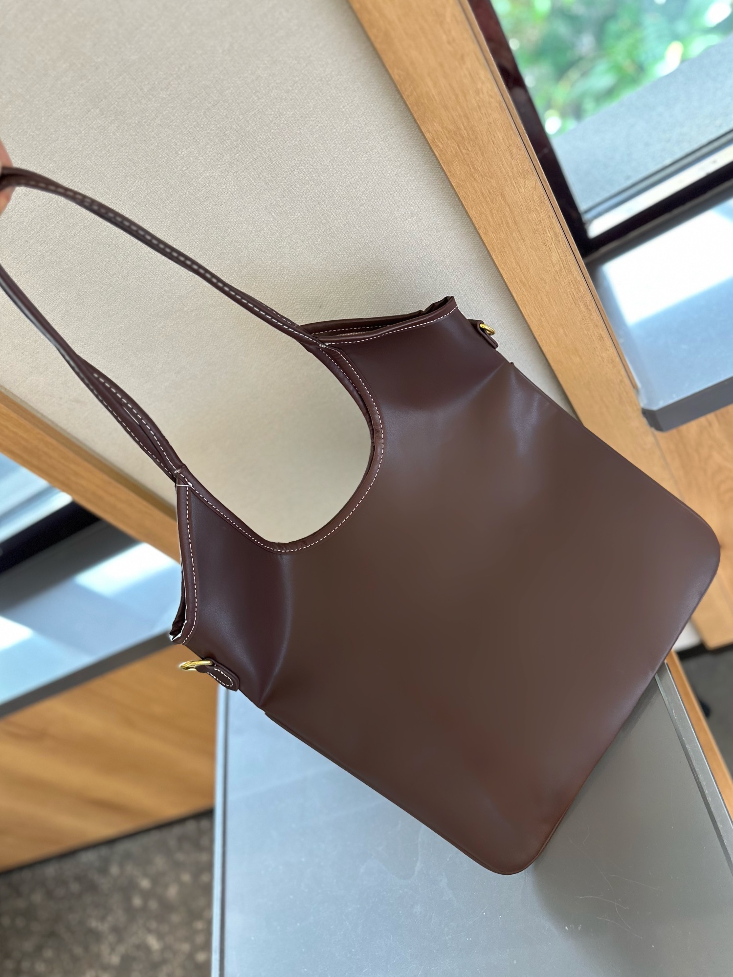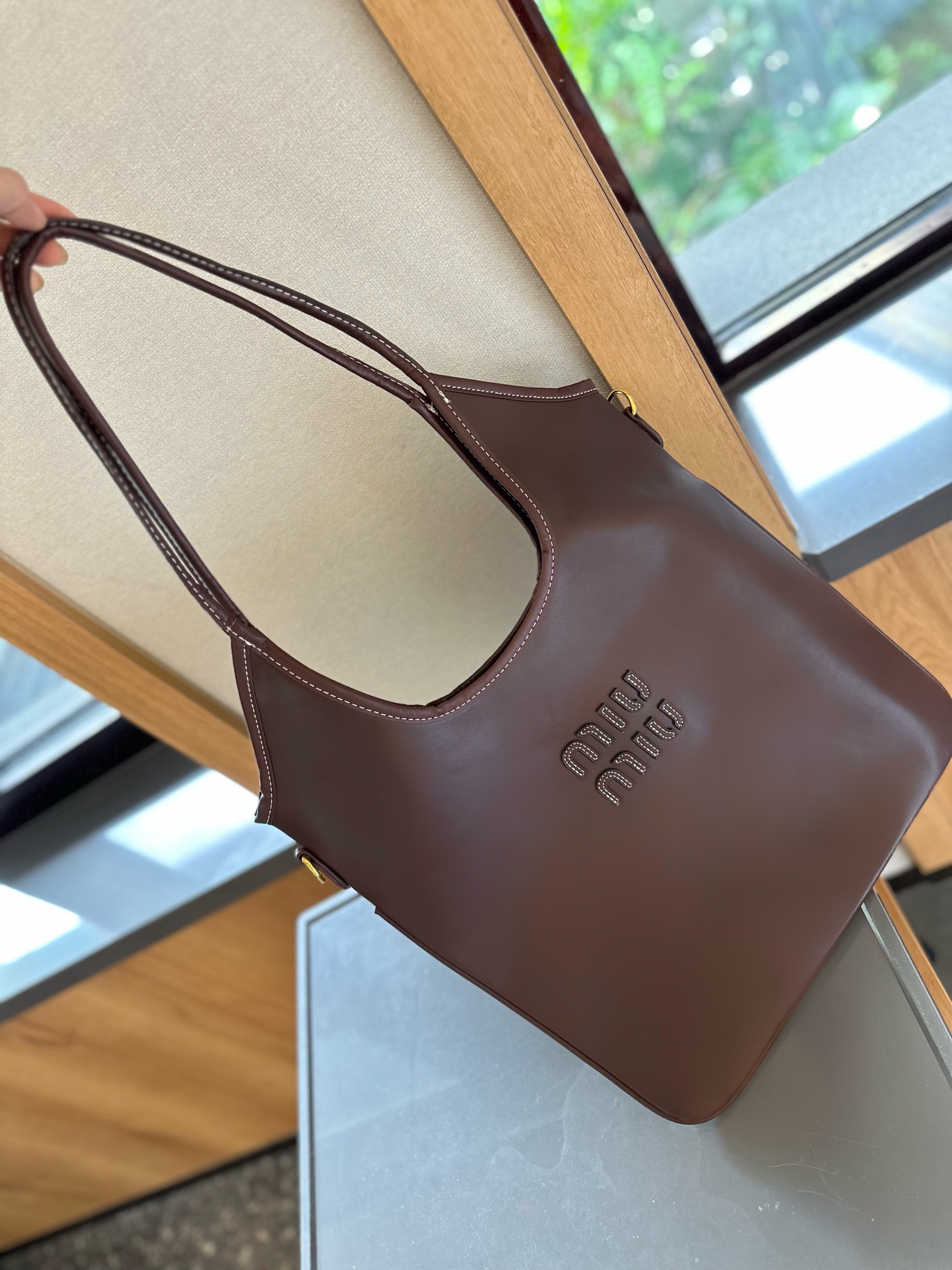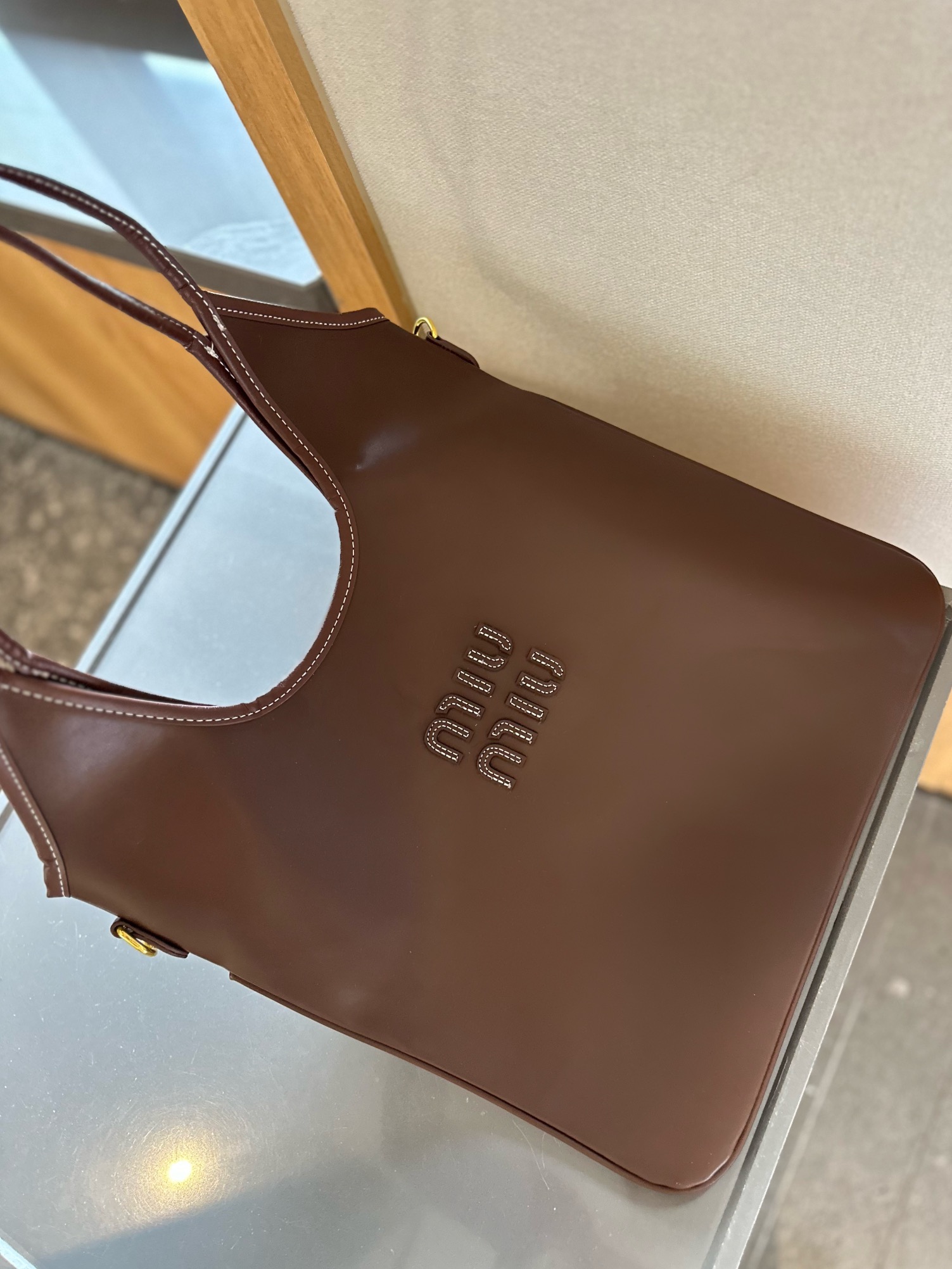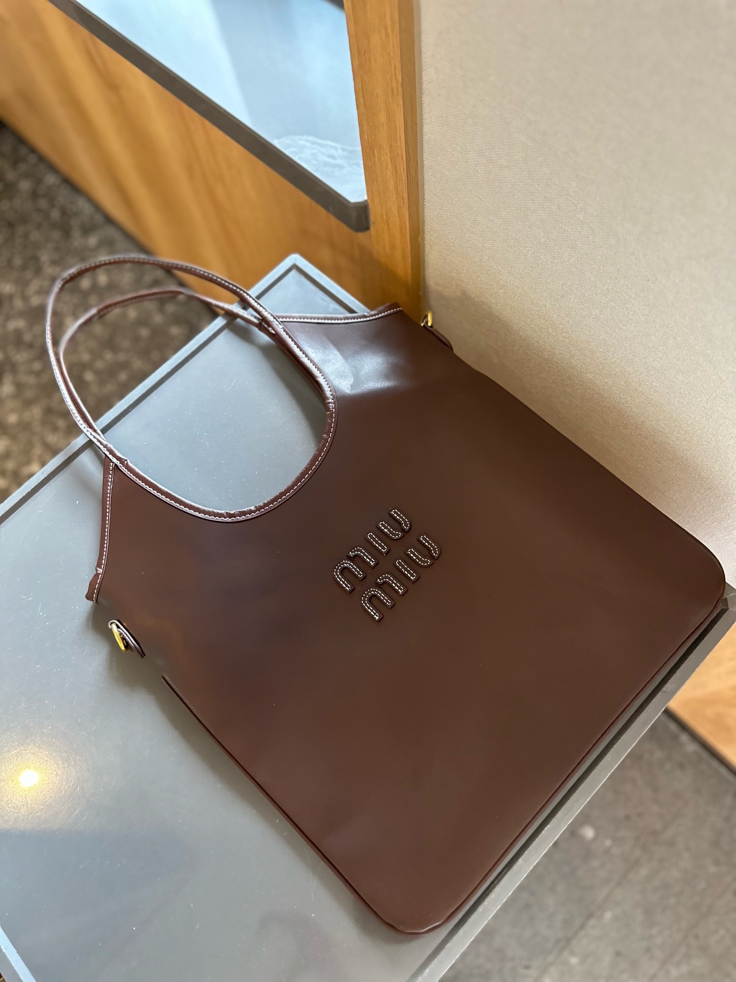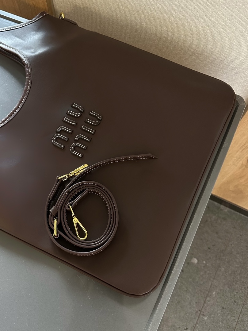 终于等到!miumiu Ivy托特包到手啦~ 真的实物比图片还要美!😭 这个深巧克力色真的超级显贵气,像把秋天的氛围感背在了身上。 ✨版型:软而不塌的皮质,托特包的容量日常通勤完全OK,装电脑、水杯都轻松。 ✨细节:白色明线+经典刺绣Logo,复古感直接拉满。 不管是搭风衣还是卫衣,氛围感瞬间拿捏。姐妹们这波真的可以冲!
