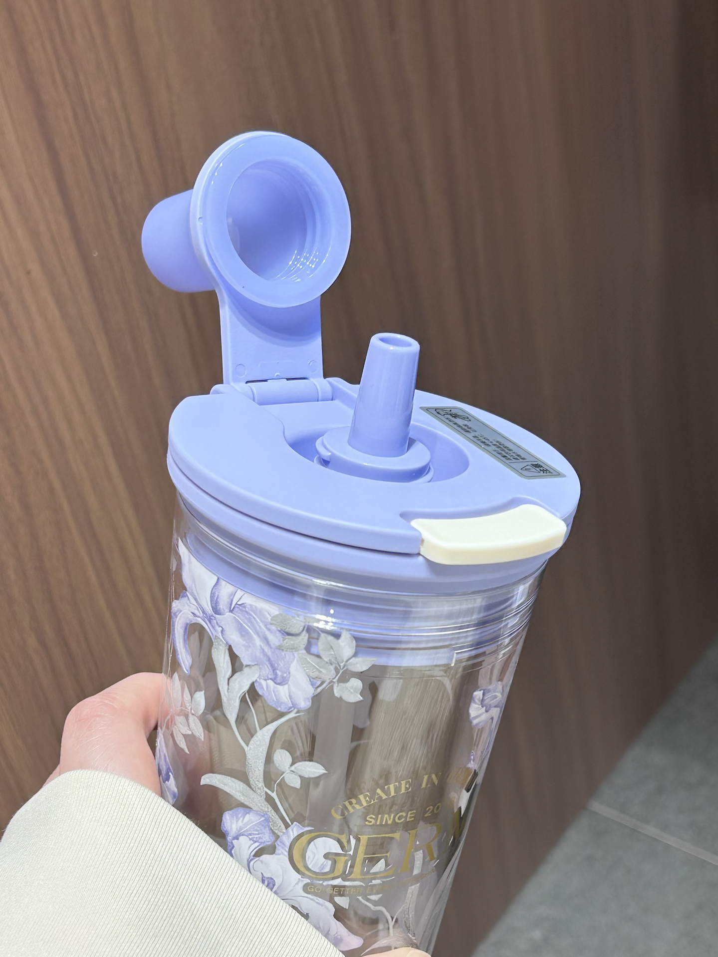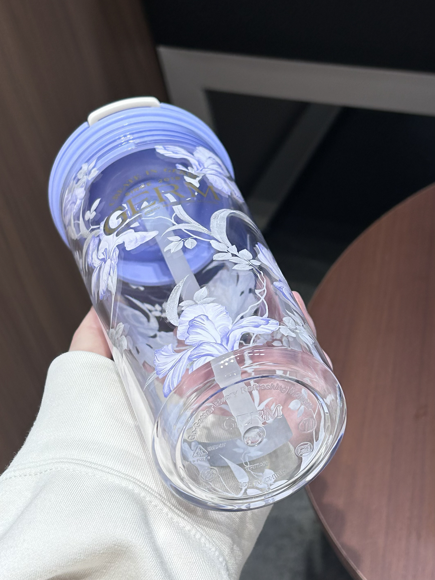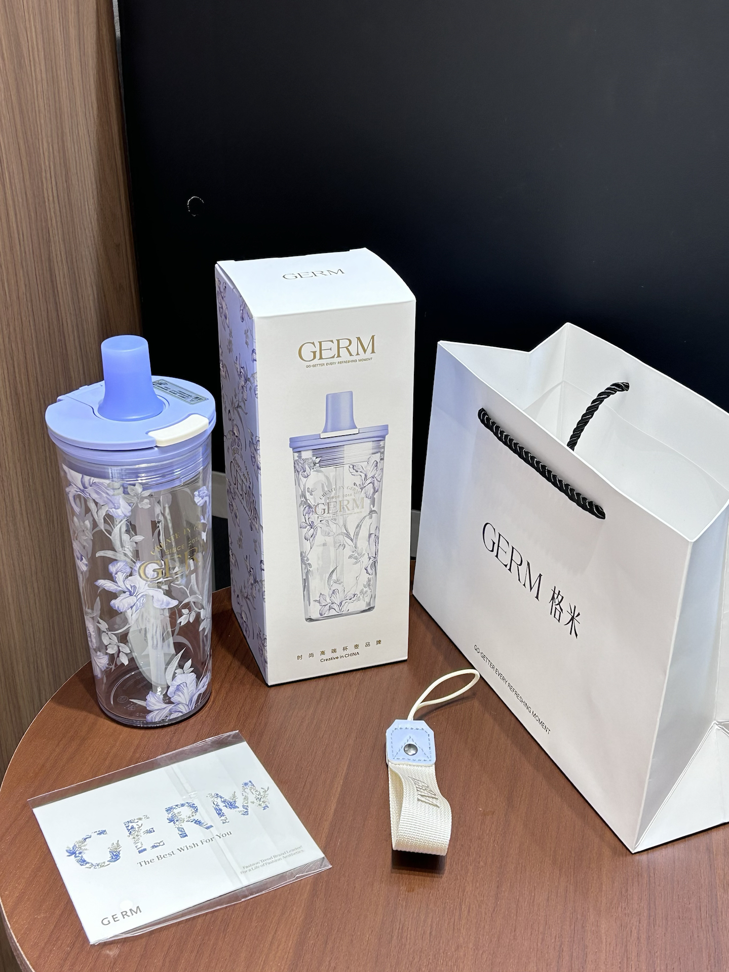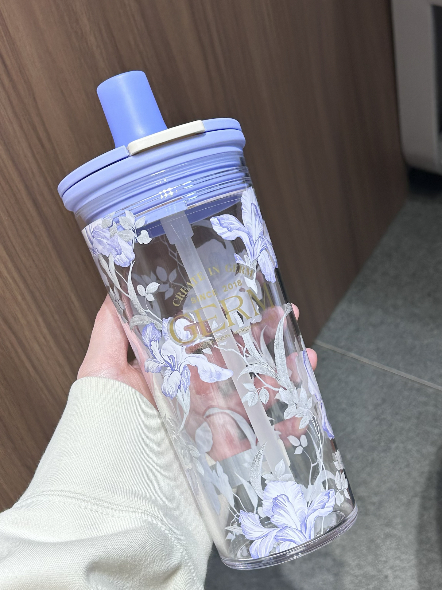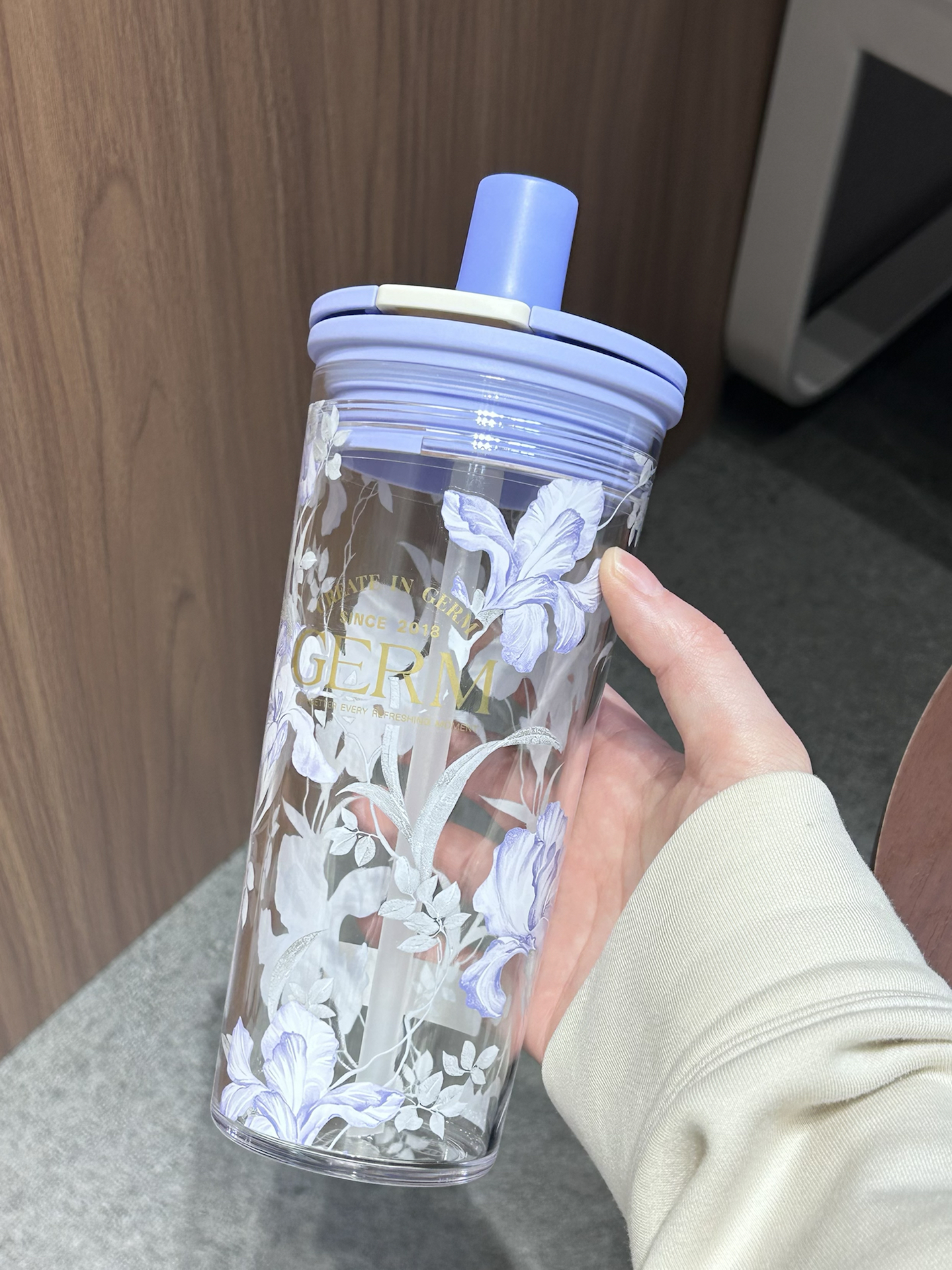 GERM格米这只鸢尾花水杯颜值好戳我 淡紫色的鸢尾印花 清清爽爽很有氛围感 杯身是透明的 质感还不错 带吸管和直饮口 喝起来很方便 密封盖设计 放包里也不用担心漏水 还配了挂绳 出门拎着也方便 容量够大 日常喝水完全够用 送人或者自用都很合适✨