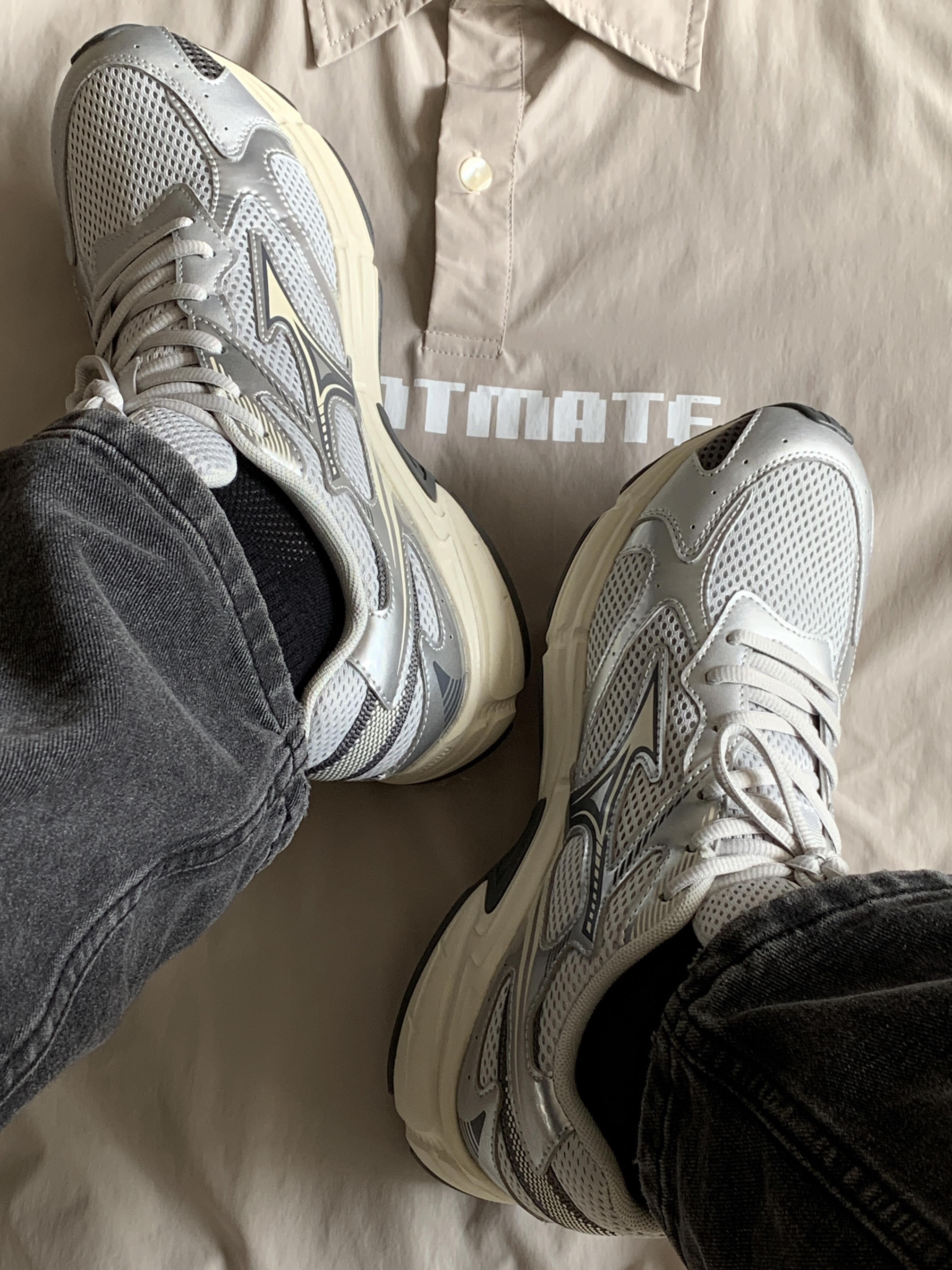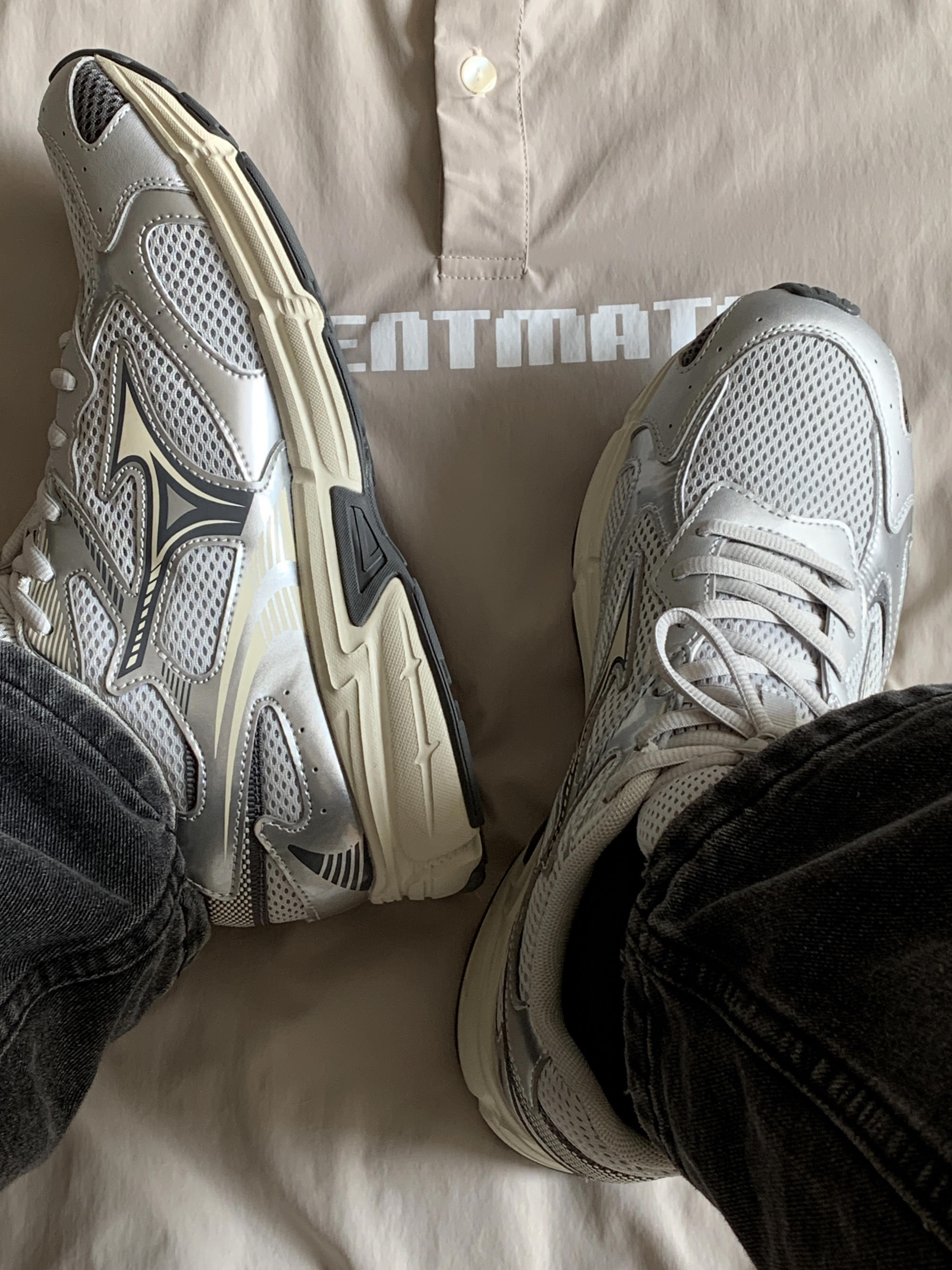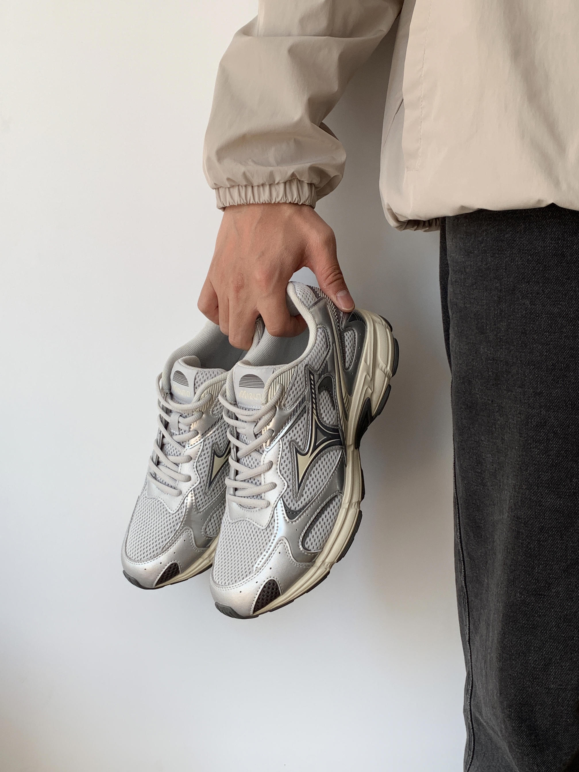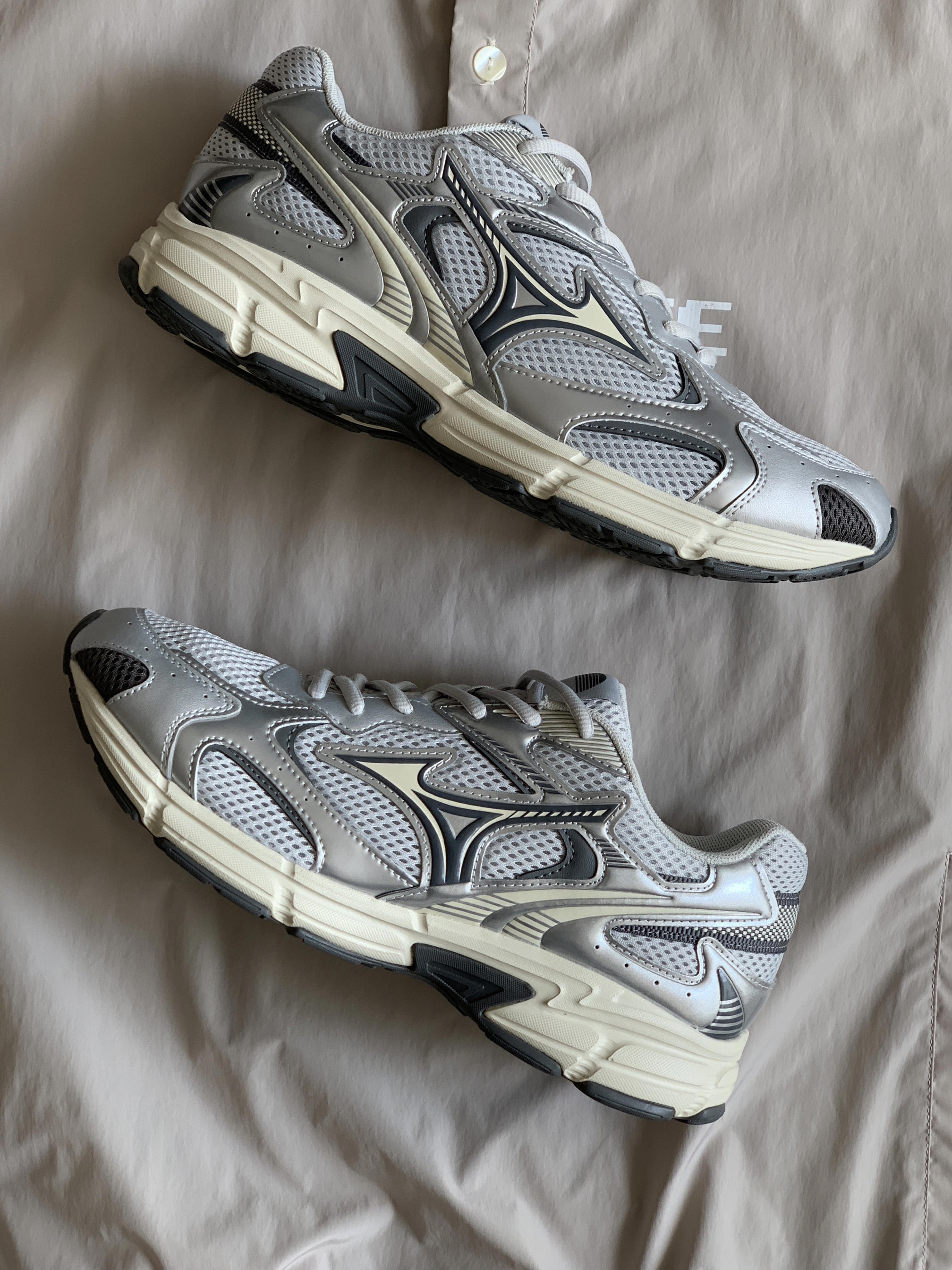 今年真是捅了银色单品的窝了 好喜欢这种复古跟未来感相结合的感觉 银色的机能感搭配米色的复古感 这样的配色组合真的太戳我了 这鞋颜值嘎嘎帅 我都夸累了 依旧是跑鞋的舒适脚感 包裹性很到位穿着能感觉脚被保护着 经典的网面设计造型上符合Y2K的风格 功能上也很符合南方闷热的天气