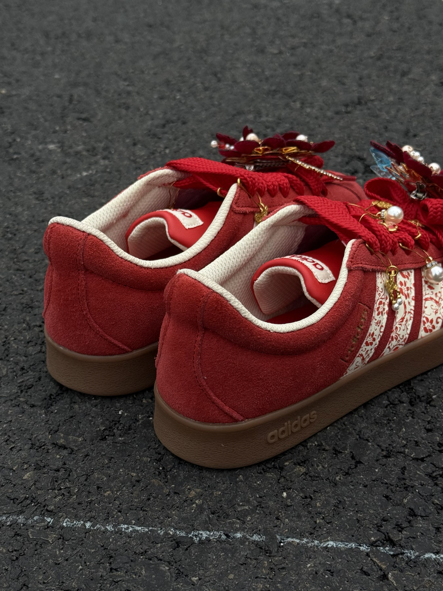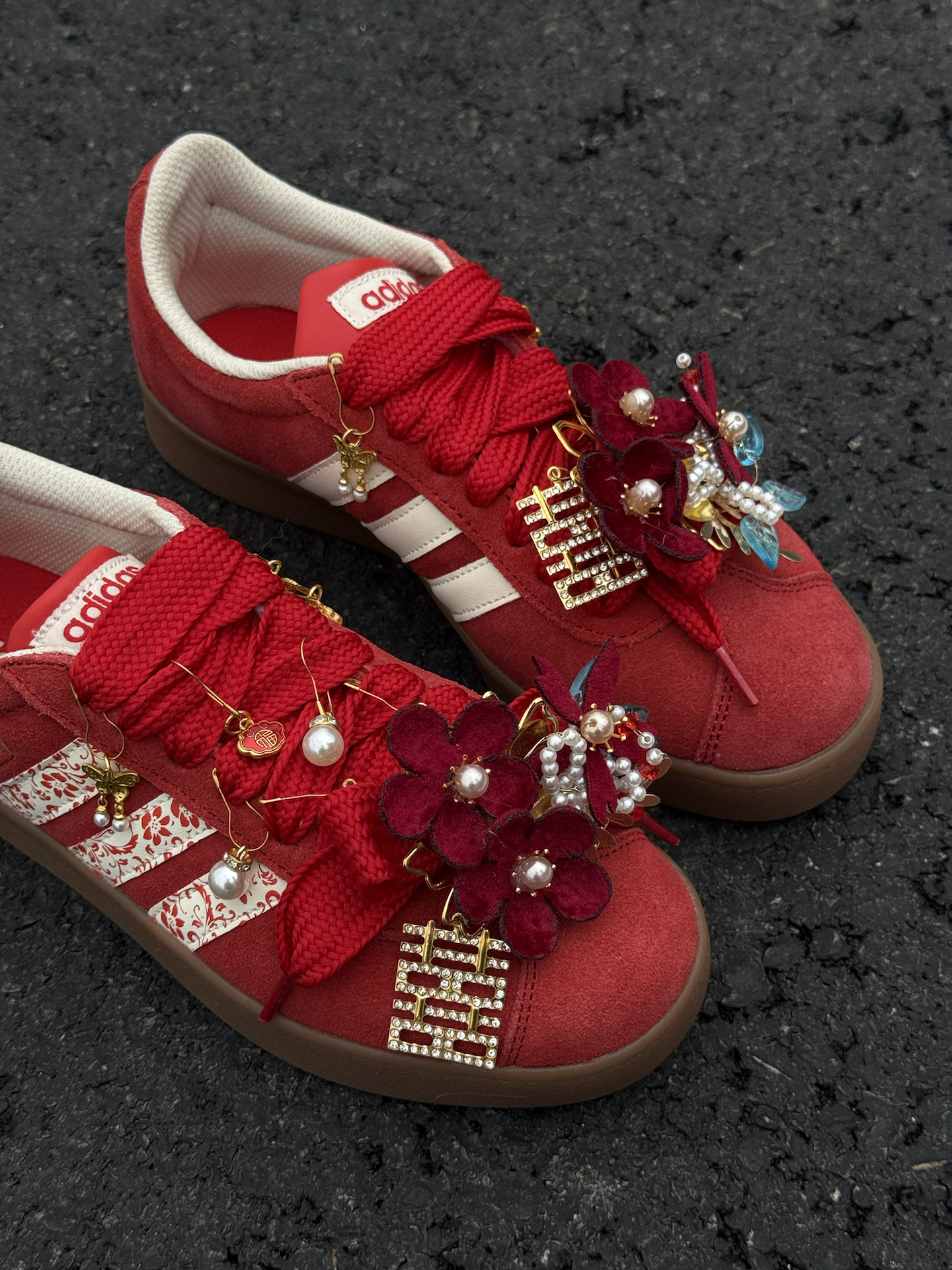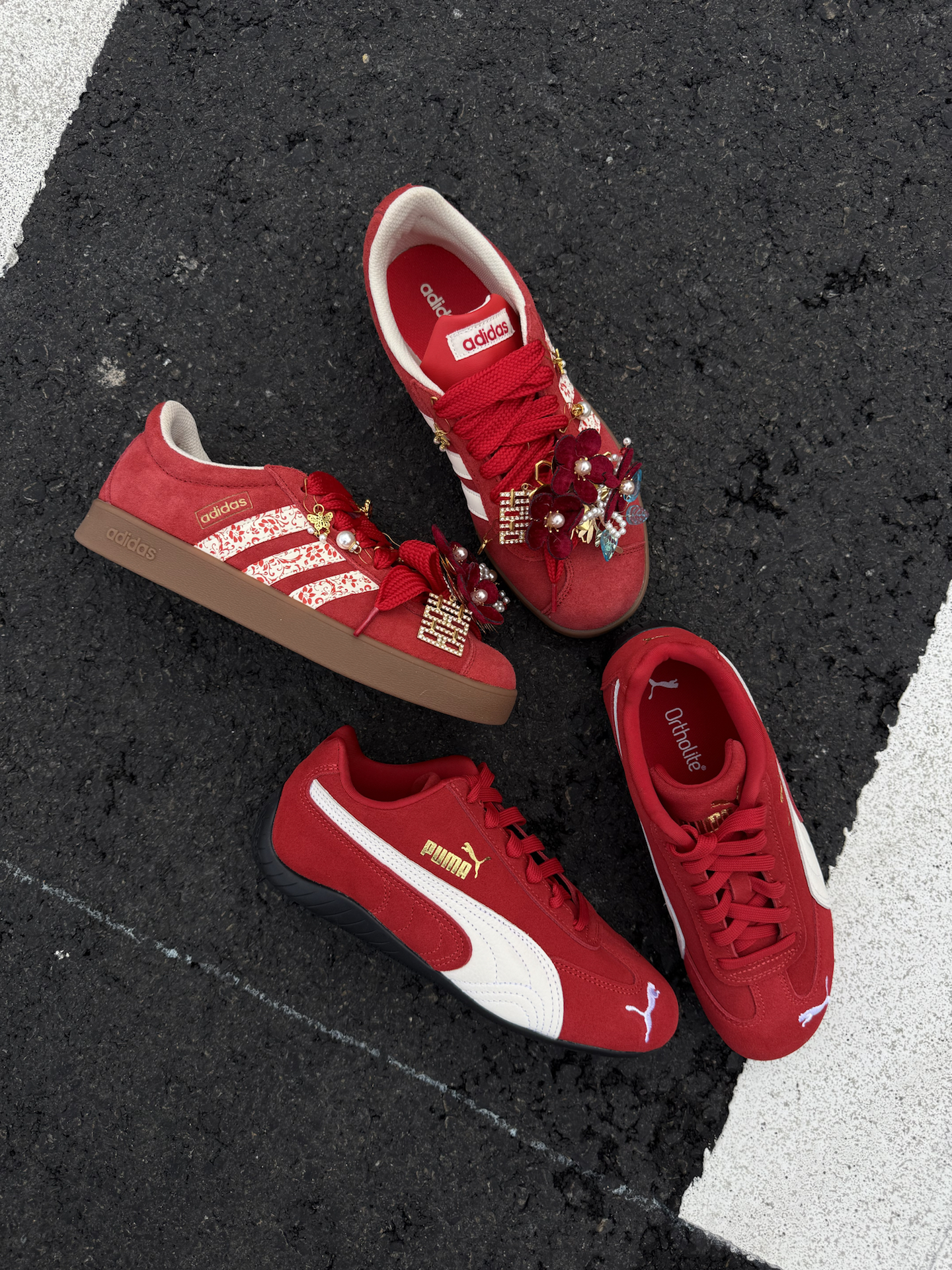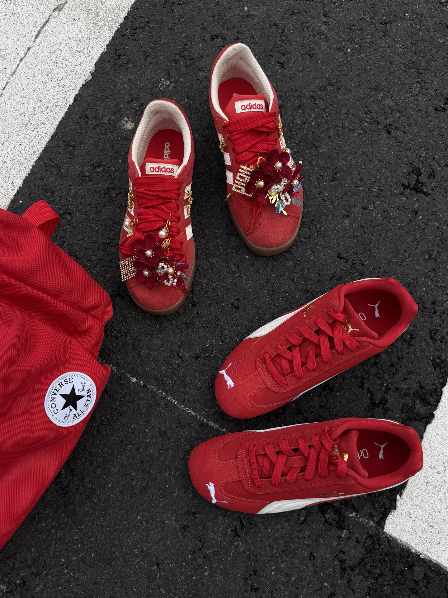 感觉还得是纯正的红鞋才能不被一身黑白酷压住 那问题就来了...选 还是 ? 一个能和这一身酷帅相呼应 一个能中和这属性起到一点娘man感 两双穿着都蛮舒服的 橡胶大底抓地力很强 阿迪这双簪花的属于婚鞋 没想到搭上酷酷的一套也蛮不错的 鞋面的簪花做了很细节的处理 光是看着就感觉福气满满! puma赛车鞋大家都熟悉 更偏向于中性风 穿上感觉贼软乎!