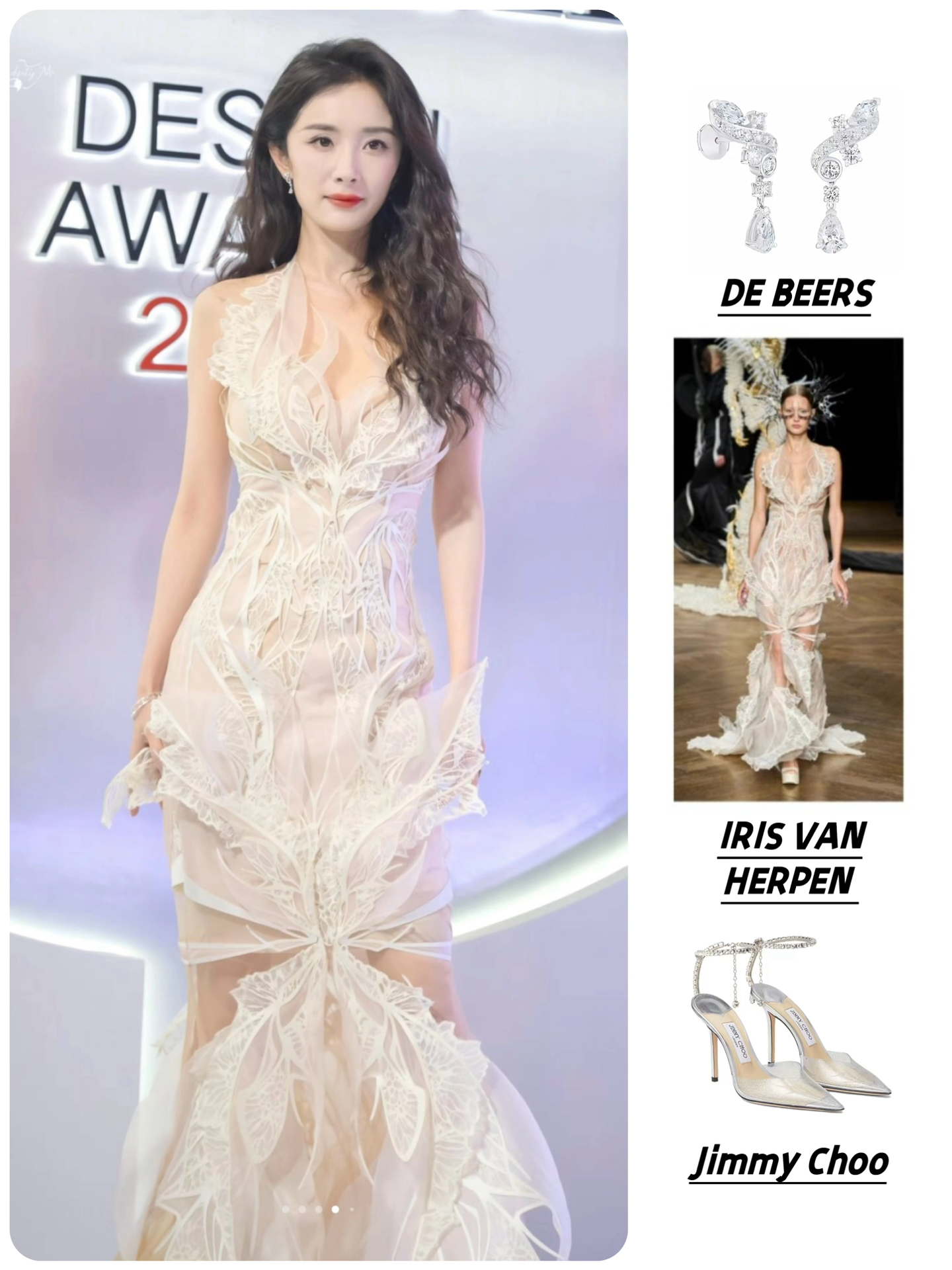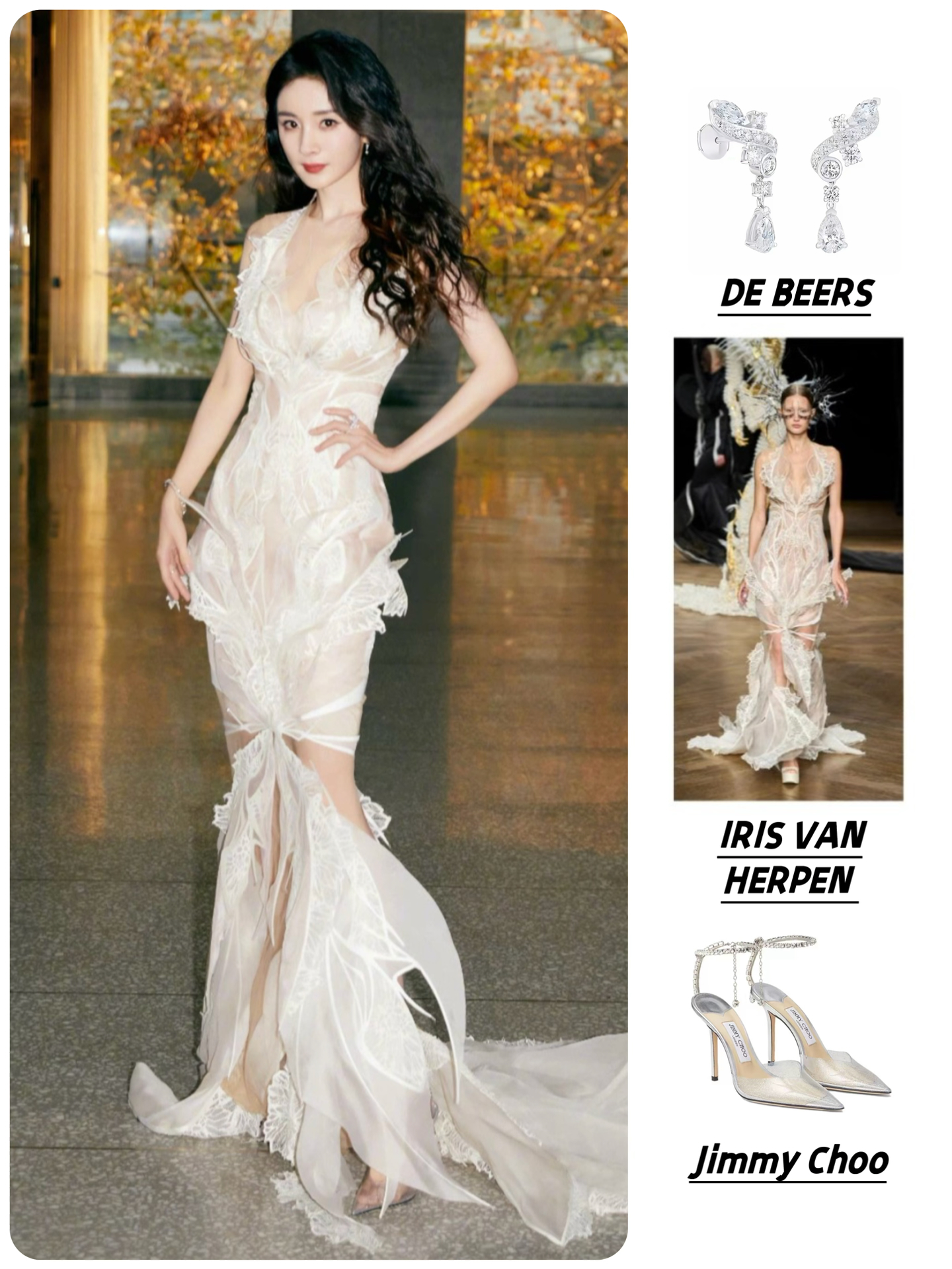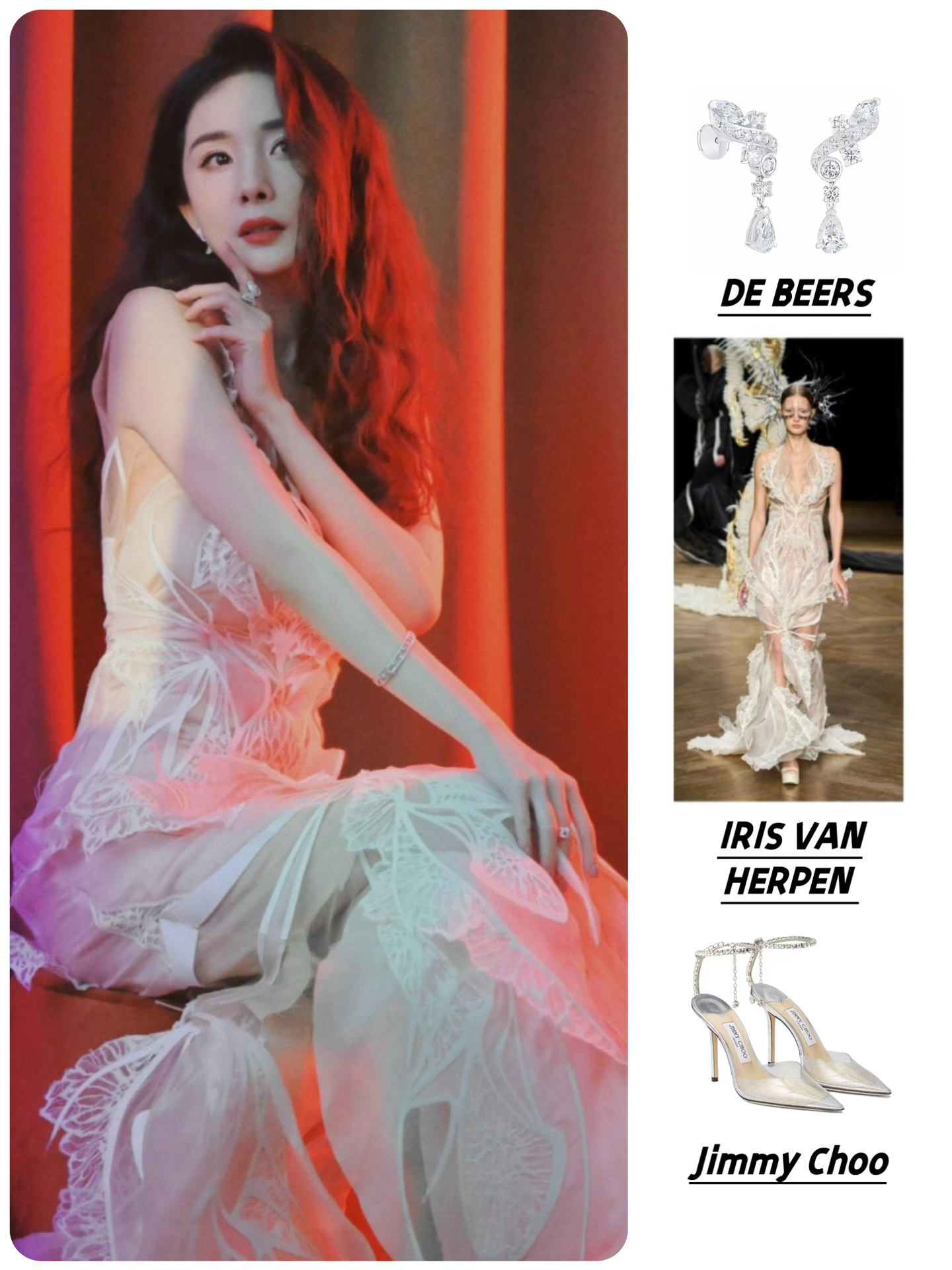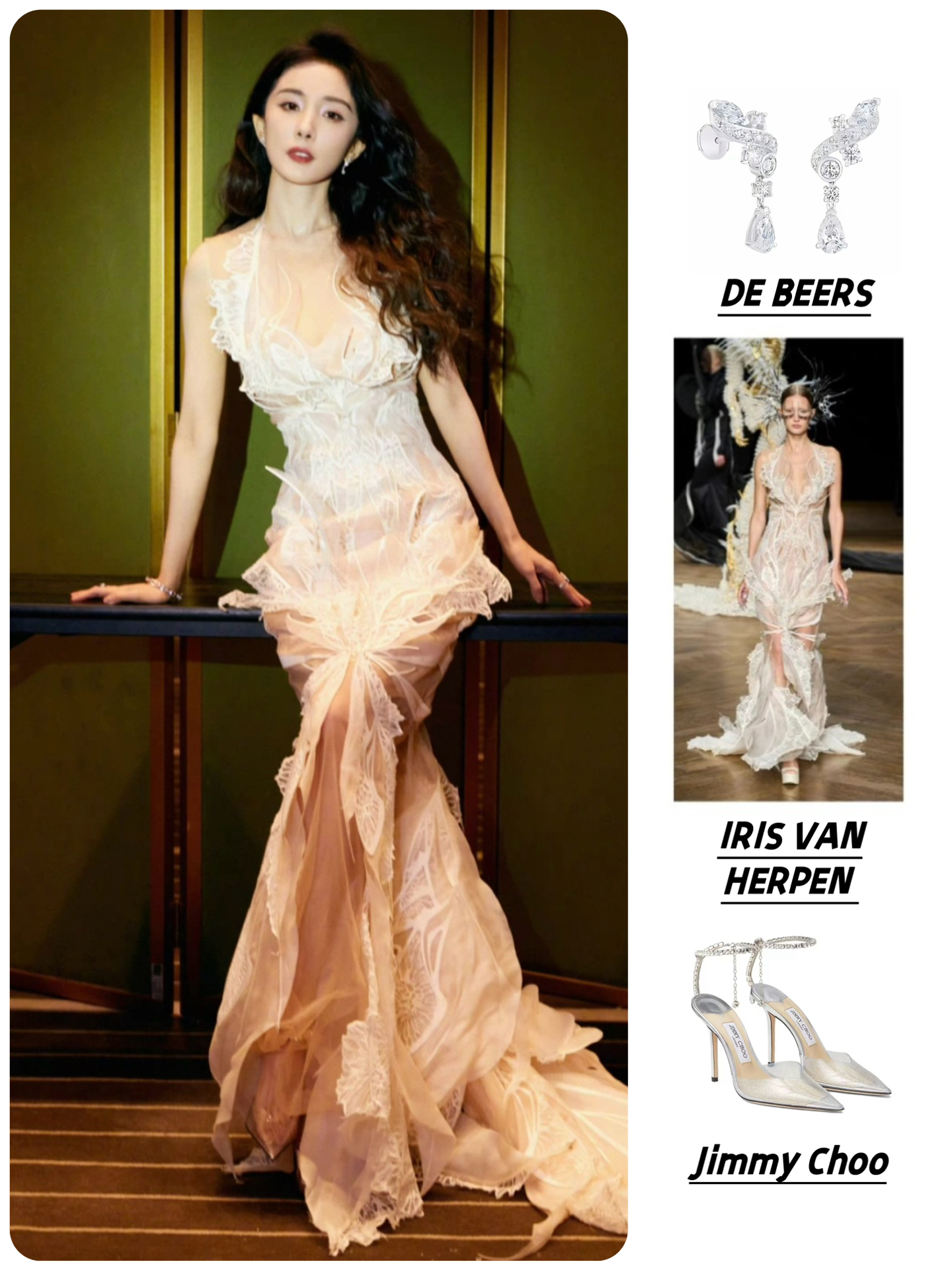 耳饰:DE BEERS Adonis Rose 👗IRIS VAN HERPEN 2022秋冬高定礼服裙 👠Jimmy Choo Saeda 水晶饰亮片 高跟鞋