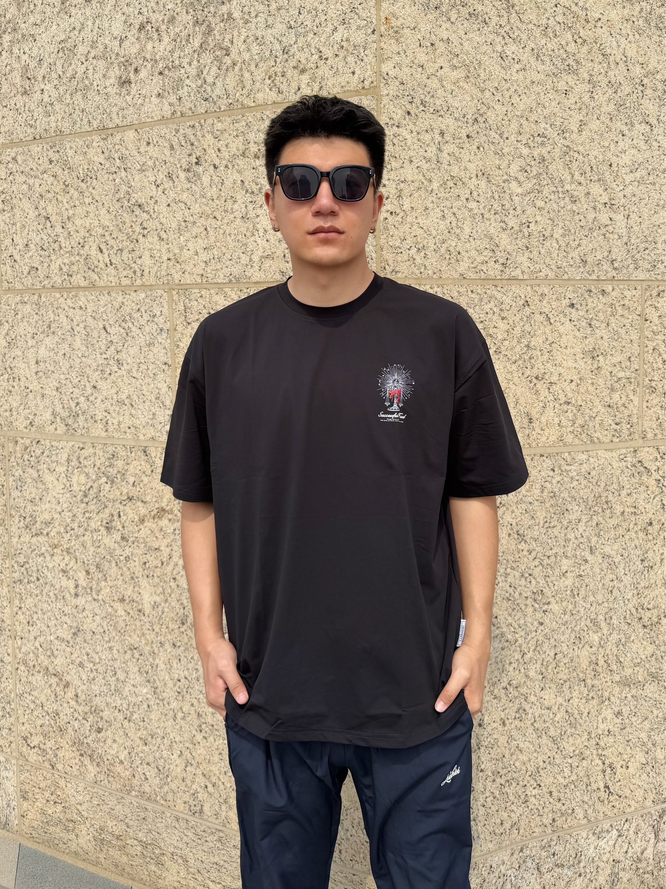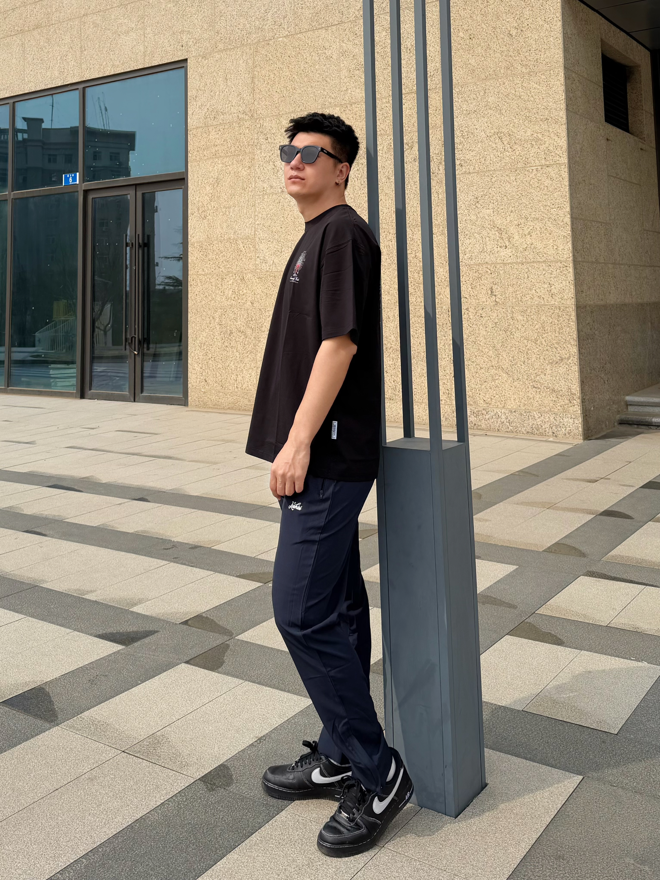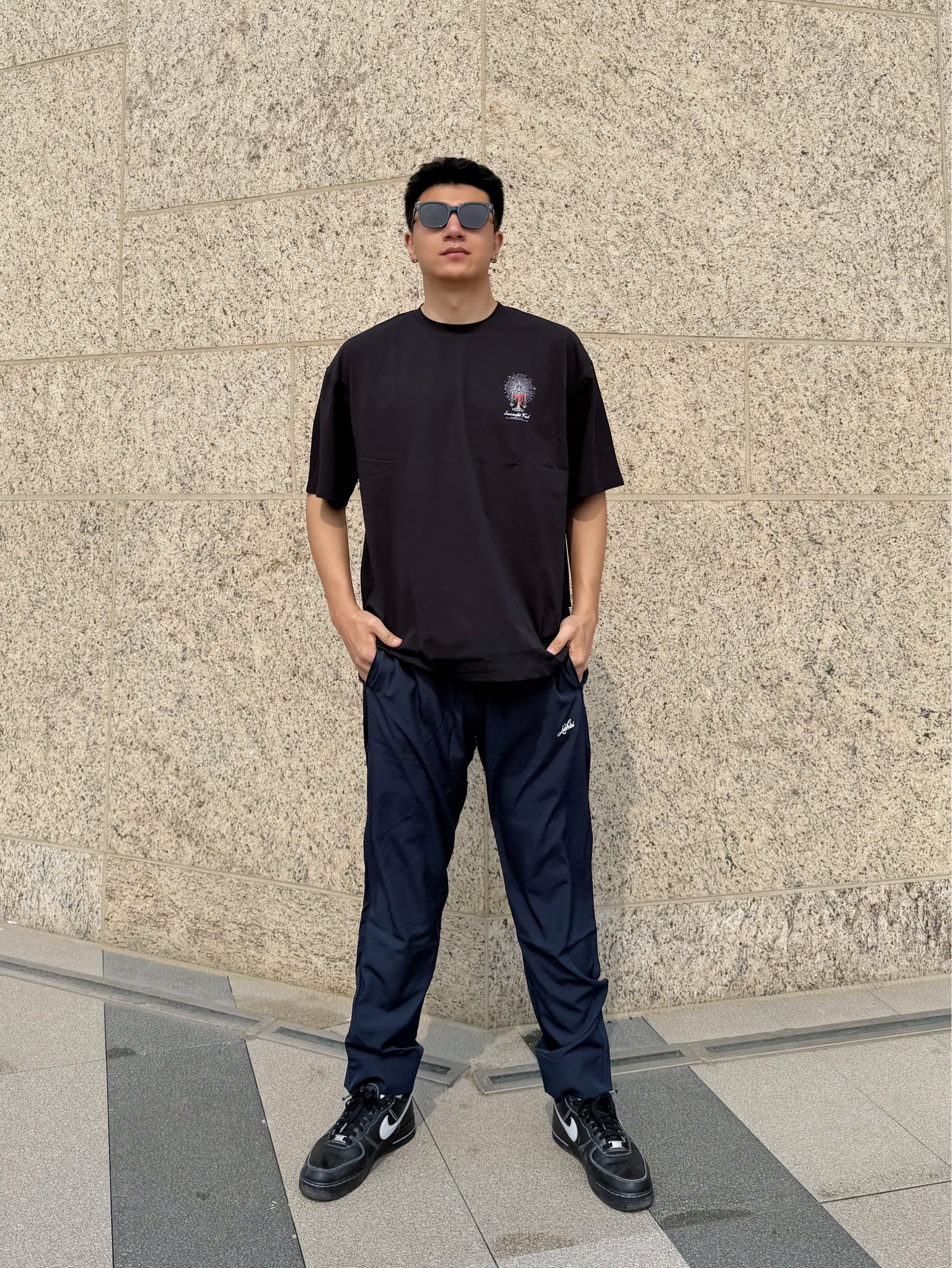 上身黑T背面独特印花, 吸湿速干不怕静电,很美式 下身藏青卫裤宽松带系带,断裂设计很也有美式内味~ 裤腿处拉链设计,可以调节宽松度 配双黑板鞋,舒服又自在 👦🏻:188 | 85 👕:XXL