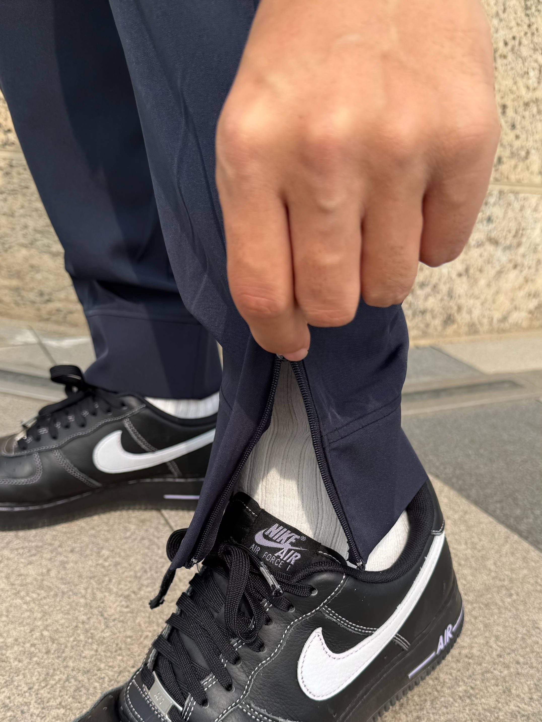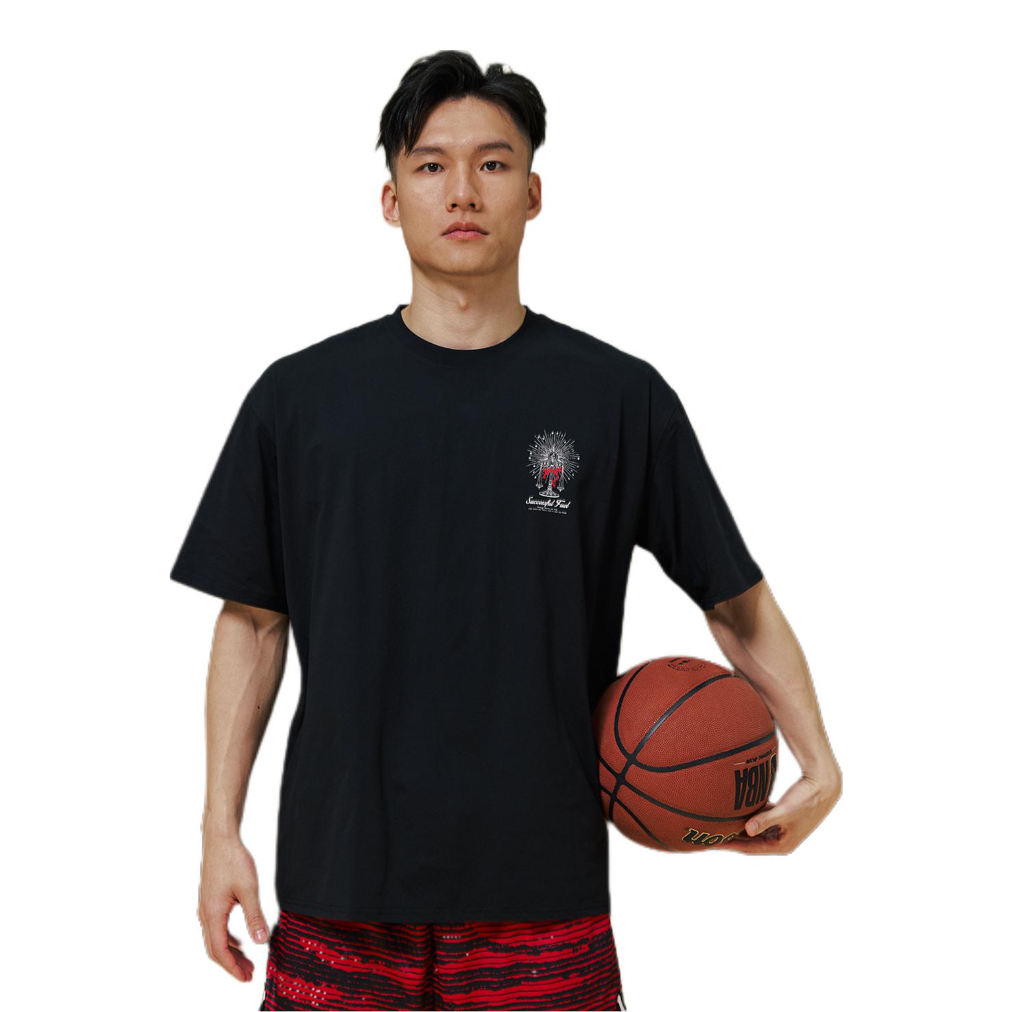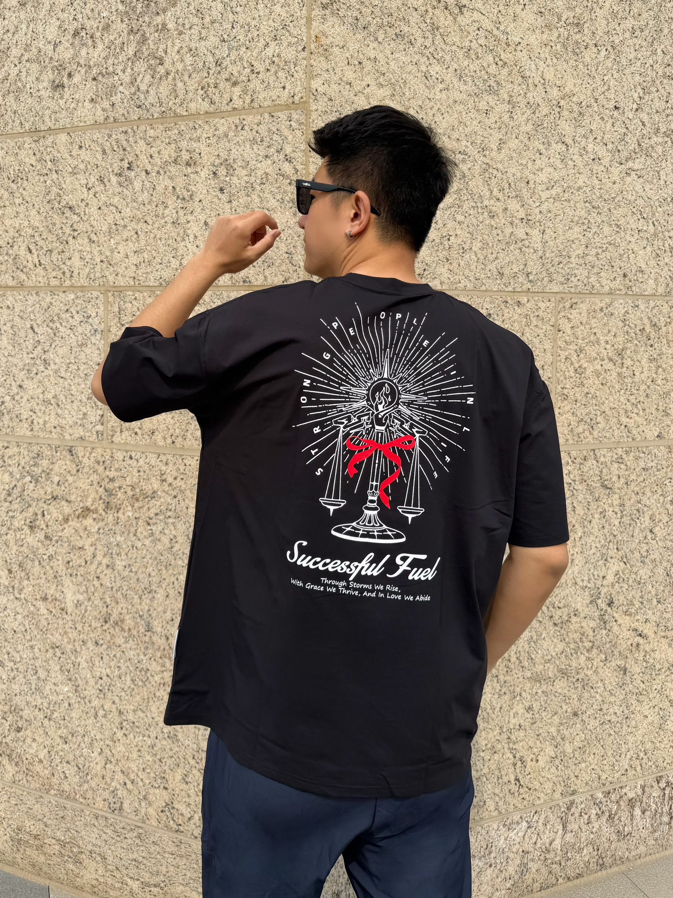上身黑T背面独特印花, 吸湿速干不怕静电,很美式 下身藏青卫裤宽松带系带,断裂设计很也有美式内味~ 裤腿处拉链设计,可以调节宽松度 配双黑板鞋,舒服又自在 👦🏻:188 | 85 👕:XXL