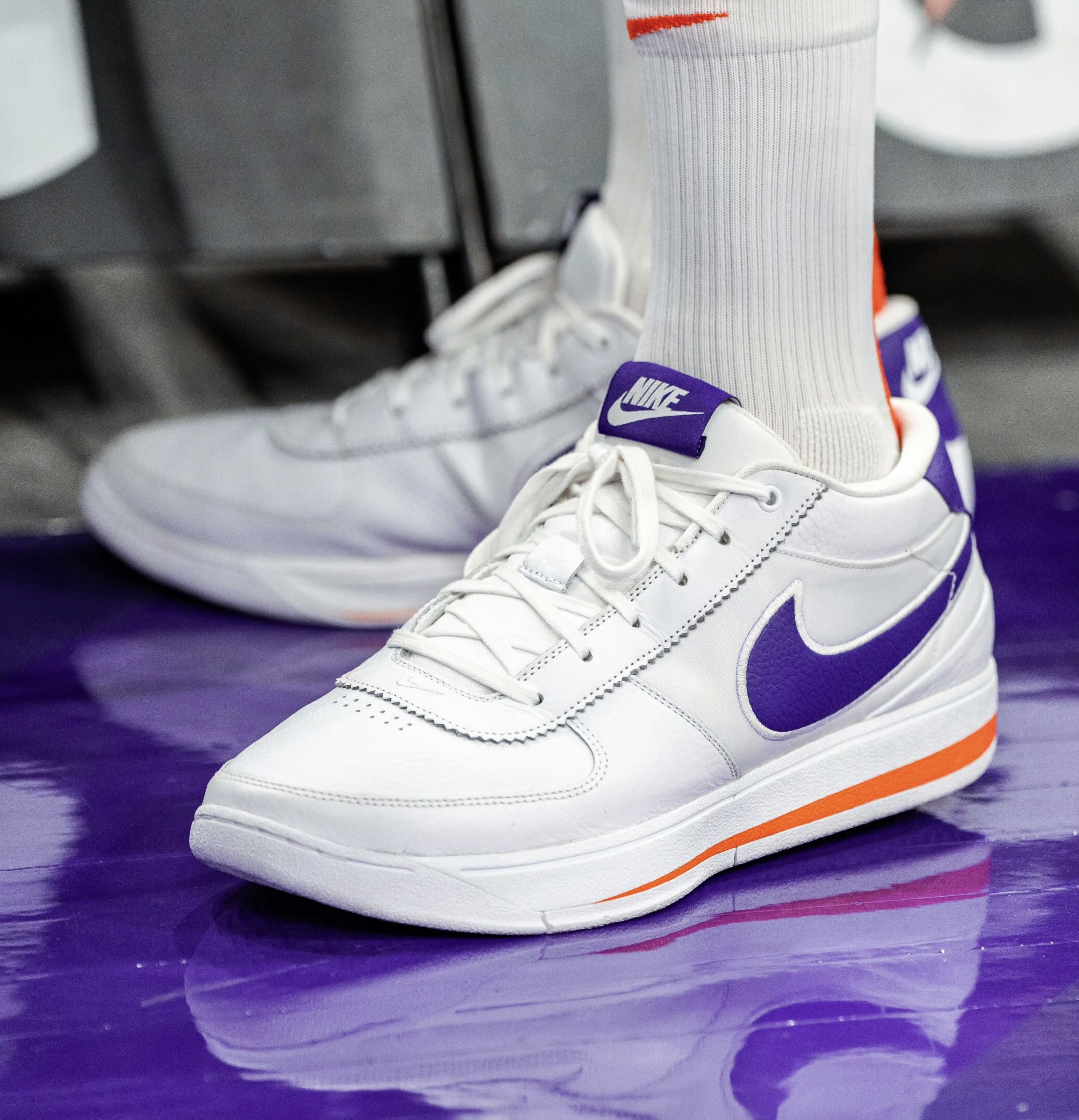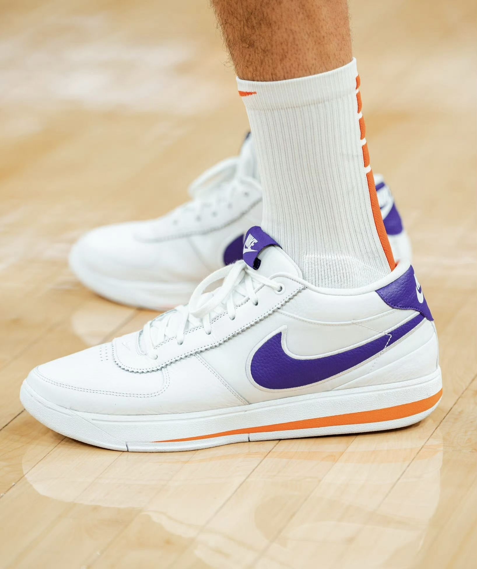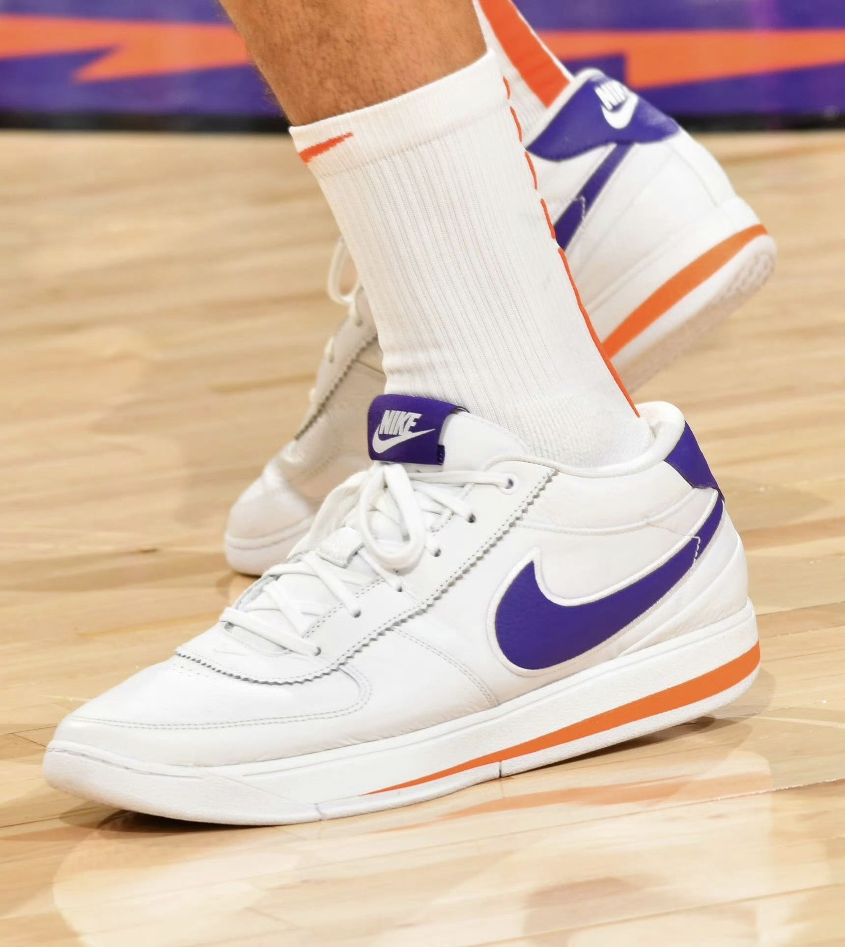 这个配色有双重设计灵感: - 核心灵感:致敬布克效力的菲尼克斯太阳队,鞋身的紫色+橙色完全对应太阳队的官方队色,是布克为球队打造的主场专属PE。 - 造型灵感:融合了耐克经典鞋款 Nike Cortez(阿甘鞋) 的复古设计语言——全皮革鞋面、鞋舌织标、中底线条都复刻了Cortez的经典造型,只是把原版阿甘鞋的红蓝配色,替换成了太阳队的紫橙队色,把复古鞋型和主队元素做了结合。