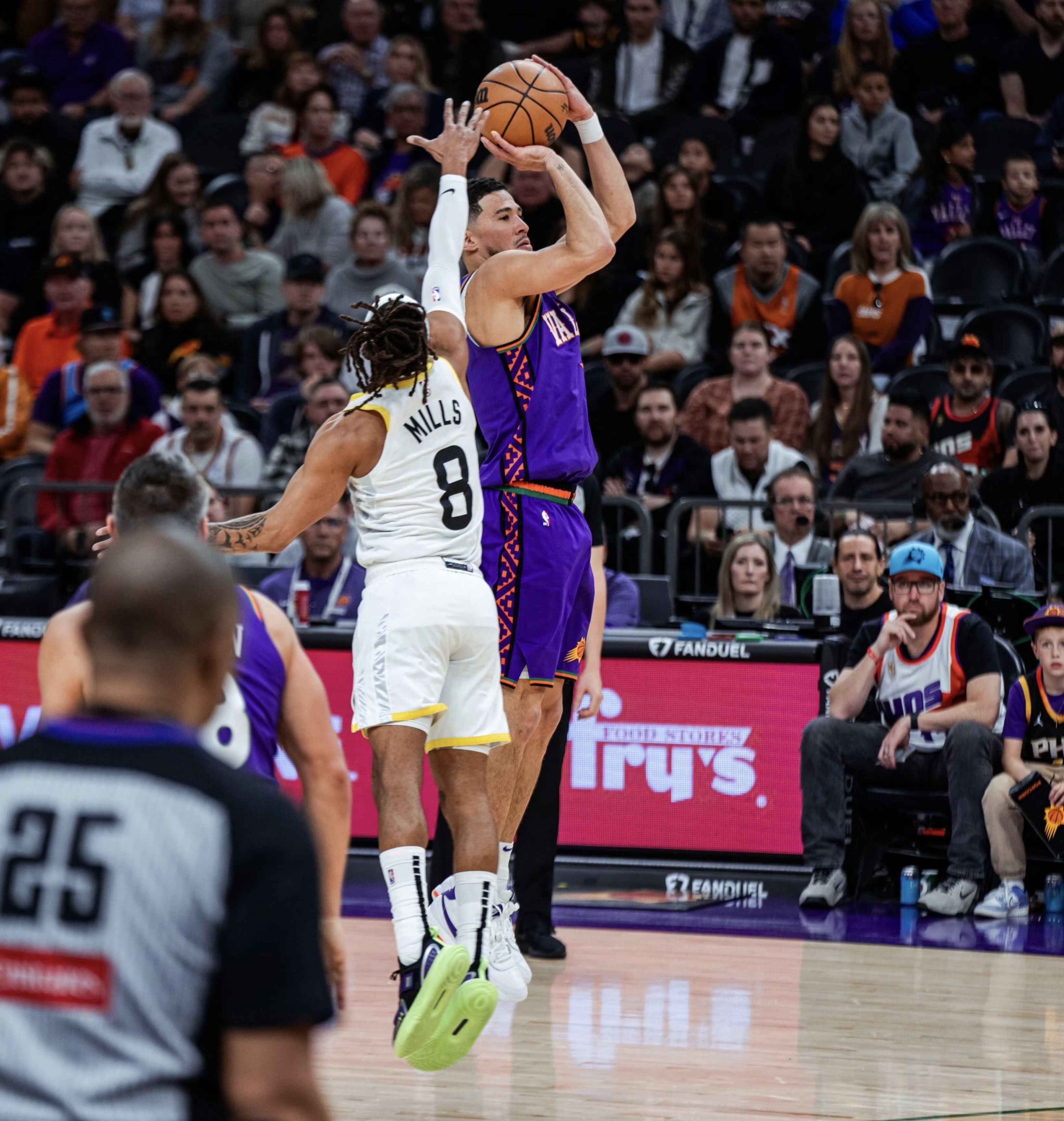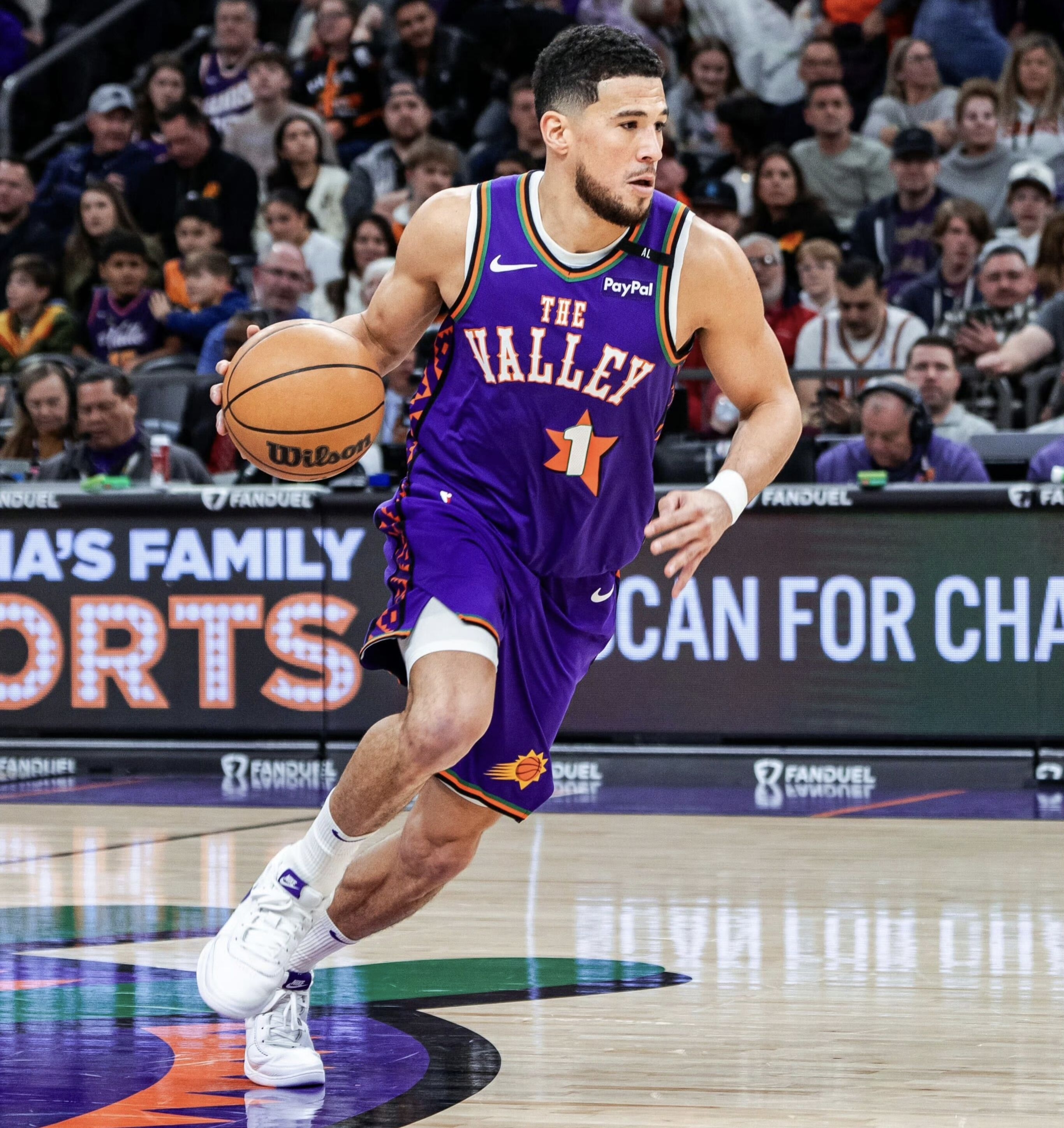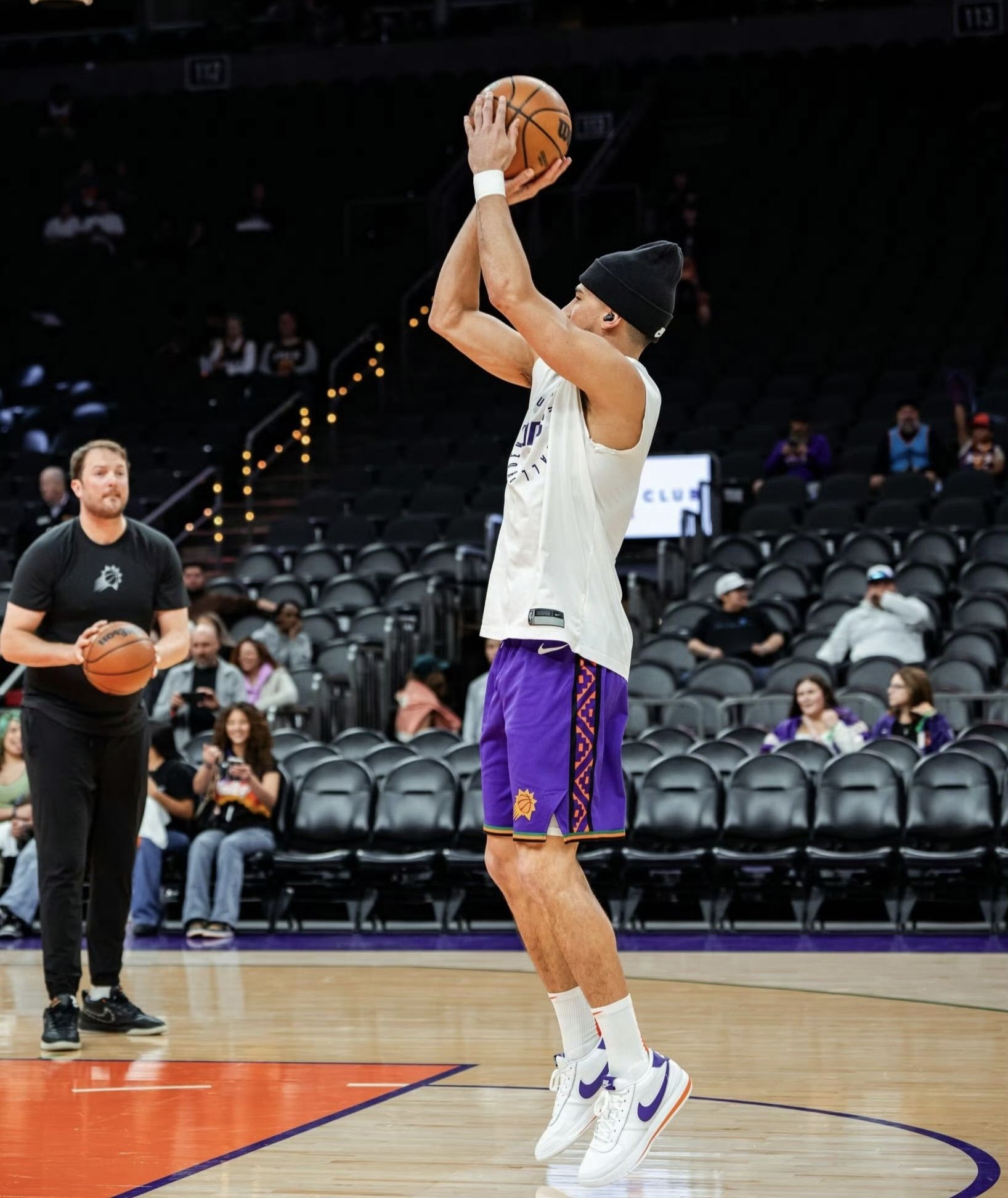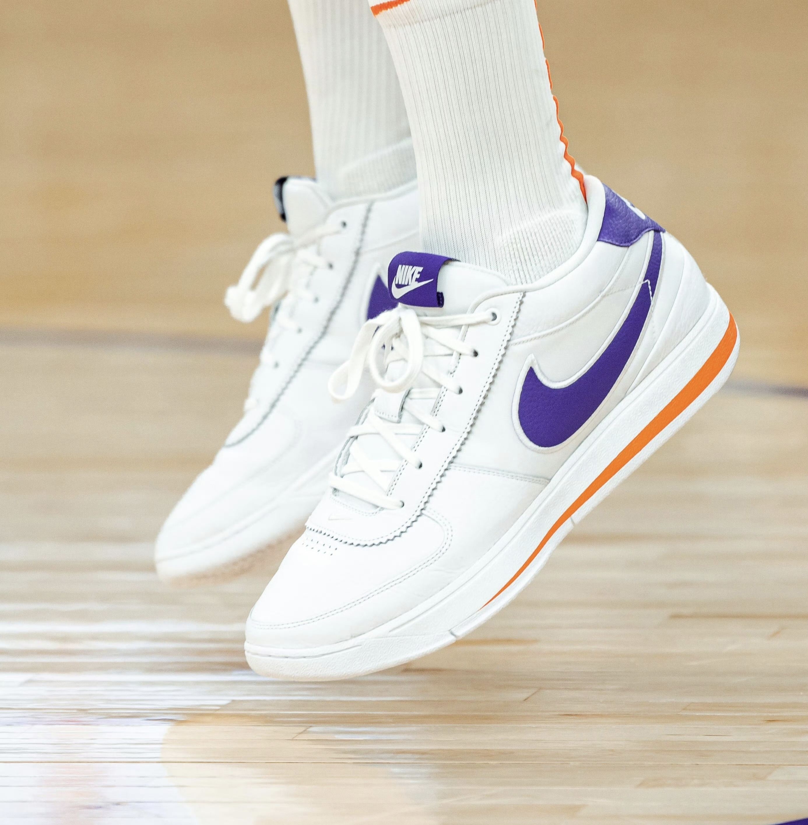 这个配色有双重设计灵感: - 核心灵感:致敬布克效力的菲尼克斯太阳队,鞋身的紫色+橙色完全对应太阳队的官方队色,是布克为球队打造的主场专属PE。 - 造型灵感:融合了耐克经典鞋款 Nike Cortez(阿甘鞋) 的复古设计语言——全皮革鞋面、鞋舌织标、中底线条都复刻了Cortez的经典造型,只是把原版阿甘鞋的红蓝配色,替换成了太阳队的紫橙队色,把复古鞋型和主队元素做了结合。
