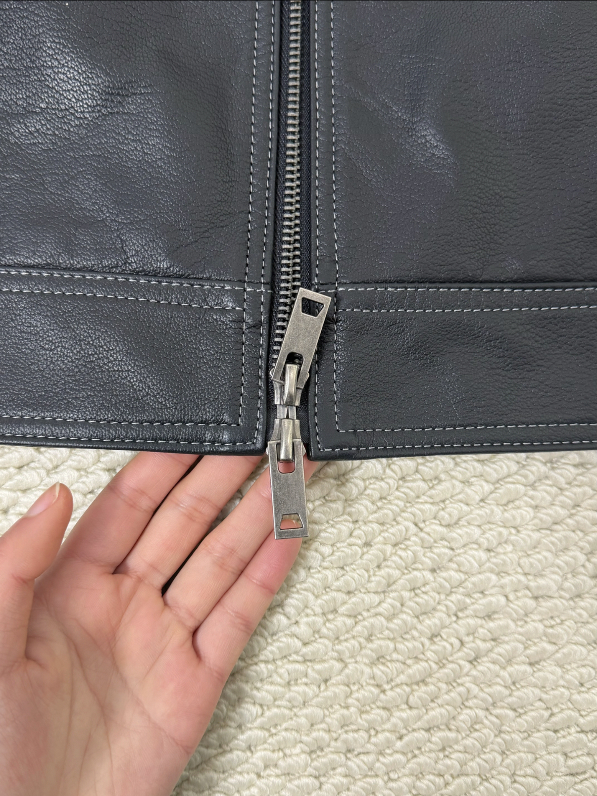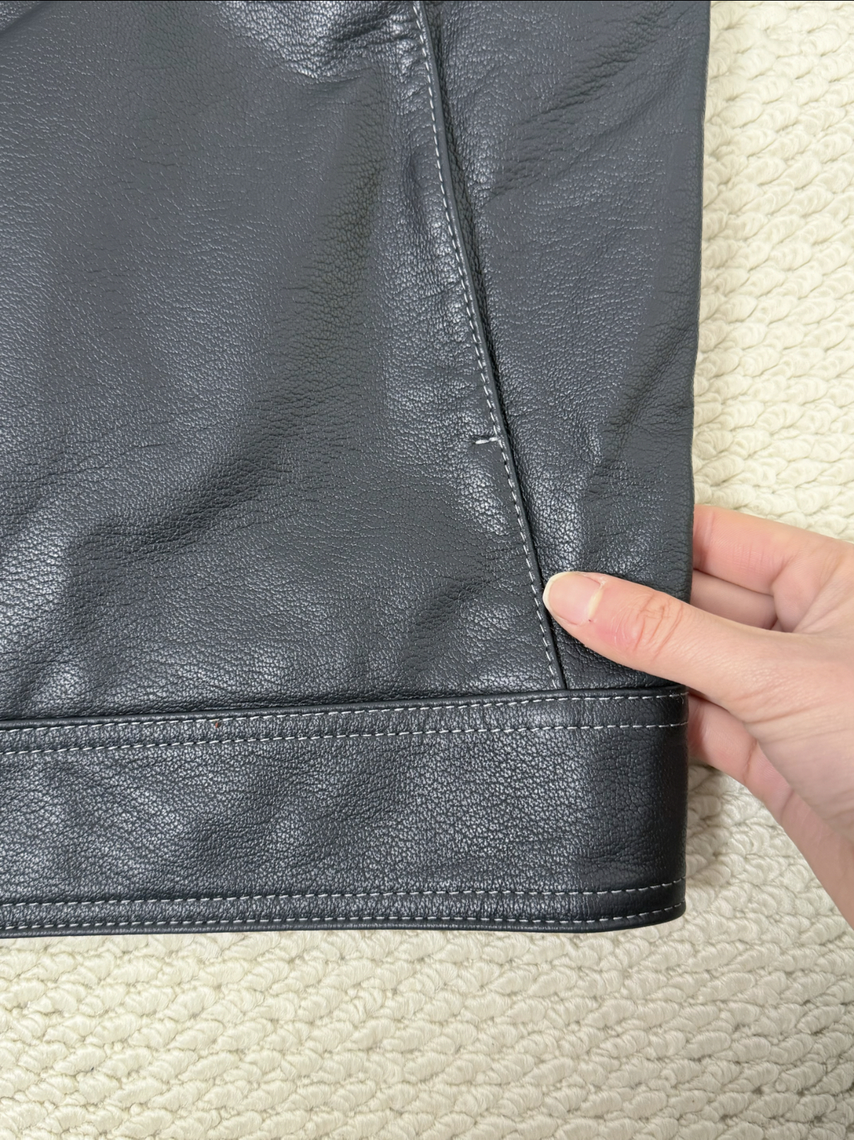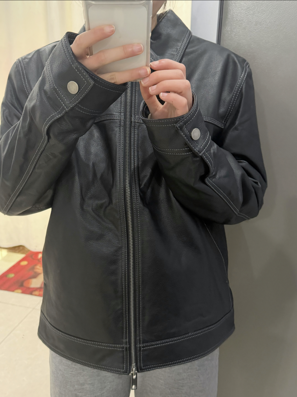 没有人能拒绝GXG这件皮衣! 经典的翻领+机车拉链元素,融合了慵懒通勤的感觉,日常穿也不会突兀✨ 黑色永不过时,怎么搭都不会出错✅ 头层牛皮的质感真的绝,挺括有型,但又柔软不束缚,开车或者抬手都很自在 最近开春穿它刚刚好,早晚都有它挡风 164/93穿s码合身