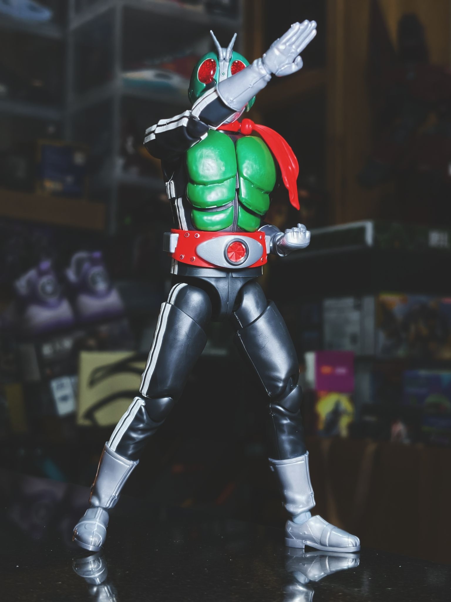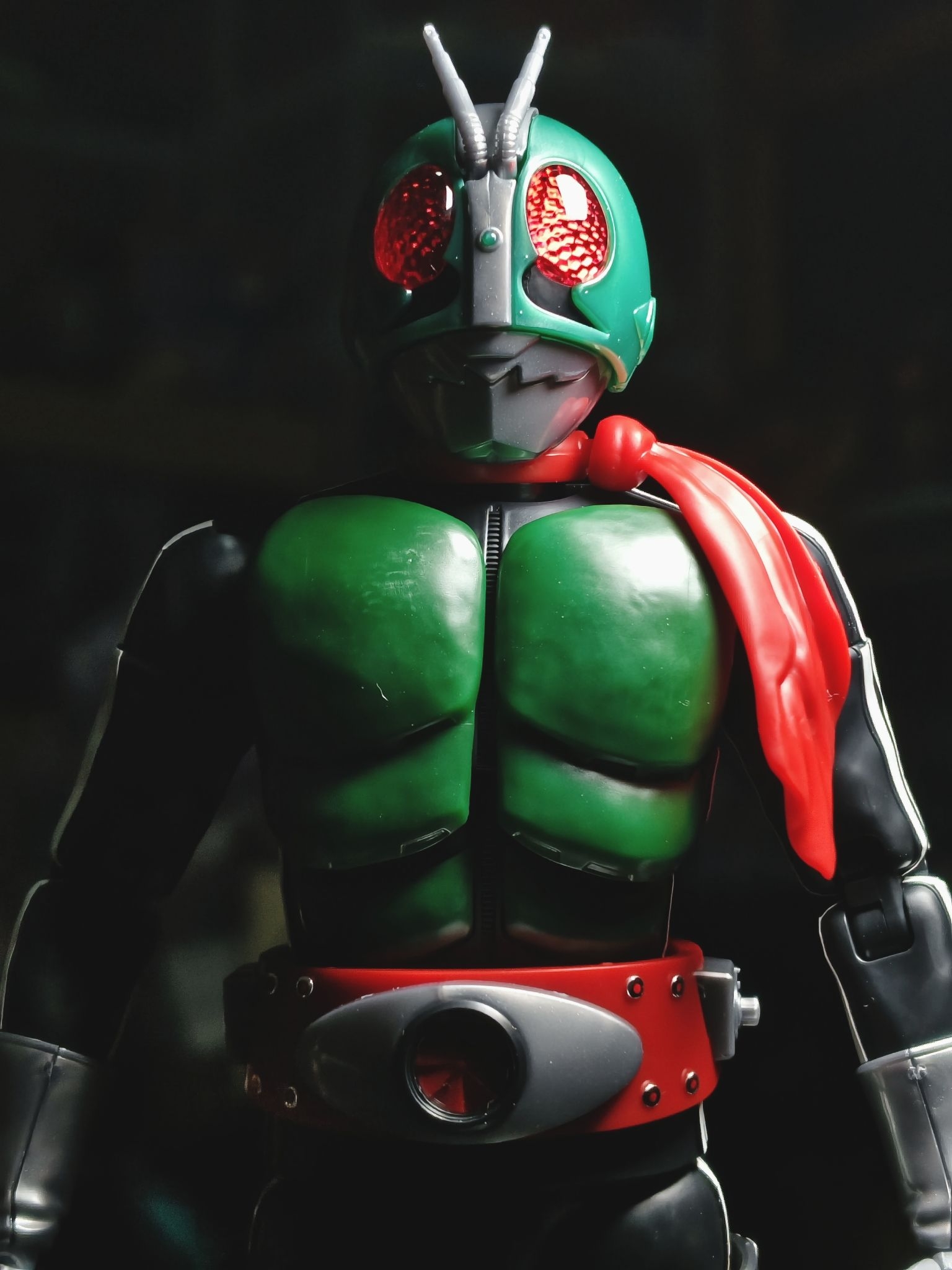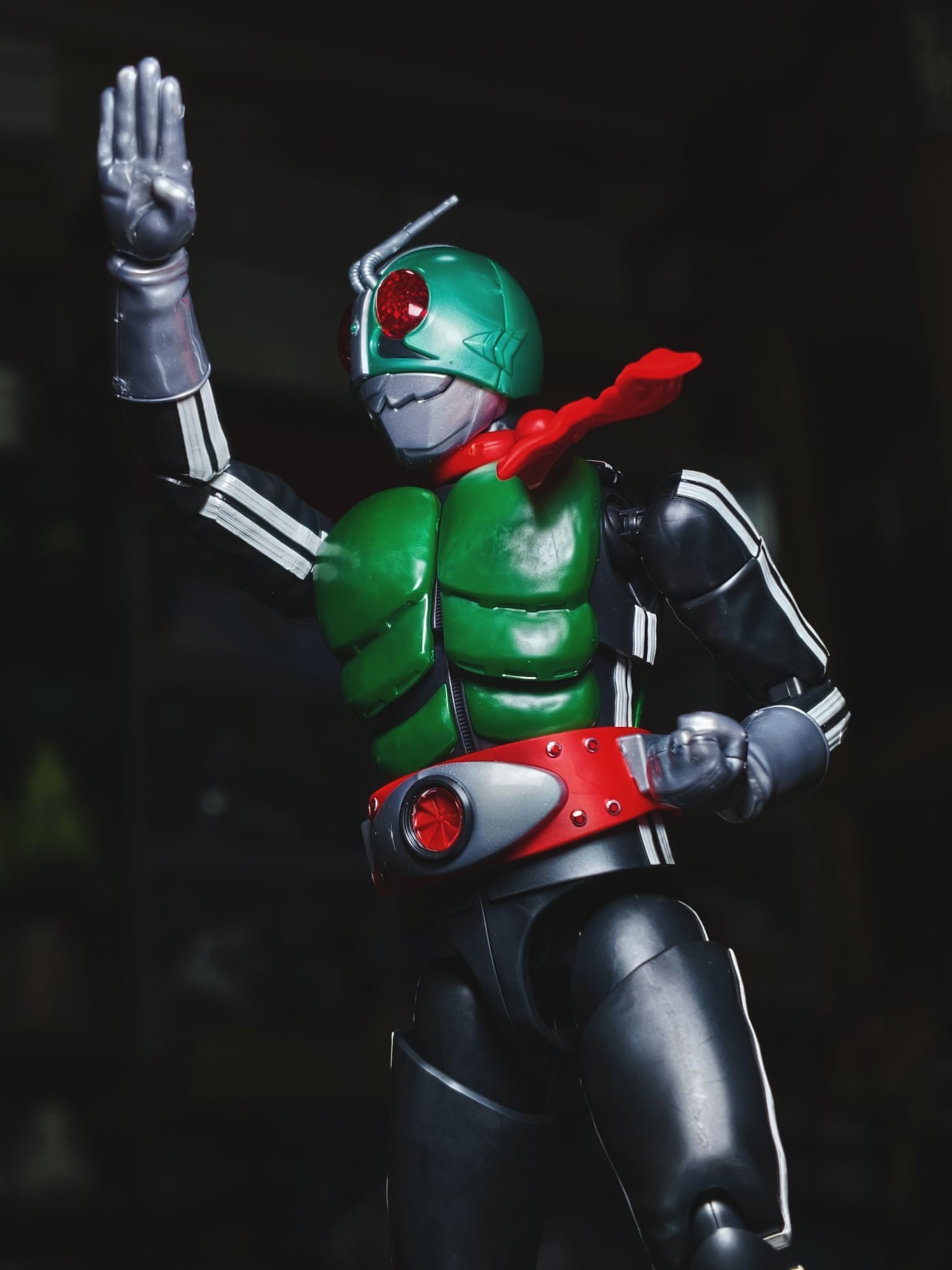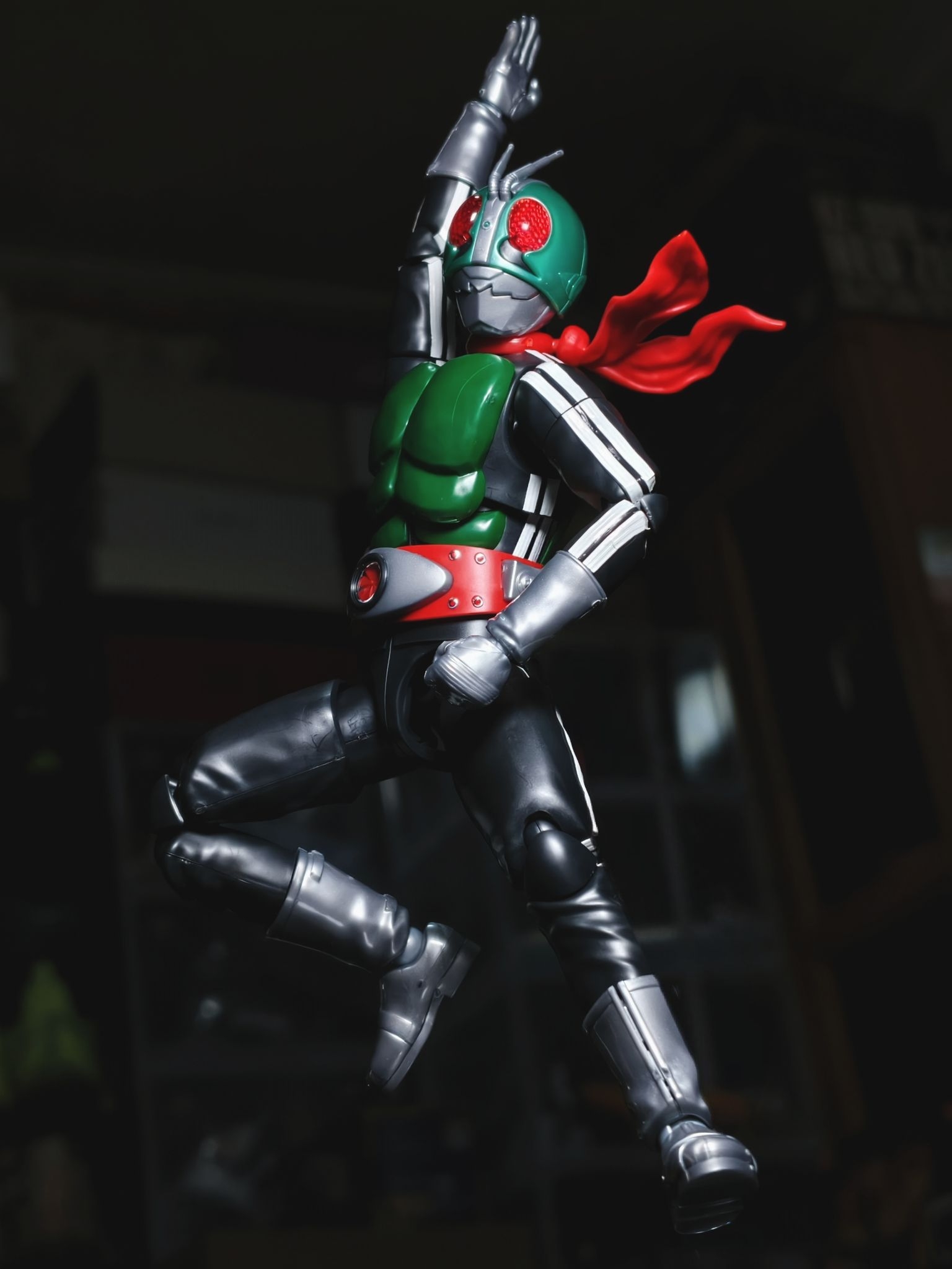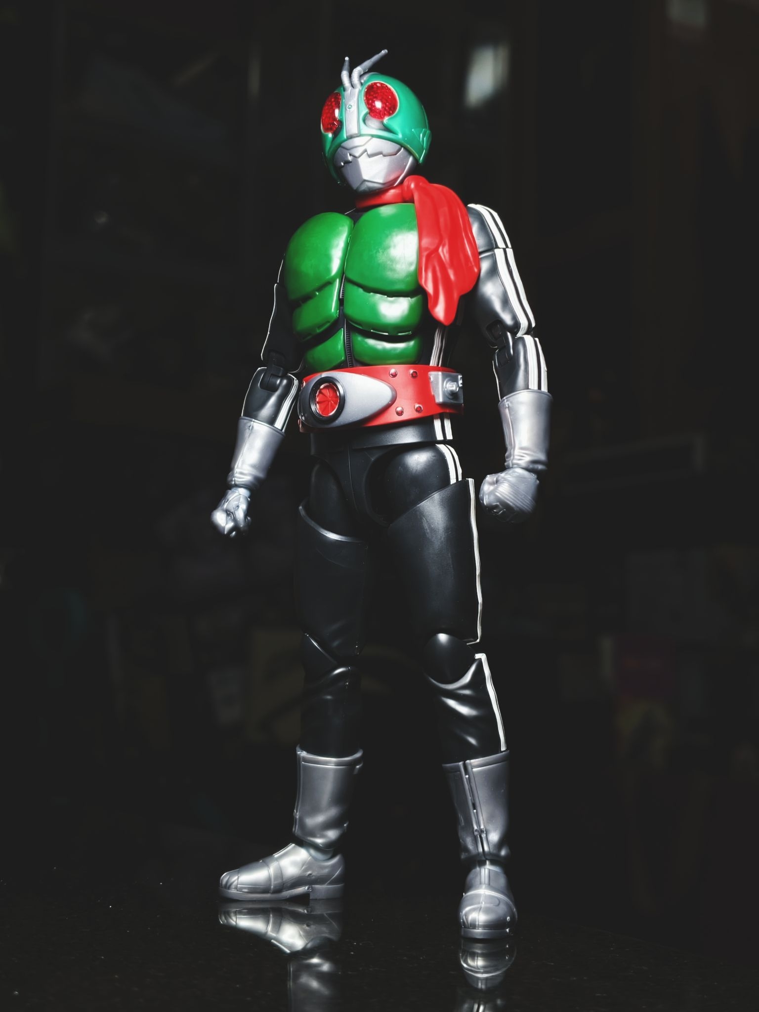 染上昭和老登了~这种老骑士真的很有感觉 frs新发售的假面骑士新1号,算是高追了,身体侧边白色线条以及腰带分色,均需通过贴纸来还原,眼部内侧贴了反光贴纸,灯照下眼部效果很好。可动还不错,把玩不如shf,不过姿势一起来就很有范了
