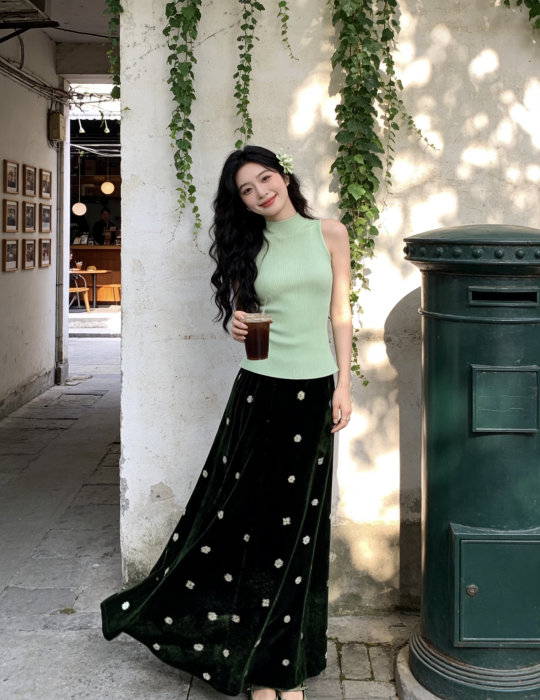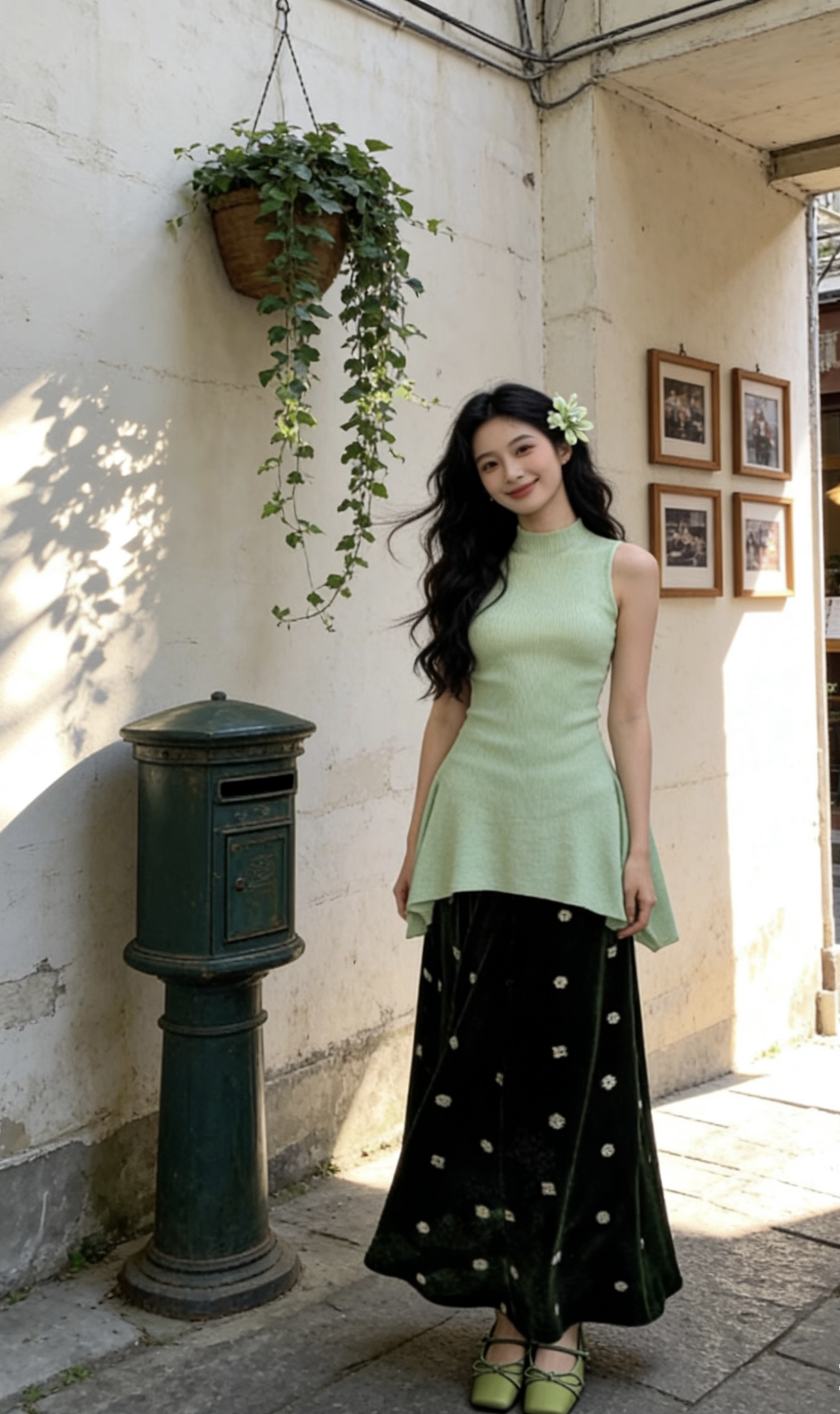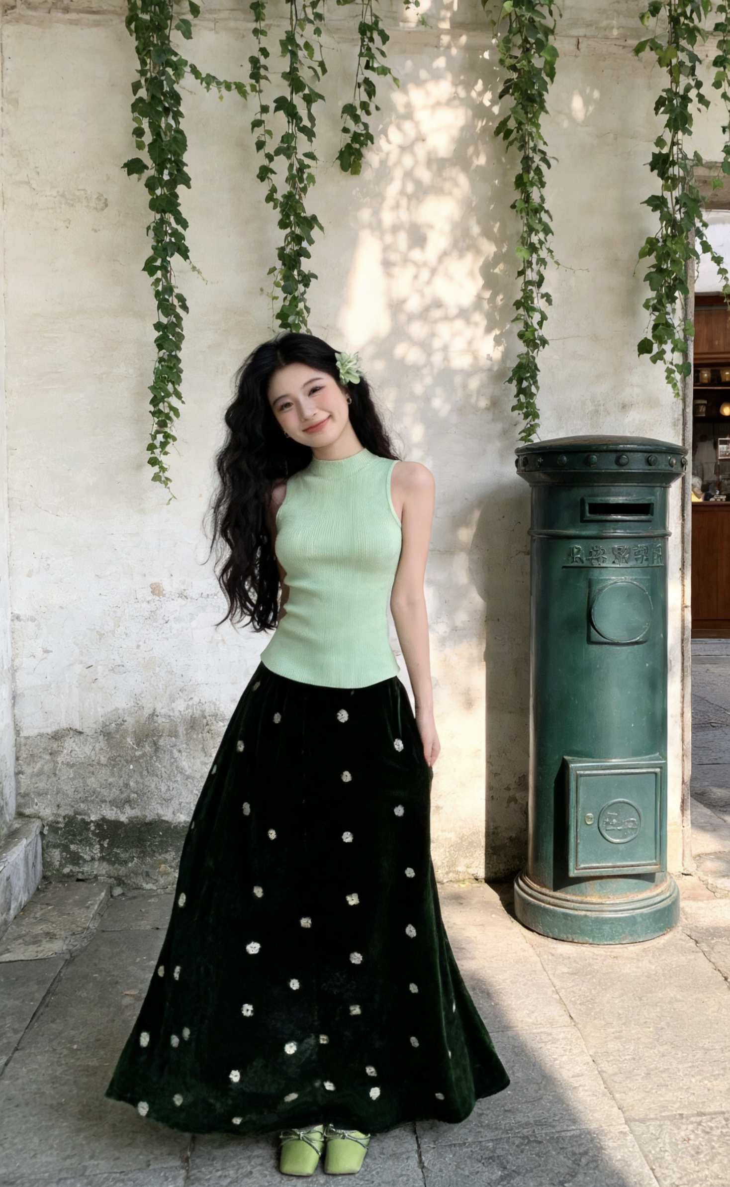 宝子们!早春的第一套元气穿搭必须锁死这套💚 挖到宝了!这套柳芽绿系穿搭也太懂春天了吧~ 浅绿无袖针织修身又显瘦,完美贴合身形还不勒,单穿超清爽✨ 搭配的墨绿波点丝绒半身裙,垂坠感绝了!走动时裙摆轻轻摆动,复古又温柔,丝绒材质还自带高级质感,一点不廉价👗 最点睛的就是这双柳芽绿芭蕾鞋!方头设计超显脚小,绑带细节精致又灵动,踩上去软乎乎的,暴走一下午都不累脚,青春感直接拉满👟 再配上同色系的绿色发簪...