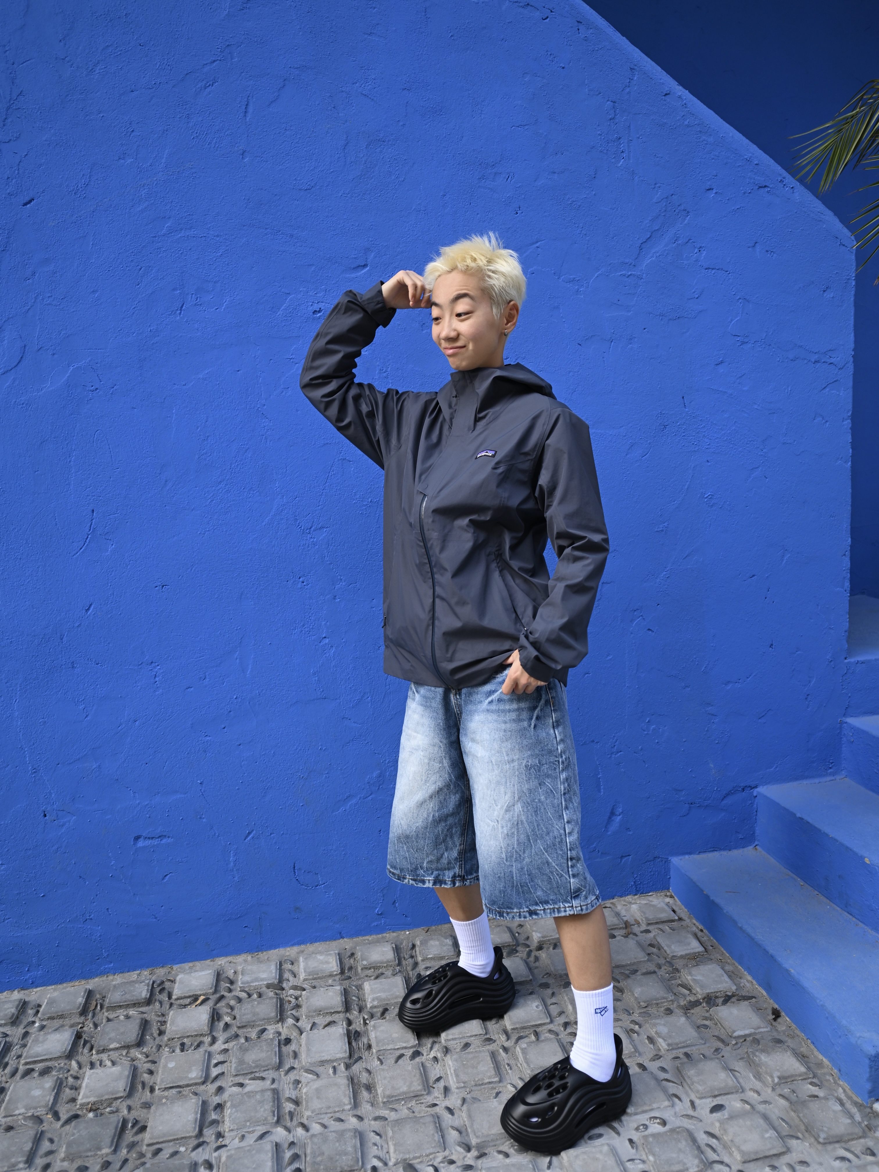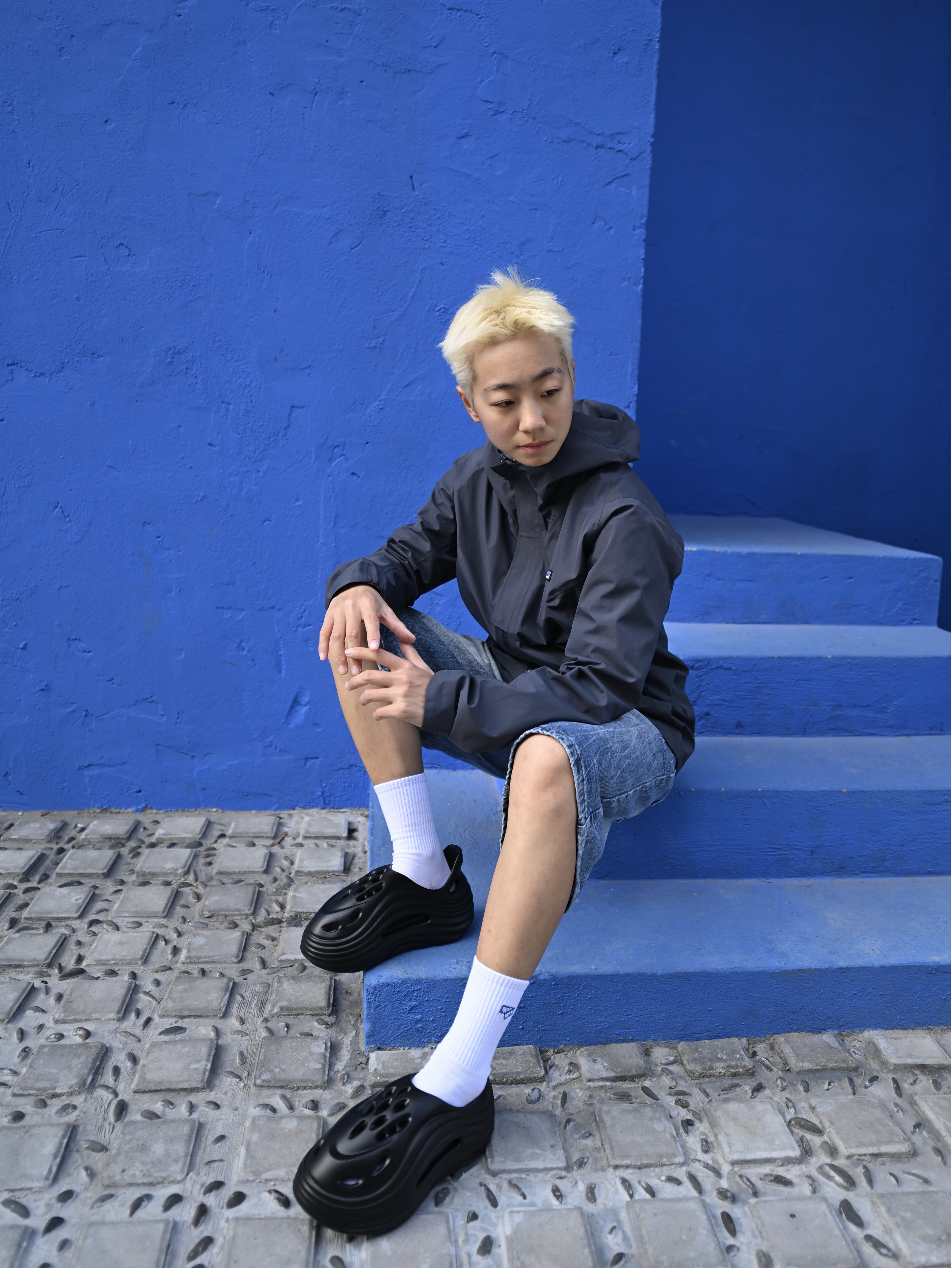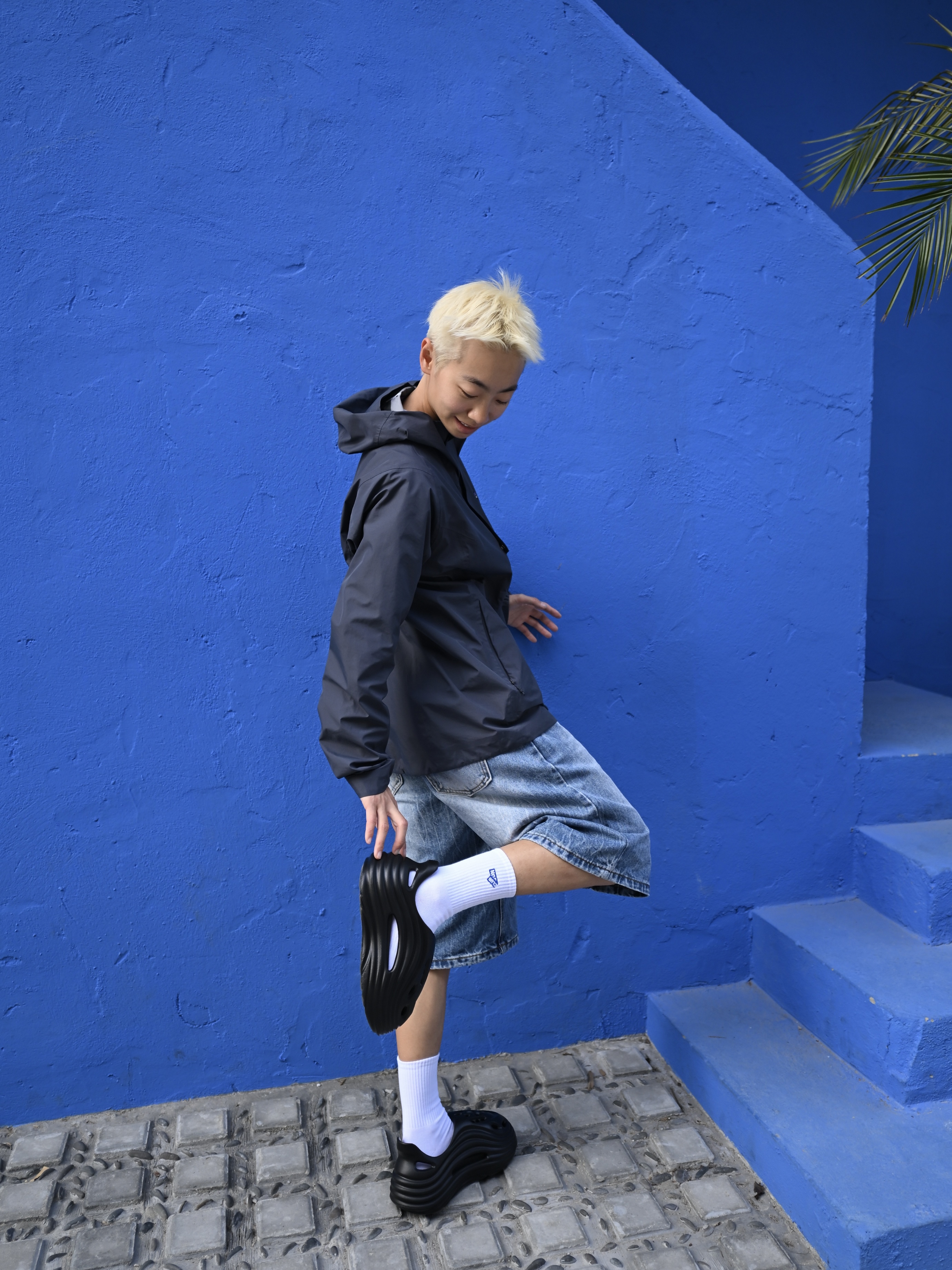 172CM|55KG 👔:m👖:m|👟:39码 🌿春夏街头风穿搭,中性感拉满! 黑色连帽外套+做旧牛仔短裤 白袜提亮层次,搭配亚束外星人洞洞鞋 防滑防臭属性适配日常外穿/居家场景,隐形增高更显腿长~ 💙蓝色墙景作背景,洞洞鞋的酷黑线条与整体造型碰撞出随性氛围 从街头随拍到日常出街,这双鞋轻松hold住松弛感!