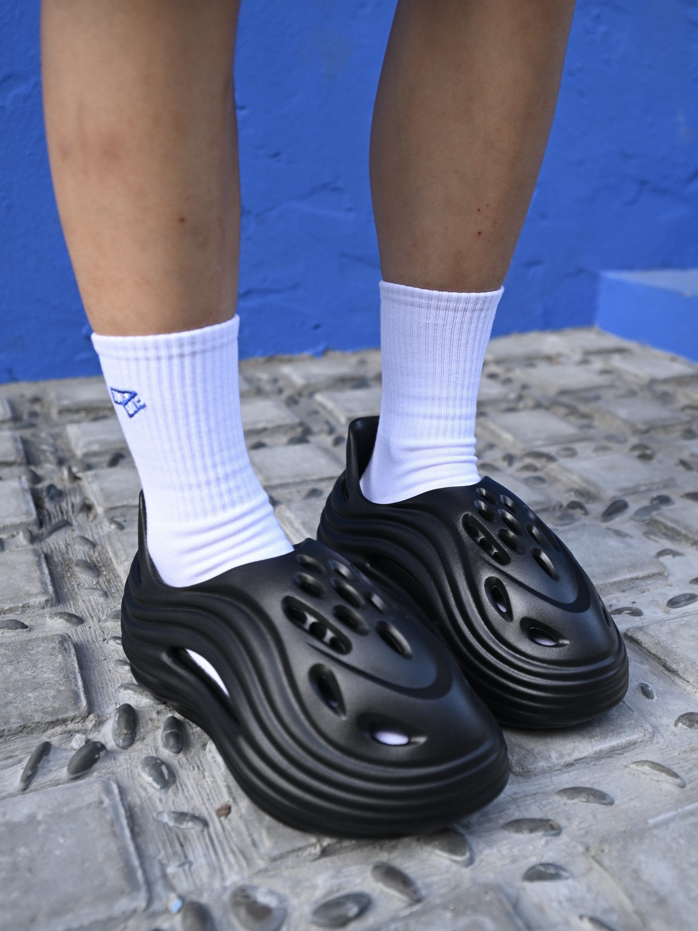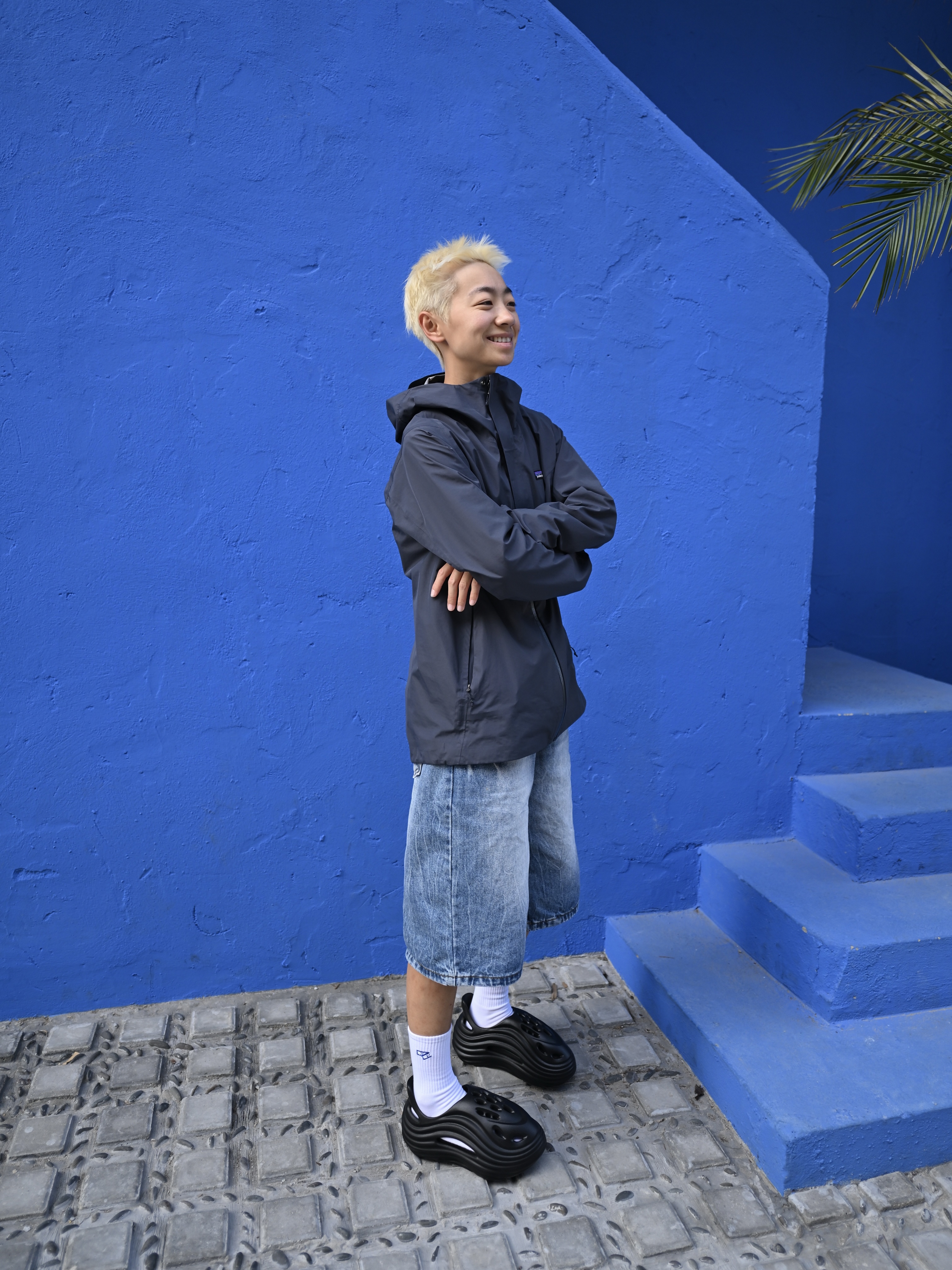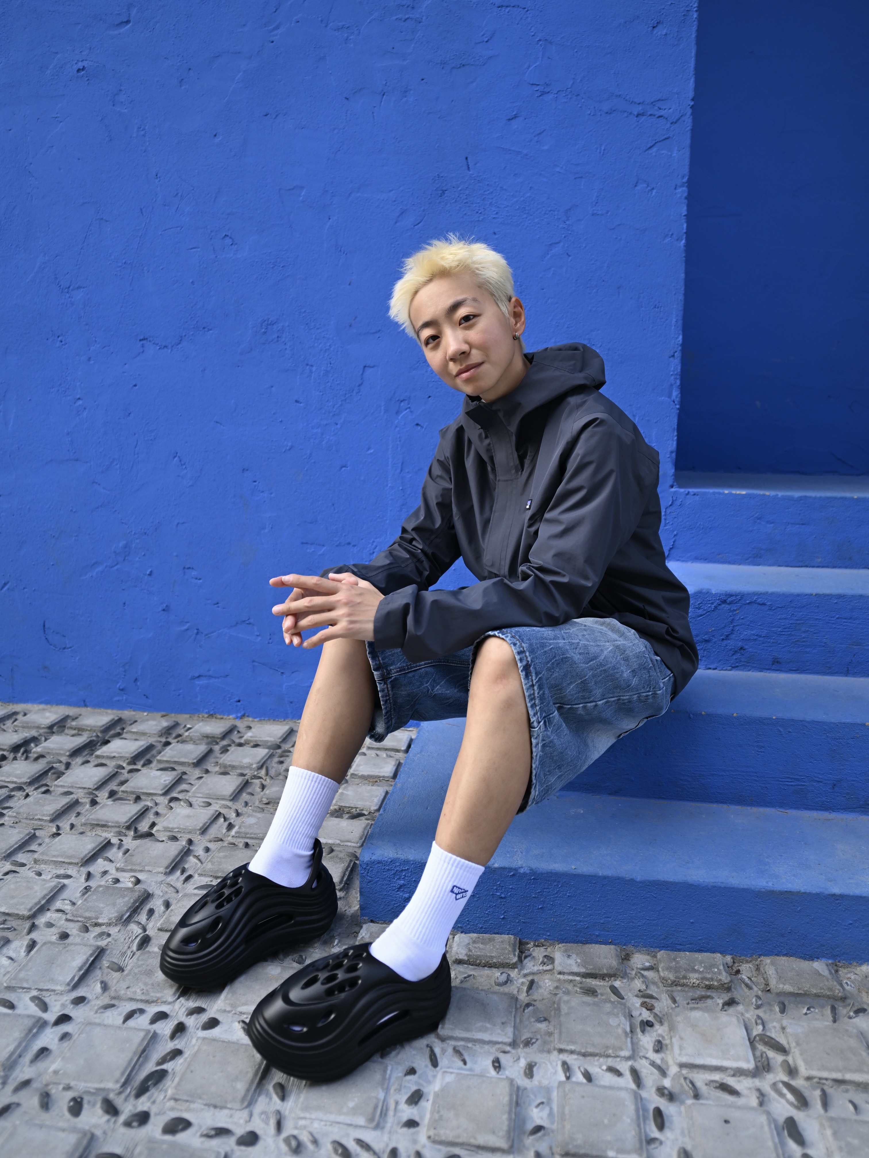172CM|55KG 👔:m👖:m|👟:39码 🌿春夏街头风穿搭,中性感拉满! 黑色连帽外套+做旧牛仔短裤 白袜提亮层次,搭配亚束外星人洞洞鞋 防滑防臭属性适配日常外穿/居家场景,隐形增高更显腿长~ 💙蓝色墙景作背景,洞洞鞋的酷黑线条与整体造型碰撞出随性氛围 从街头随拍到日常出街,这双鞋轻松hold住松弛感!