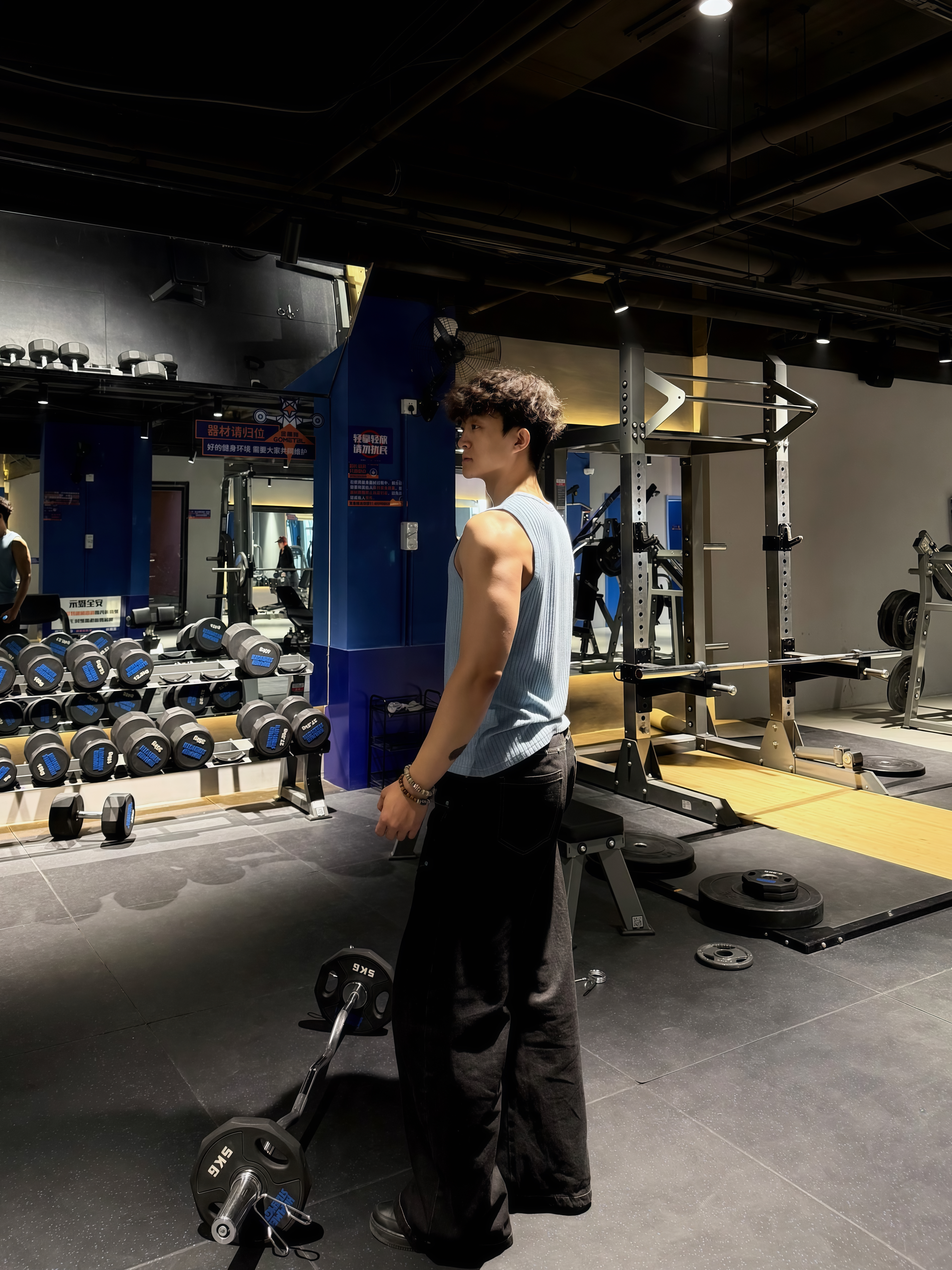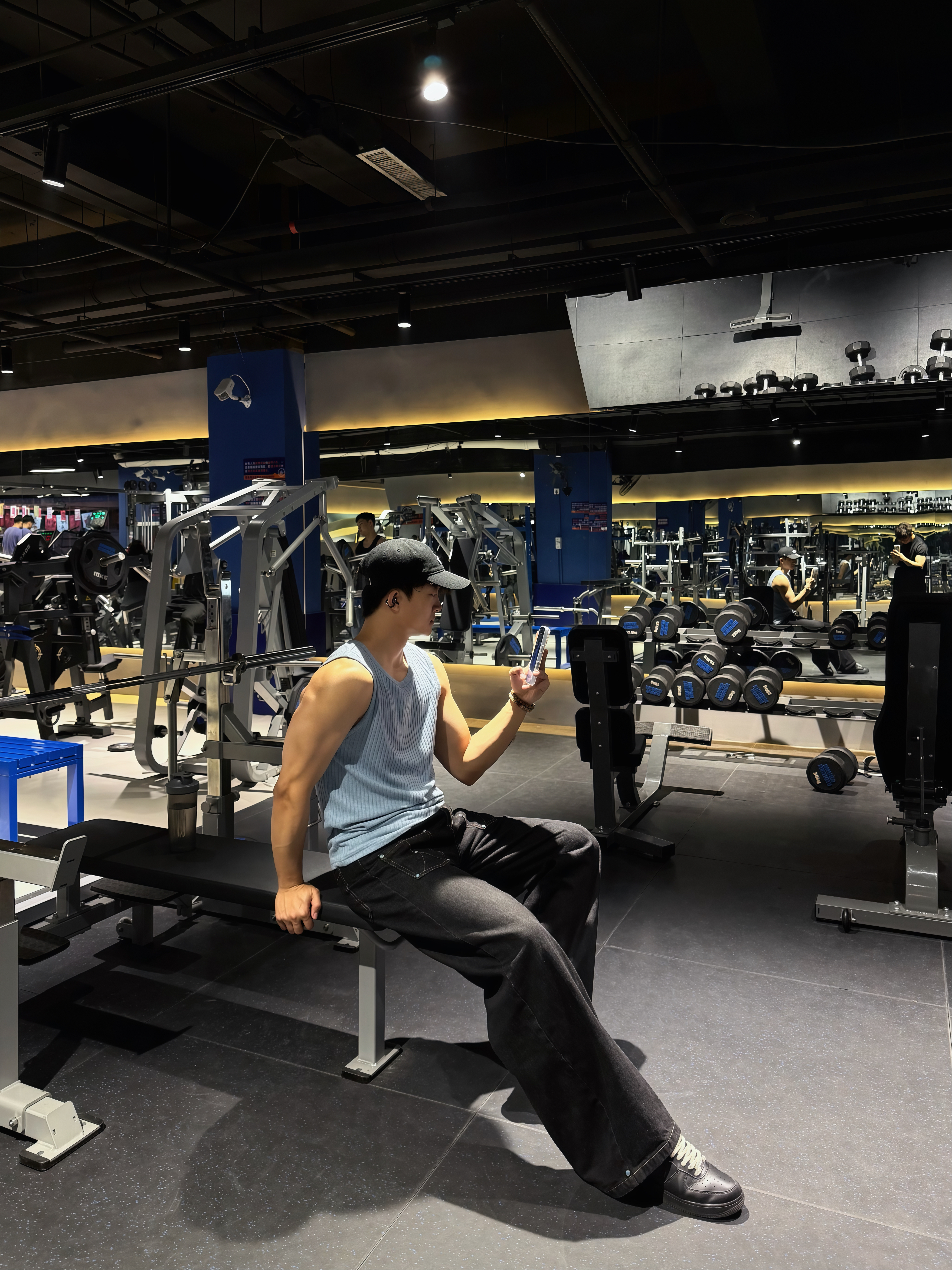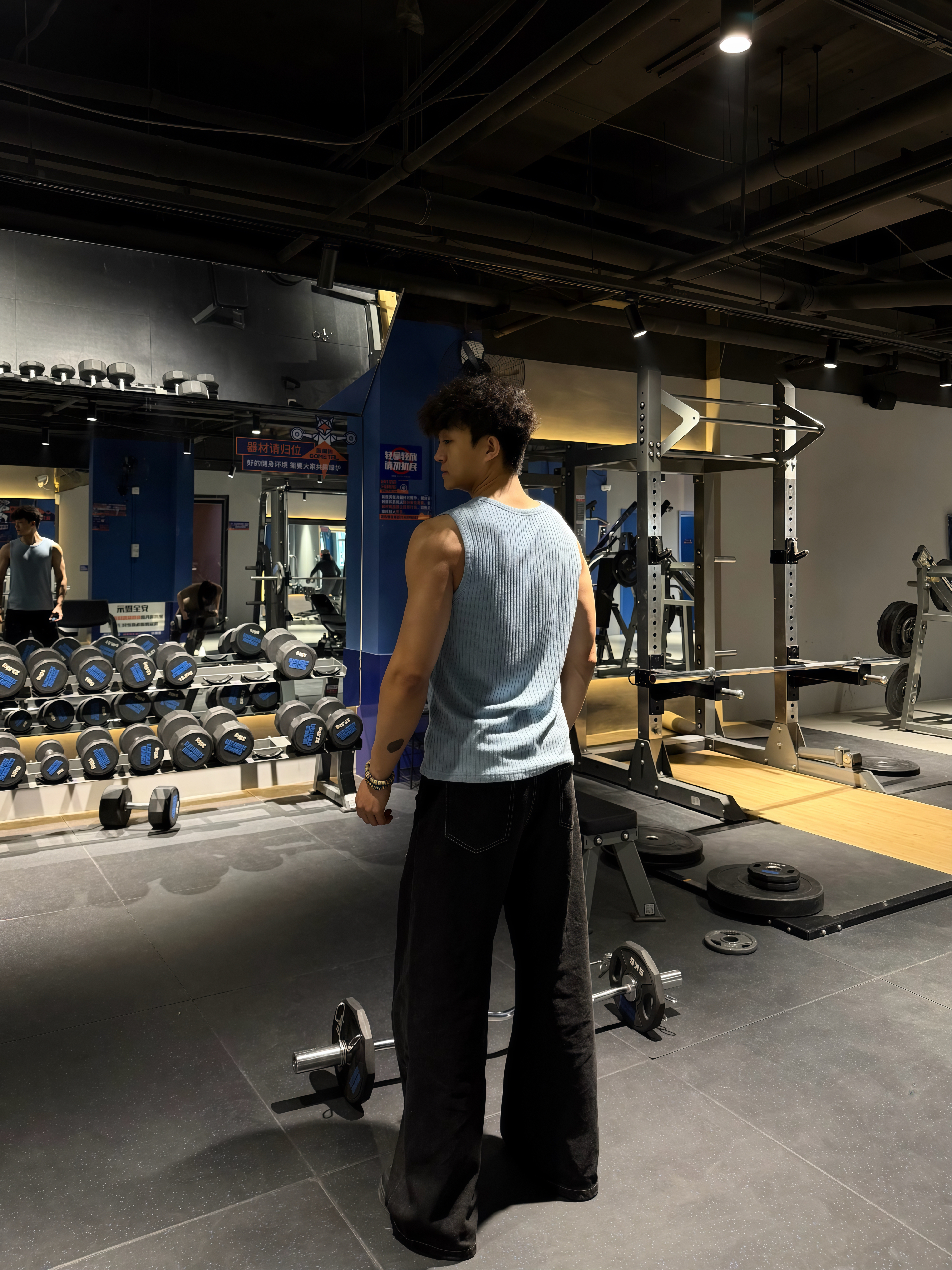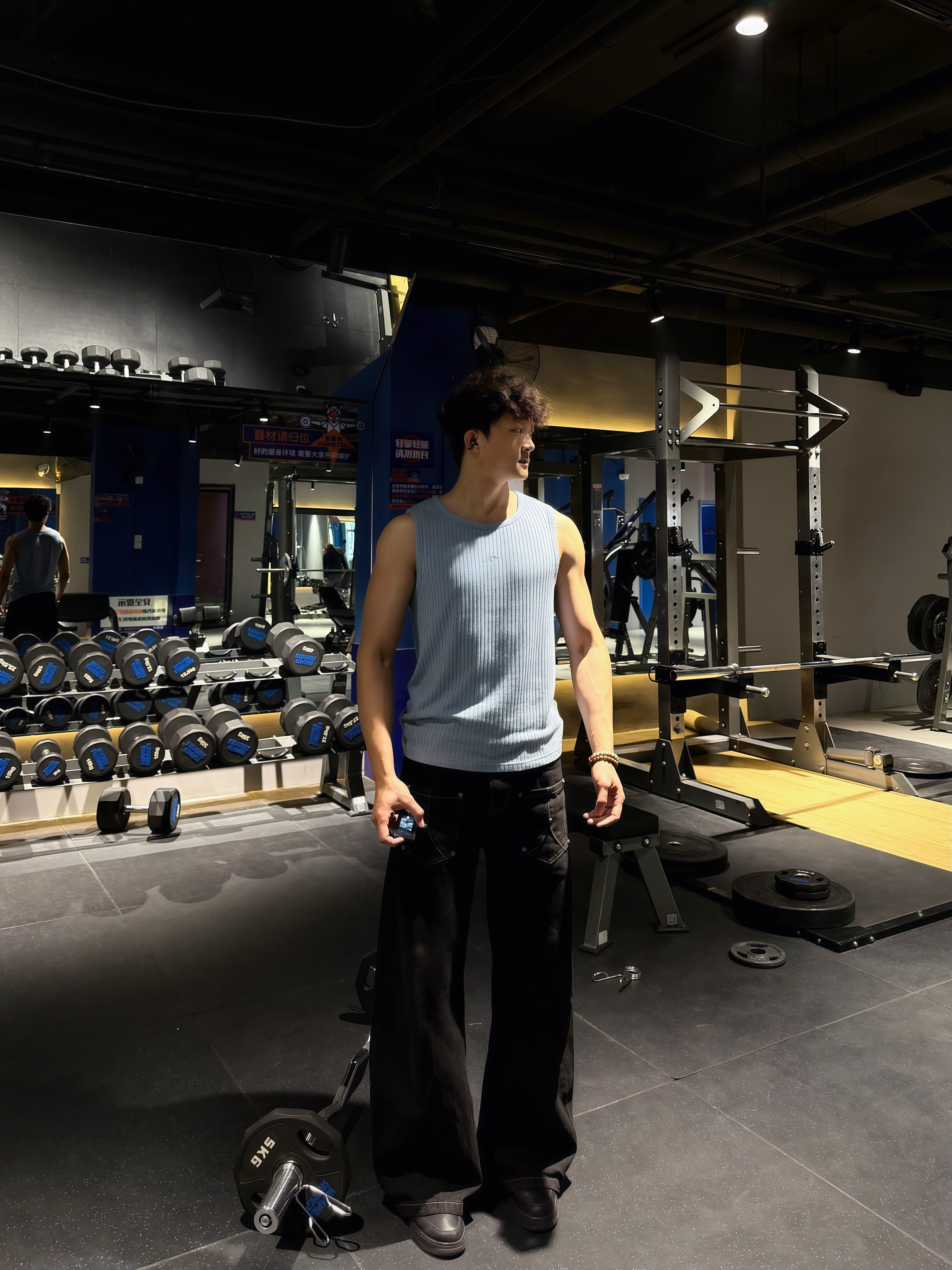 👔这件浅蓝坑条背心太懂健身人了!修身不紧绷,刚好露出练出来的肩背线条,透气不闷汗,健身房穿超合适,日常搭外套也好看。 👖黑灰阔腿牛仔裤yyds!垂感拉满,遮腿型还显腿长,和健身身材适配度拉满,走路带风的松弛感直接拉满。