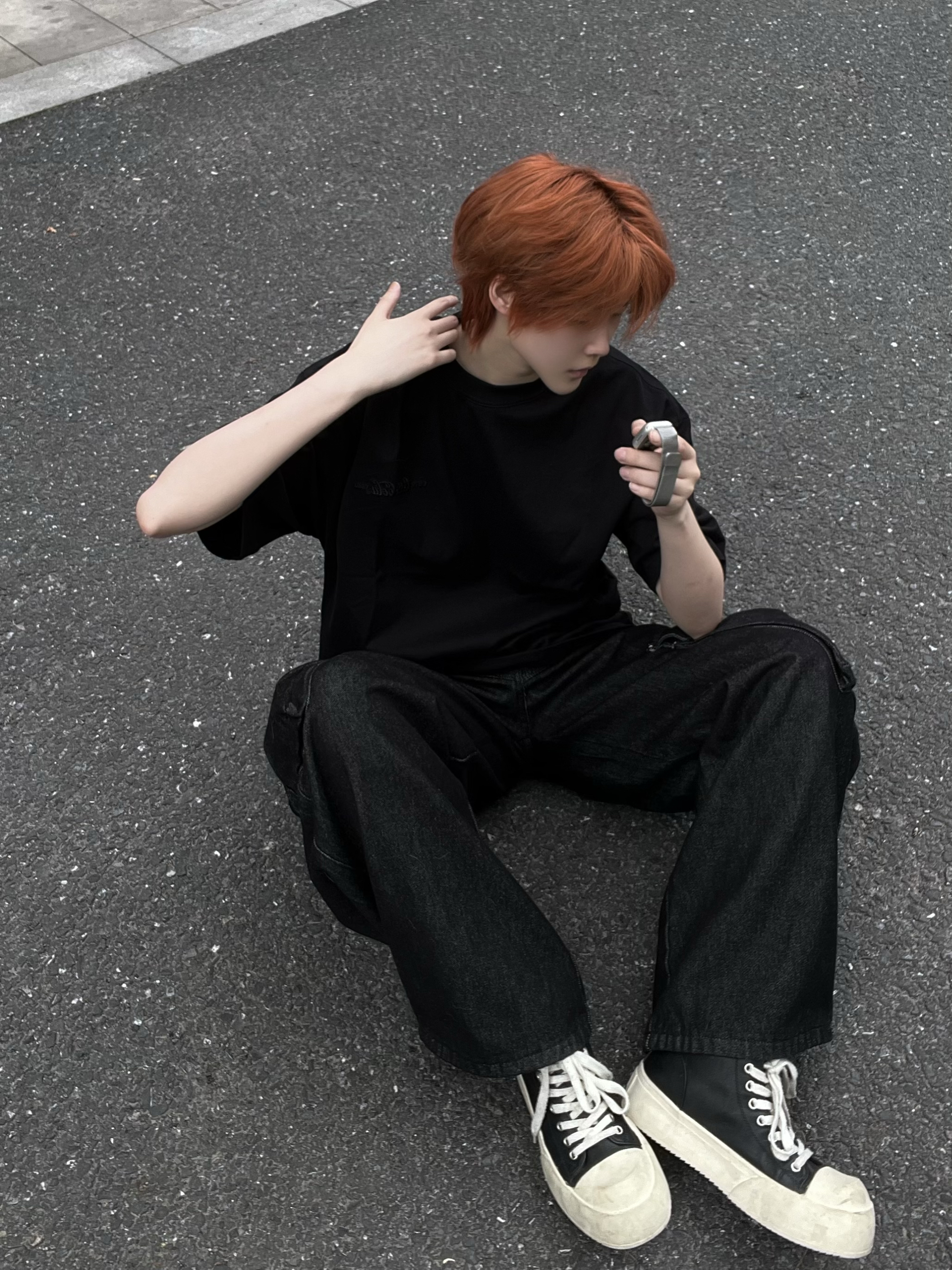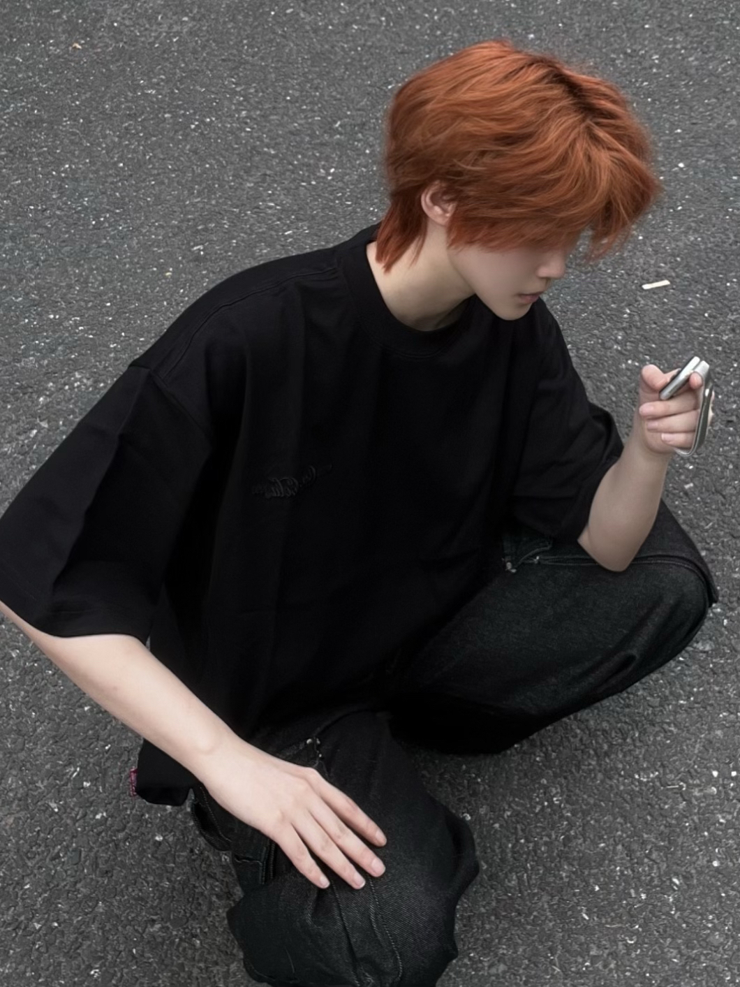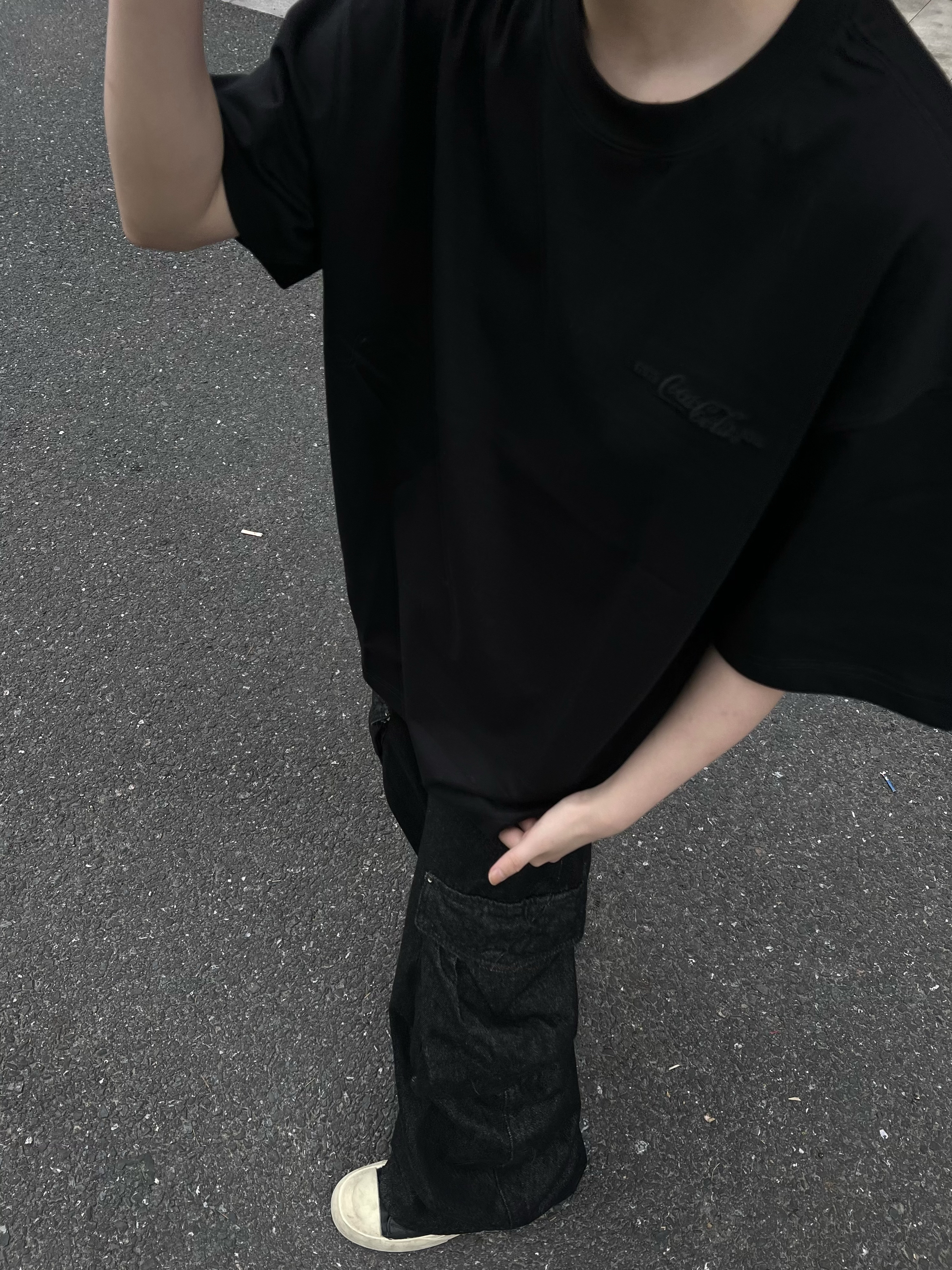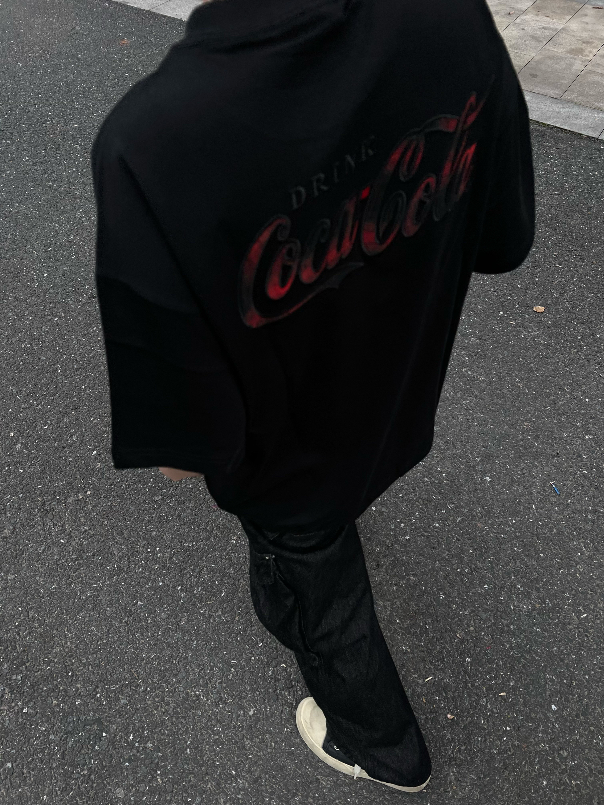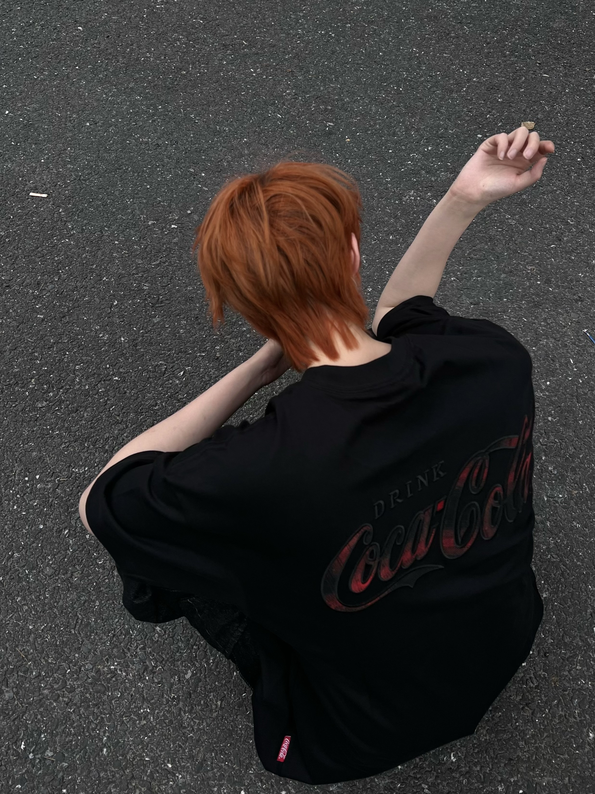谁懂啊!这件可口可乐T恤直接戳中我心巴✨ 正面是低调的暗纹logo,背面的红黑渐变印花一整个帅住,细节感拉满又不会太张扬。 全黑的oversize版型,搭一条黑牛仔工装裤,上宽下宽的搭配,把慵懒和酷感焊在身上。 红棕发色和衣服上的红色印花撞色呼应,整体调性直接拉满,又酷又随性。