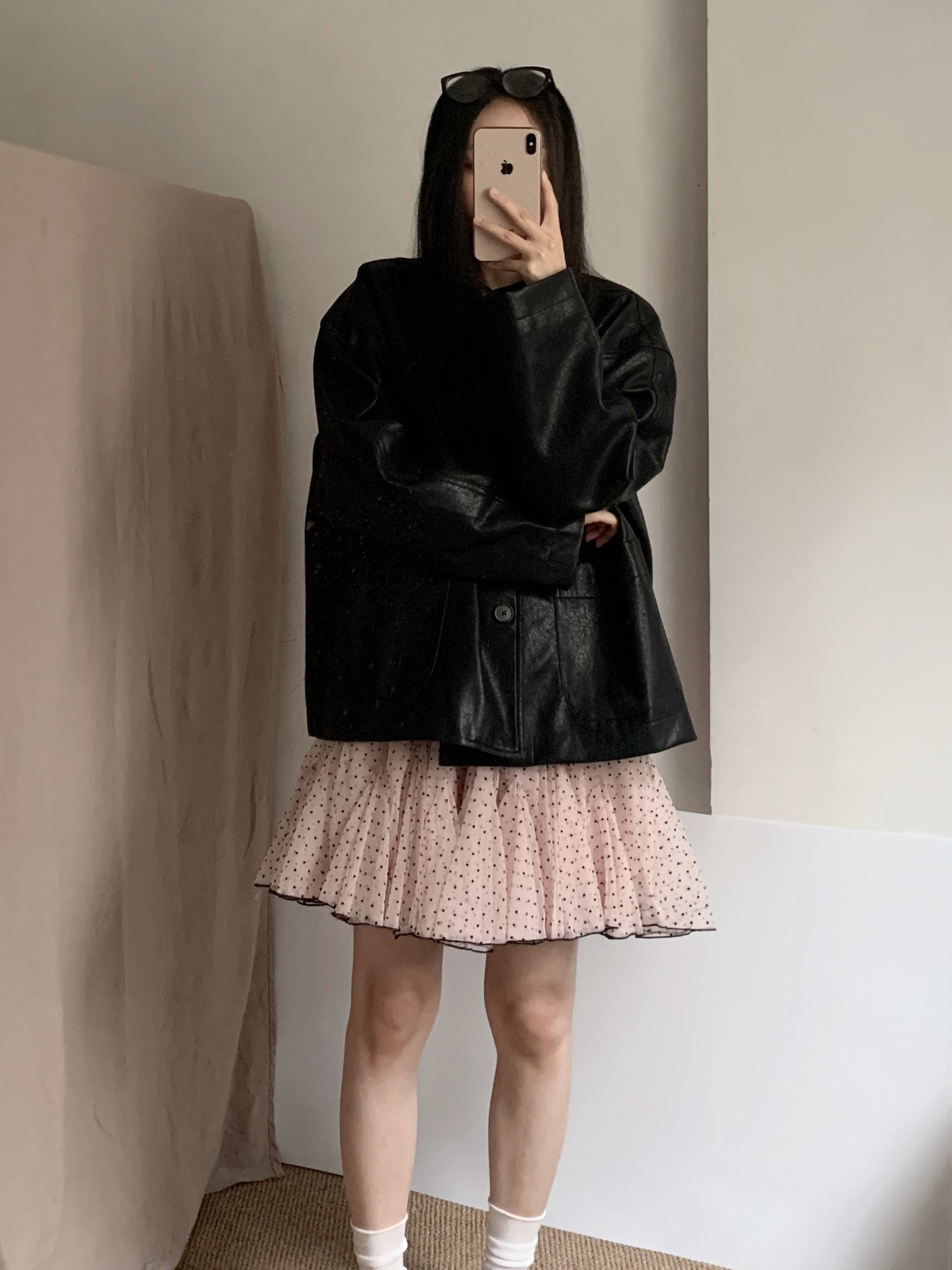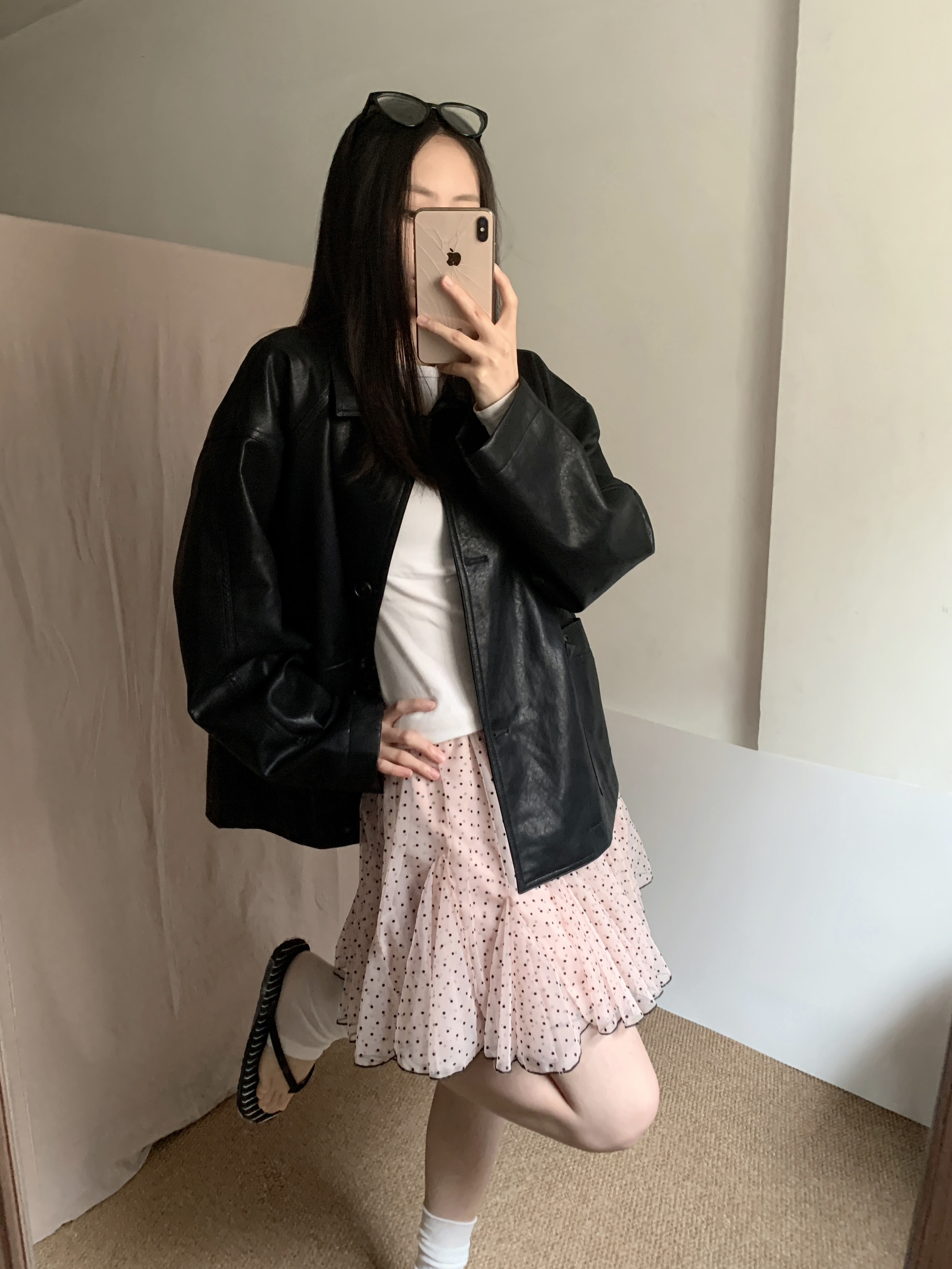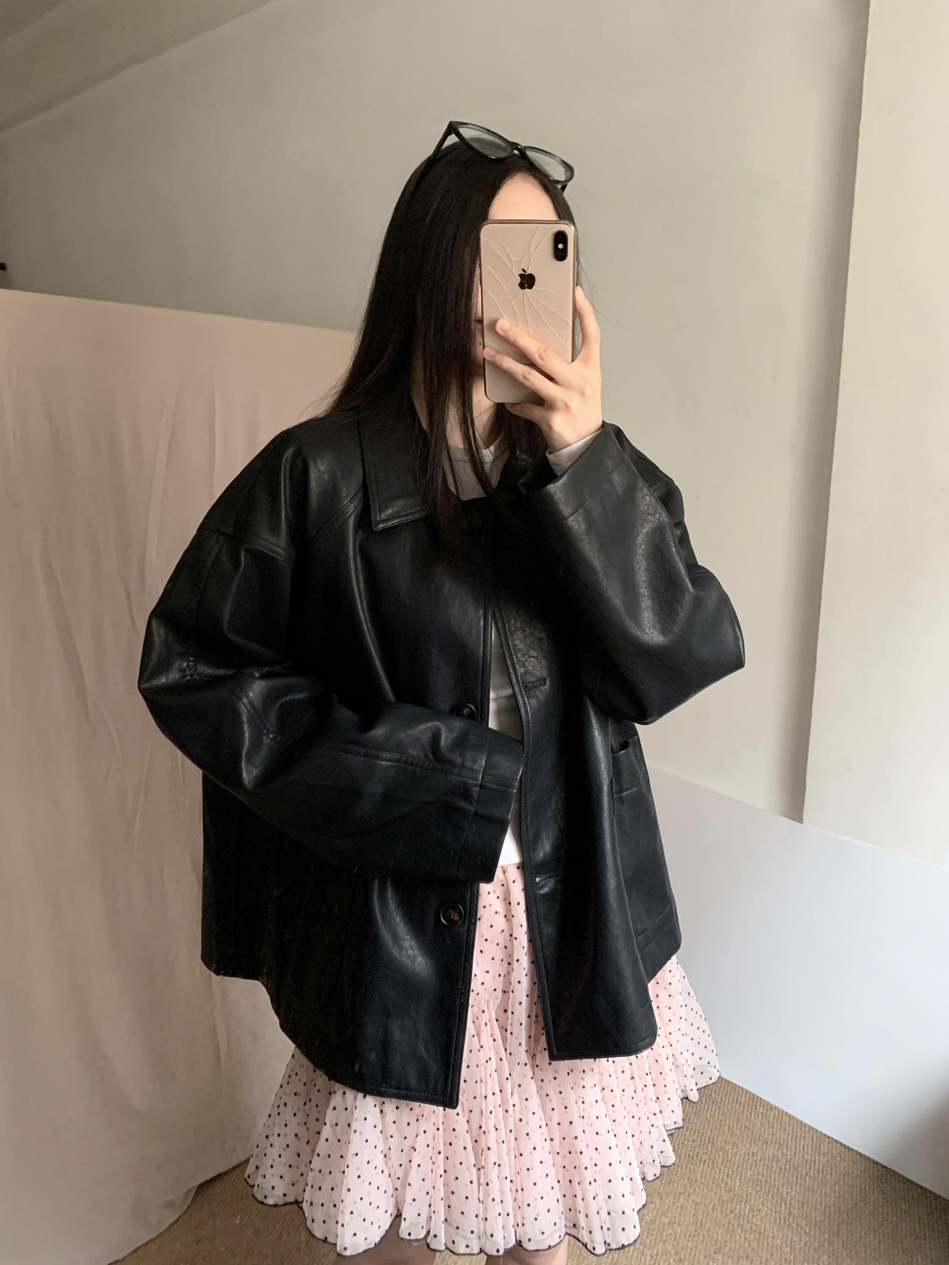 Oversize黑色皮衣太绝了!宽松版型自带松弛感,皮质面料酷飒感拉满,单穿叠搭都合适,秒变拽姐。搭配粉白波点网纱蓬蓬裙,甜妹感直接拉满,蓬蓬裙摆藏肉显瘦,甜酷反差感直接封神! 墨镜一戴氛围感拉满,日常出街、约会穿都超合适,拍照巨出片,甜妹辣妹一键切换,小个子闭眼冲!