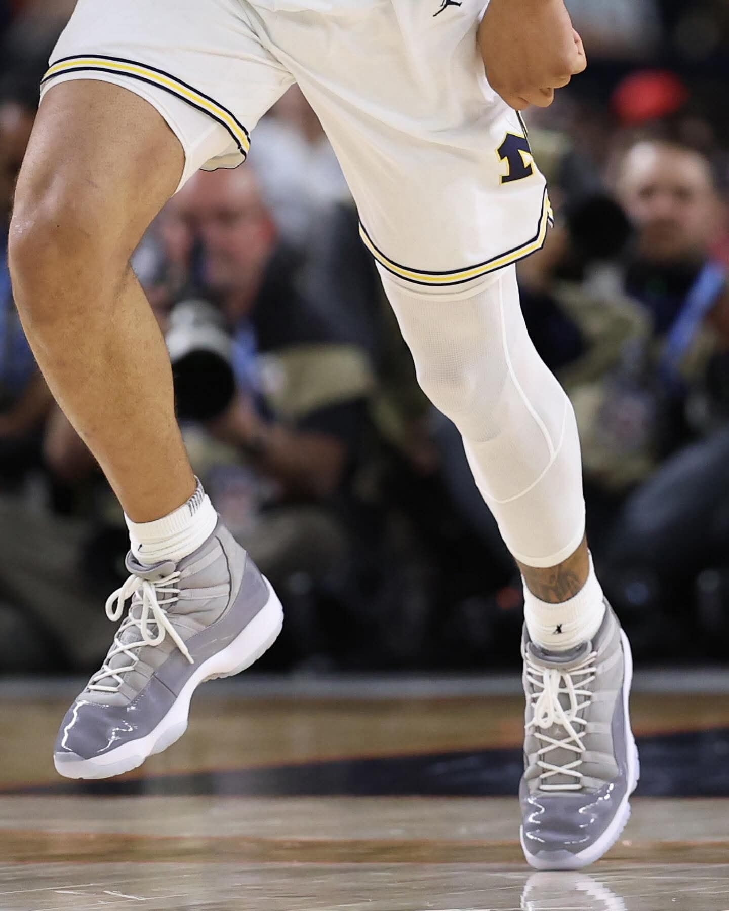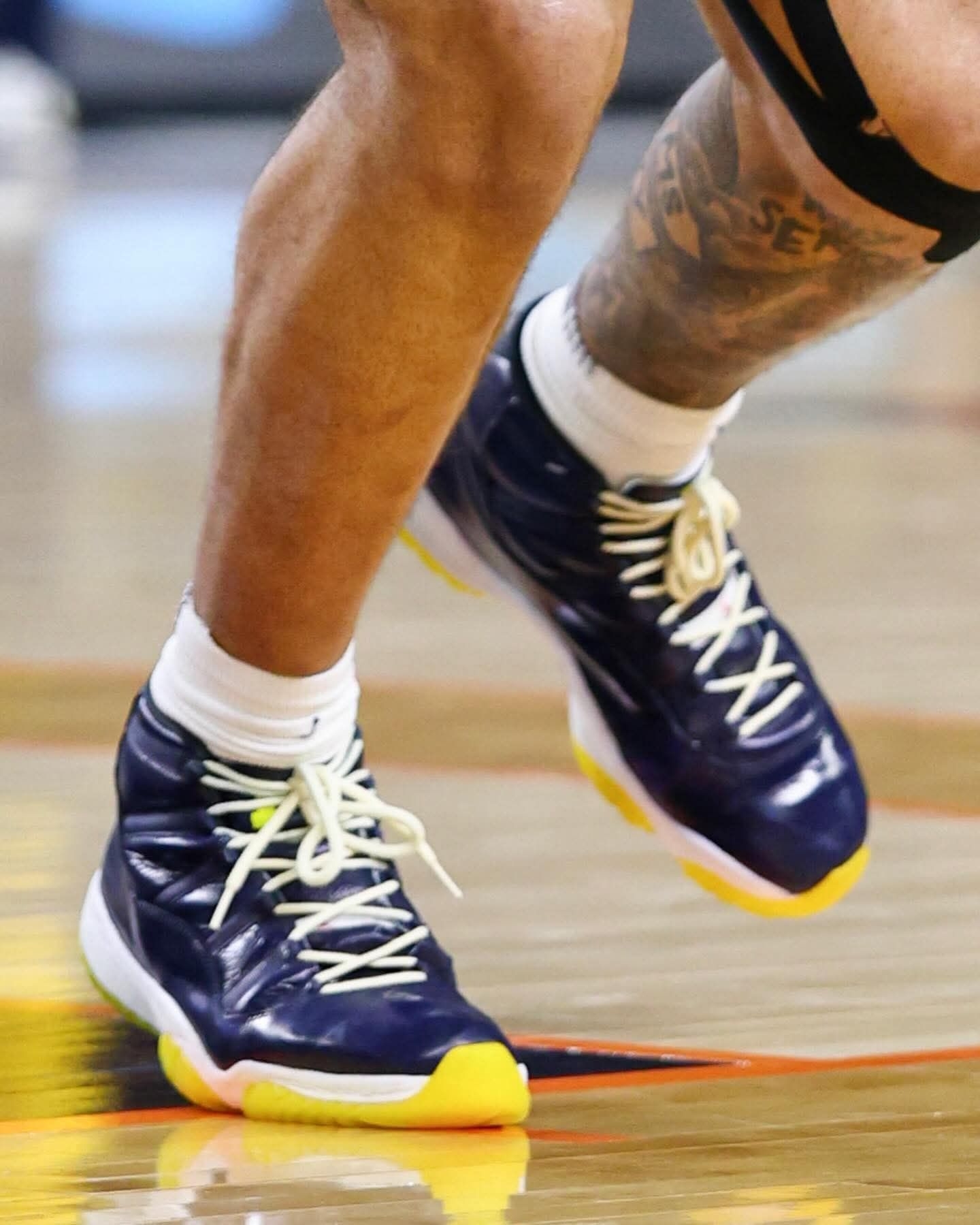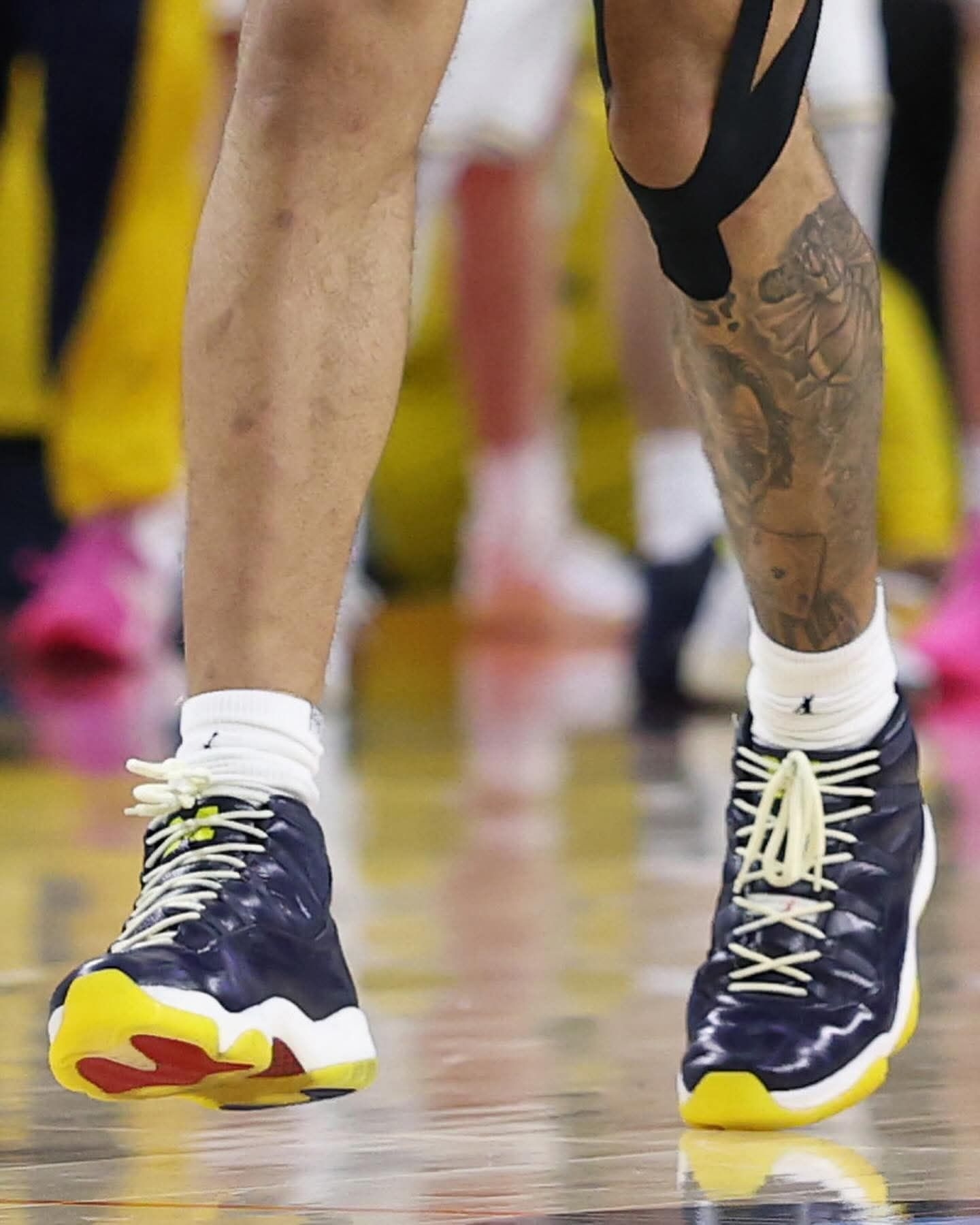 密歇根大学球员Yaxel Lendeborg,在NCAA决赛上脚专属定制AJ11! 藏蓝主色+密歇根黄点缀,完美呼应球队主场配色,鞋舌细节直接拉满 AJ11经典鞋型+大学专属定制,把大学篮球的热血与情怀穿在脚上 这才是NCAA赛场的专属浪漫,每一双定制鞋都是球员的信仰