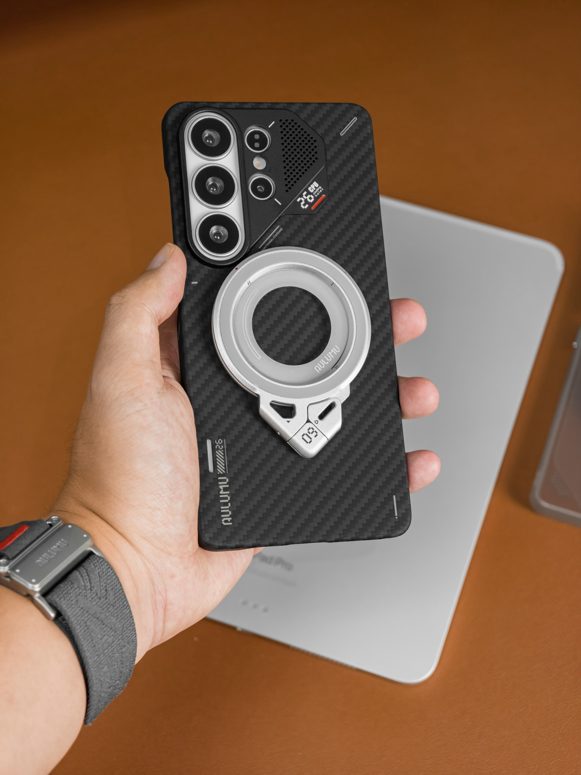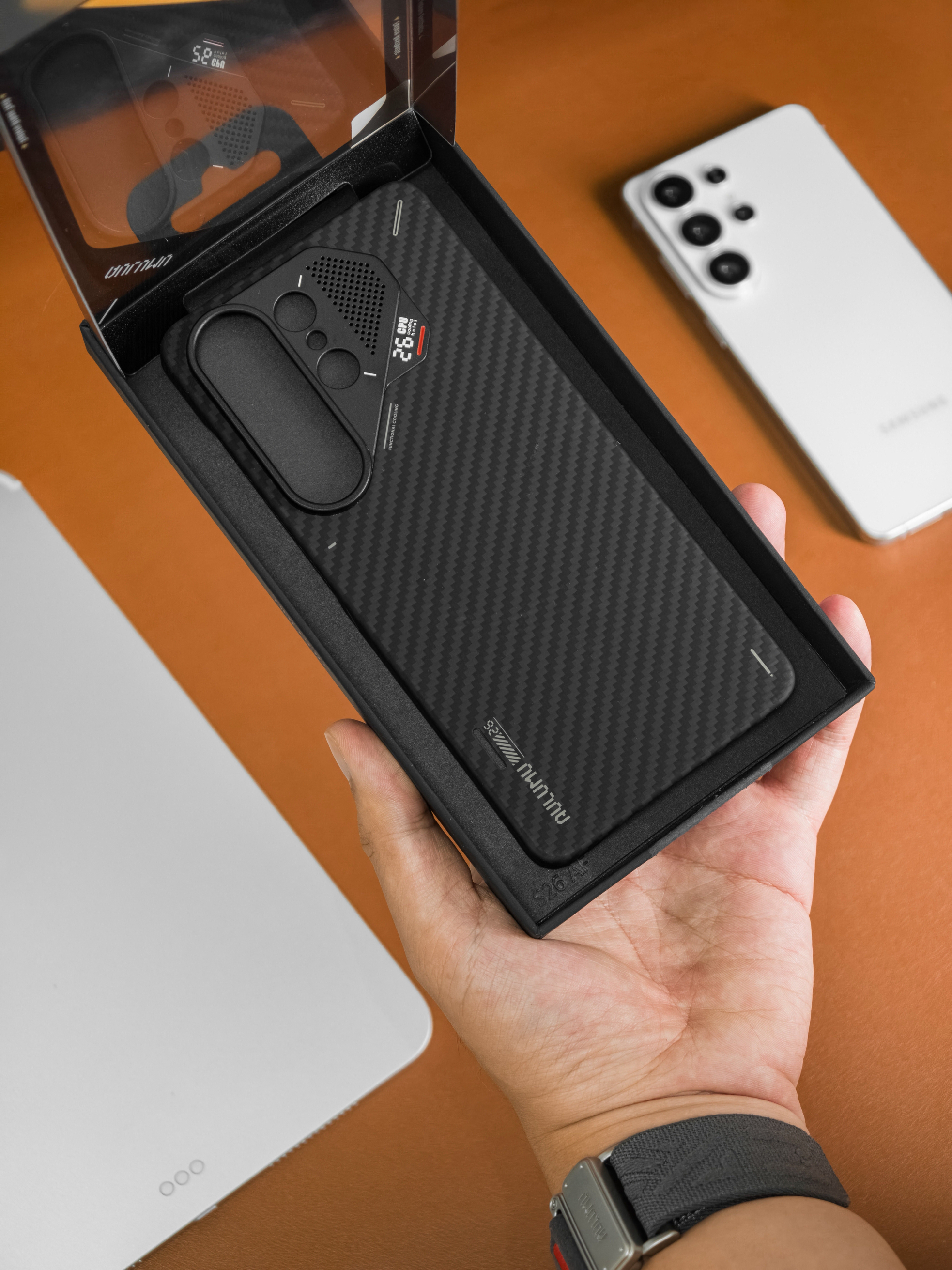 27g轻薄款芳纶纤维保护壳,上手如同裸机般的感觉,不压手,无额外重量负担,手感细腻的触感,爱不释手。搭配散热结构——散热硅胶垫+蜂窝式铝合金散热孔,有效降低已进入超负荷状态的机身温度,内置感温变色指示条,通过颜色变化,直观反馈机身温度,状态一目了然。 全包的TPU材质雾透手机壳,360°全方位保护机身,防摔实力拉满,肉眼看的见的安全感。侧边框带有精心设计的凸起小点,增加握持时的摩擦力,有效防滑。...