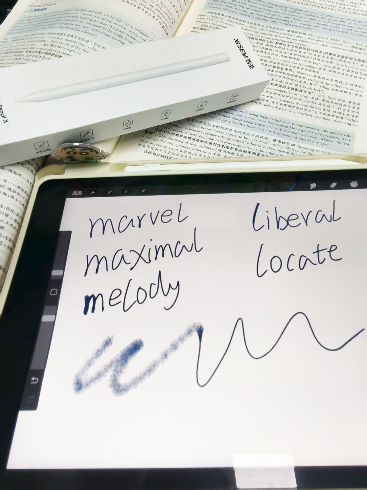 刚到的西圣电容笔,这回总算没踩坑了😁,手感嘎嘎好,有点磨砂的感觉,而且很轻,拿着跟一支铅笔差不多,写字就如图上哈哈哈,我在板子上写完脑子里只有一个念头:好丝滑😀,而且它的倾斜压感还蛮灵敏的,就是你看那个线条粗细变化特明显,还是好多快捷功能咧,哇真的100多这个价格就是牛的哇👍。
