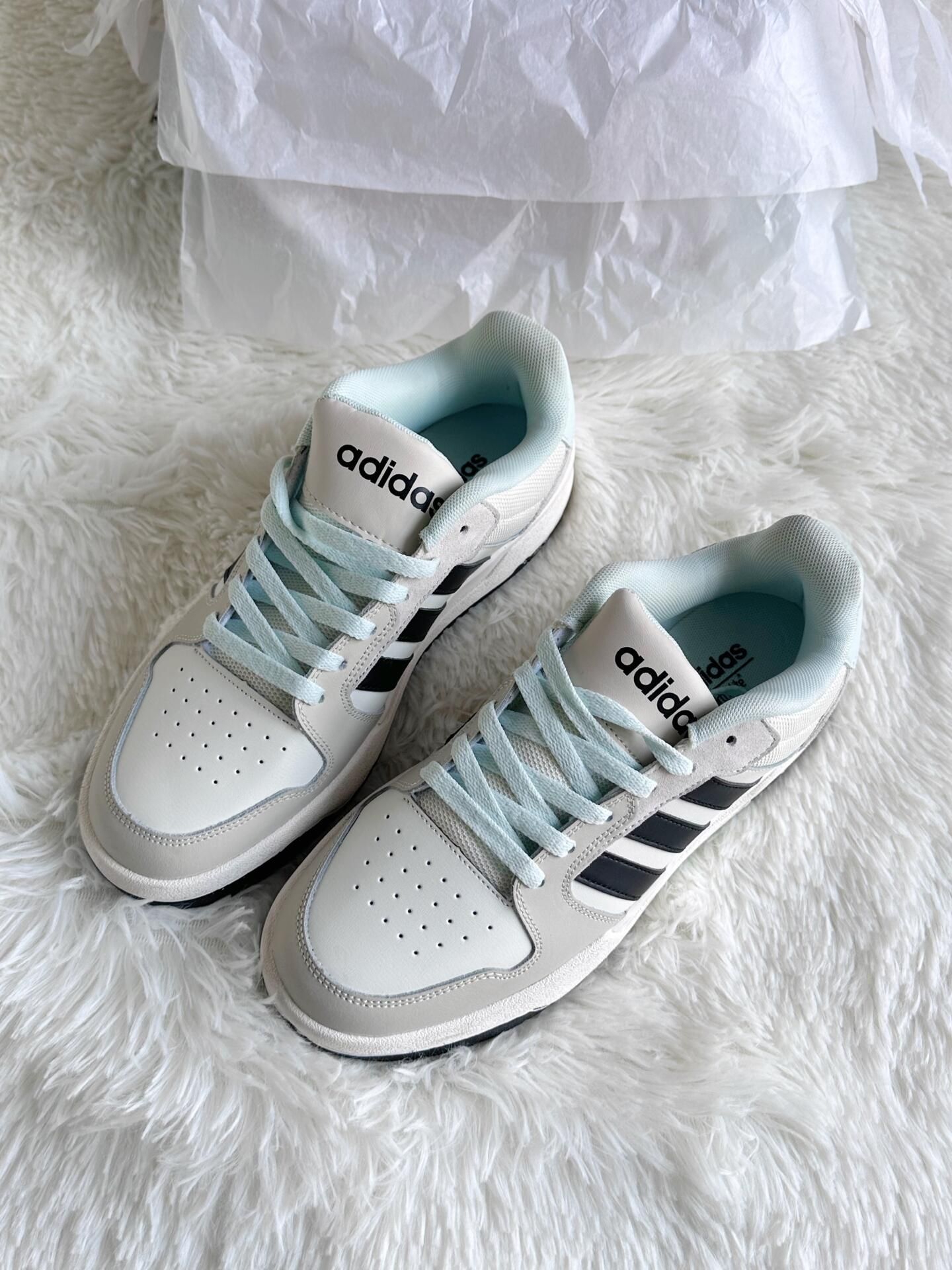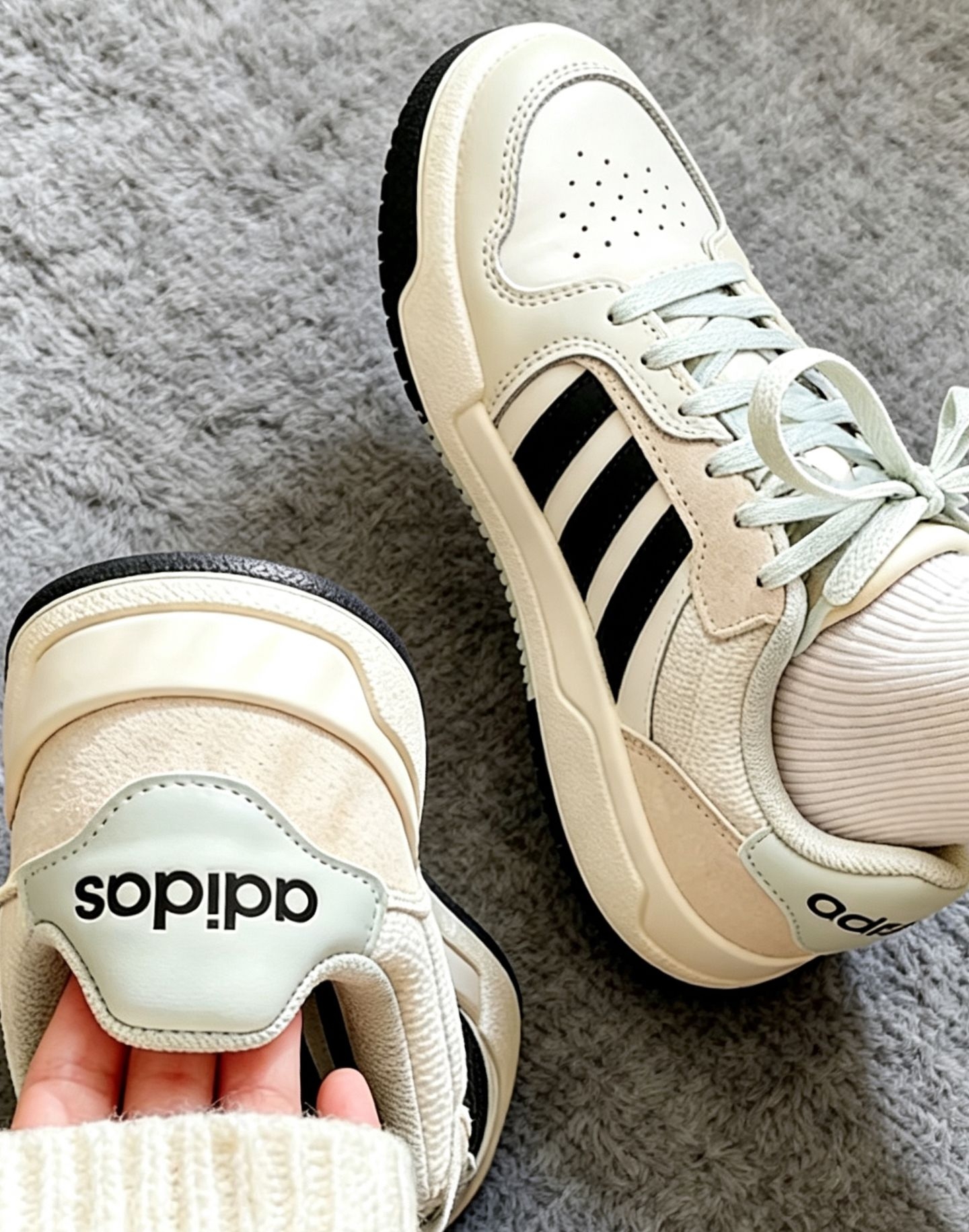 被问爆💥 这双阿迪奶油板鞋才是通勤王! 正文:|||🔥 爆款开箱风(适合首晒,强调颜值与性价比 家人们谁懂啊!在得物挖到的宝藏小白鞋👟 奶油白拼浅灰+经典黑三条杠,这个配色真的温柔到骨子里✨ 皮质鞋面很有质感,不是那种廉价的塑料感,越看越高级。 低鞋帮设计显腿长,小个子姐妹直接冲! ✅ 颜值:奶油风百搭,配裙子裤子都好看 ✅ 脚感:鞋底软弹,暴走一天不累脚 真的是近期买到最满意的一双!已经焊在脚上...