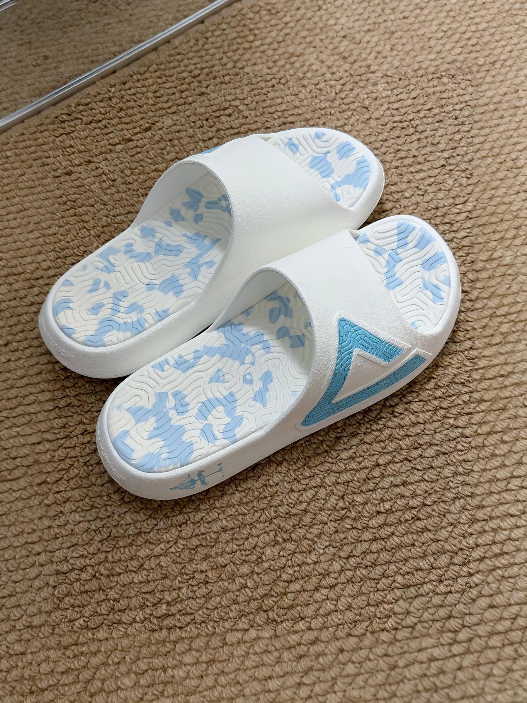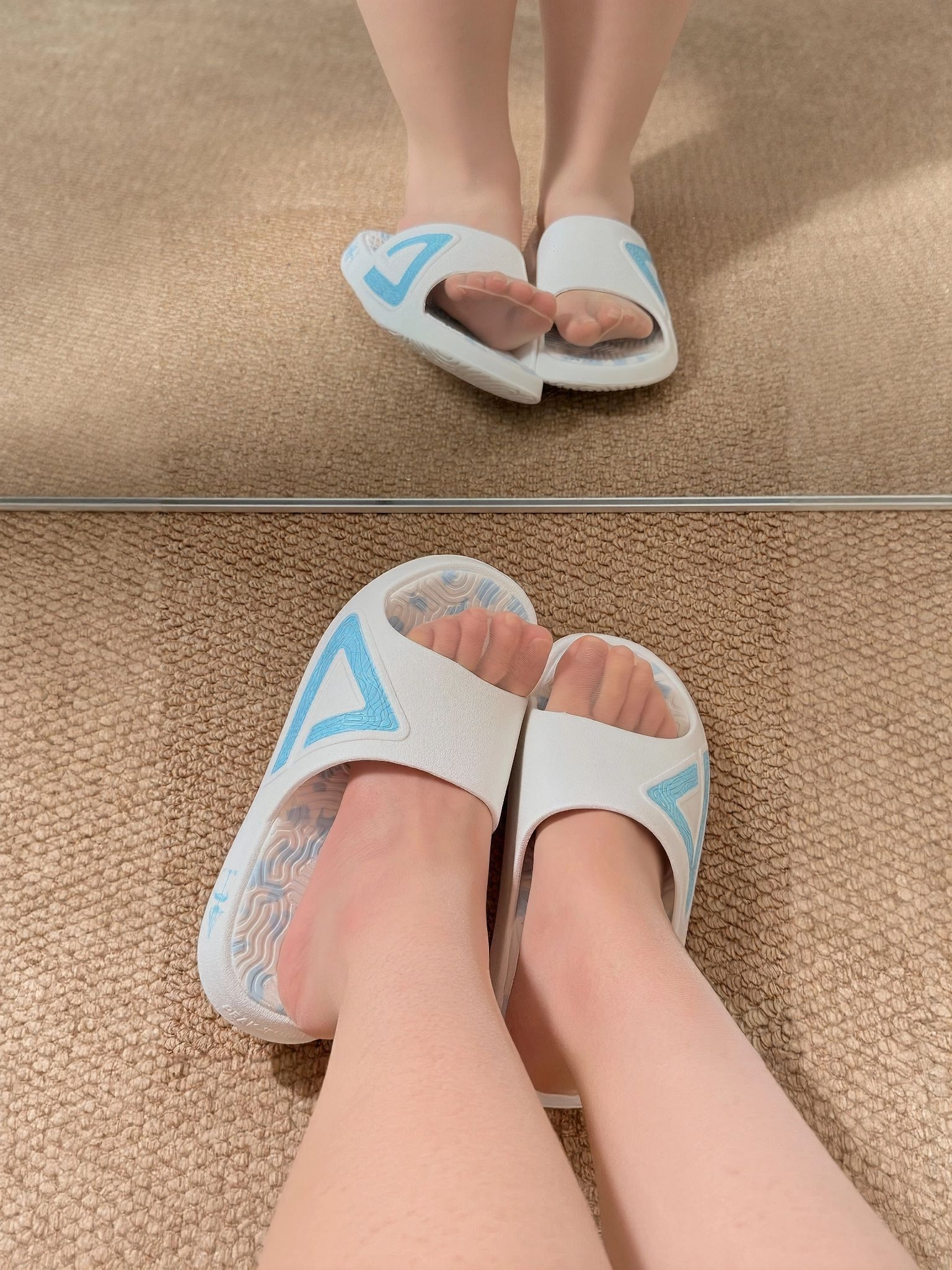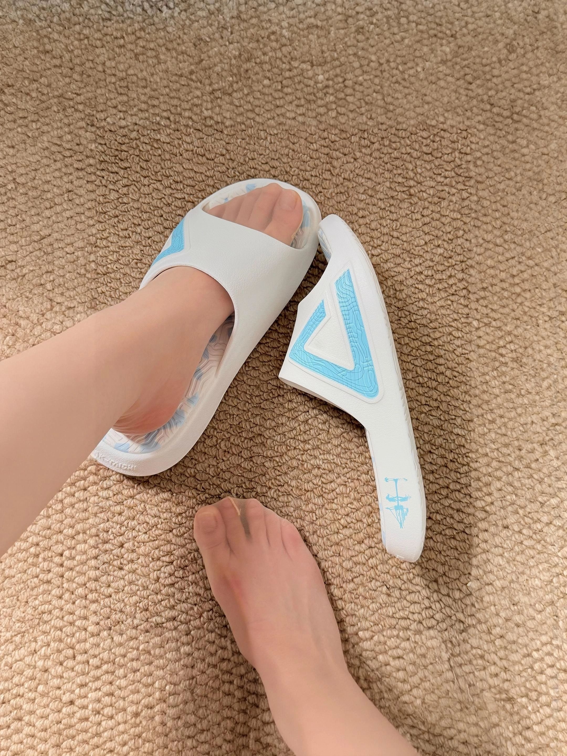 反季买太香了~ 蓝白配色夏日清爽感具像化~ 鞋面是加宽设计 脚感也不错踩着软软的 可以在室内穿也可以穿出去 建议平时搭一些浅色系的衣服 尊嘟很好看哦