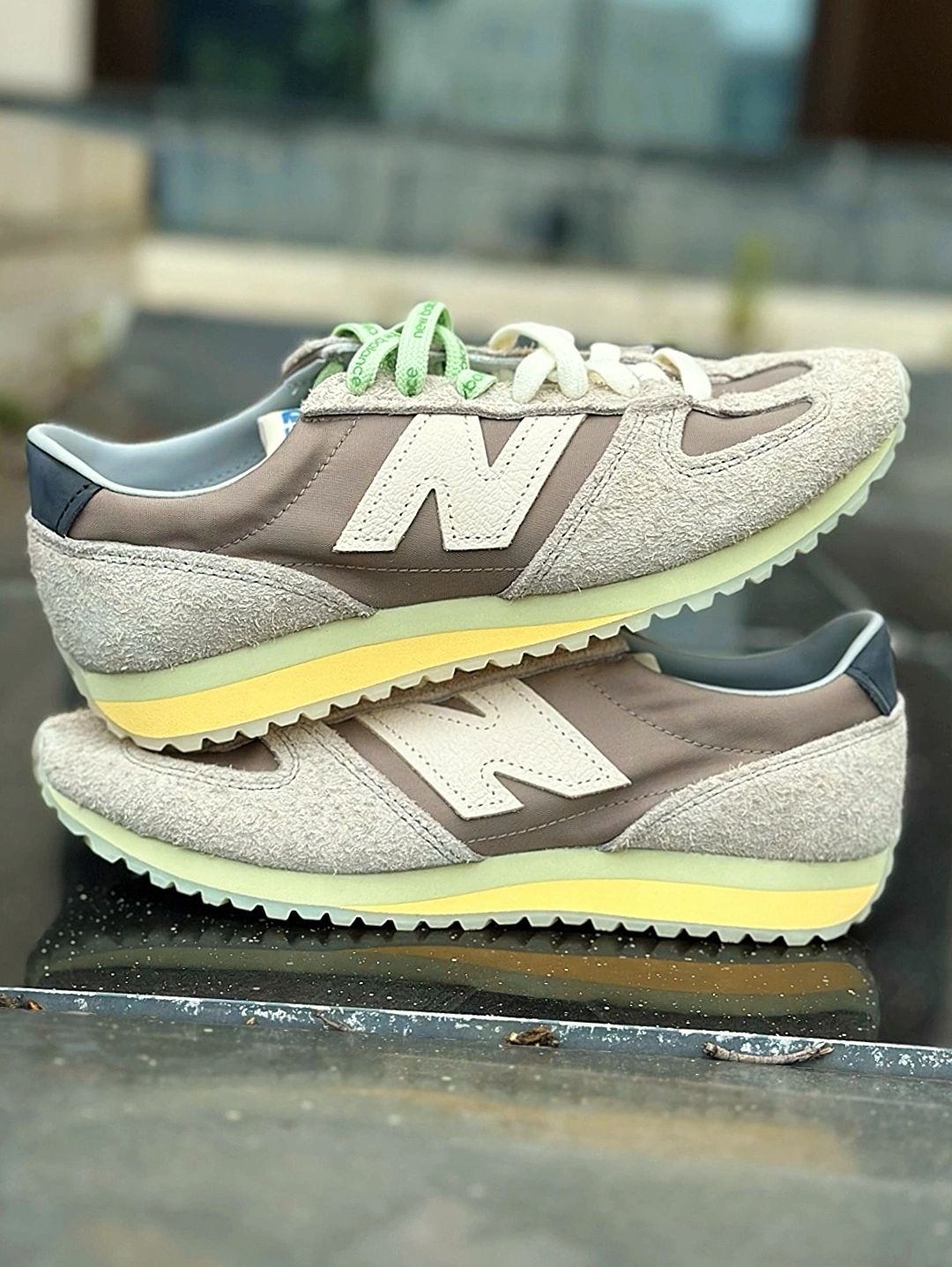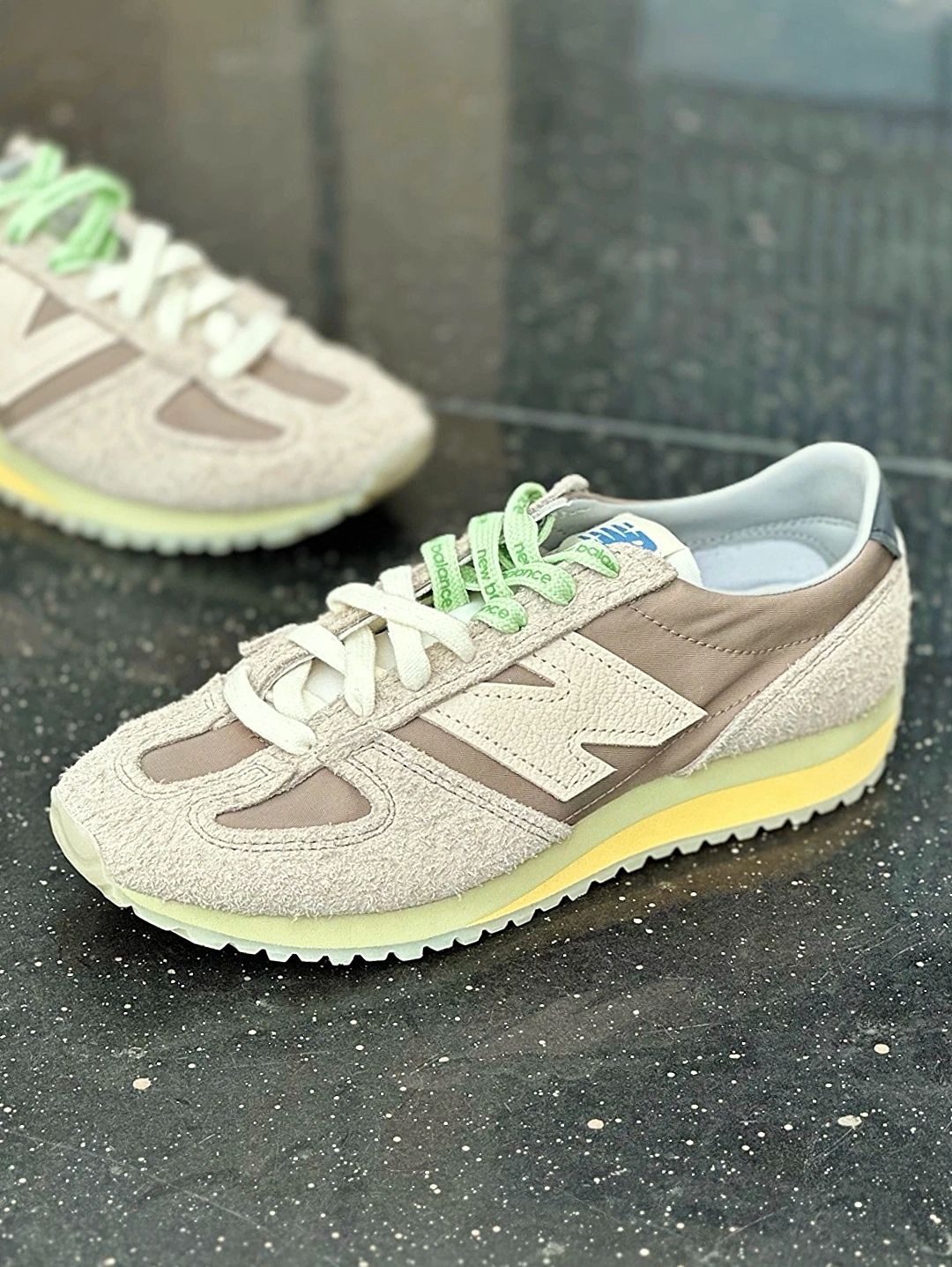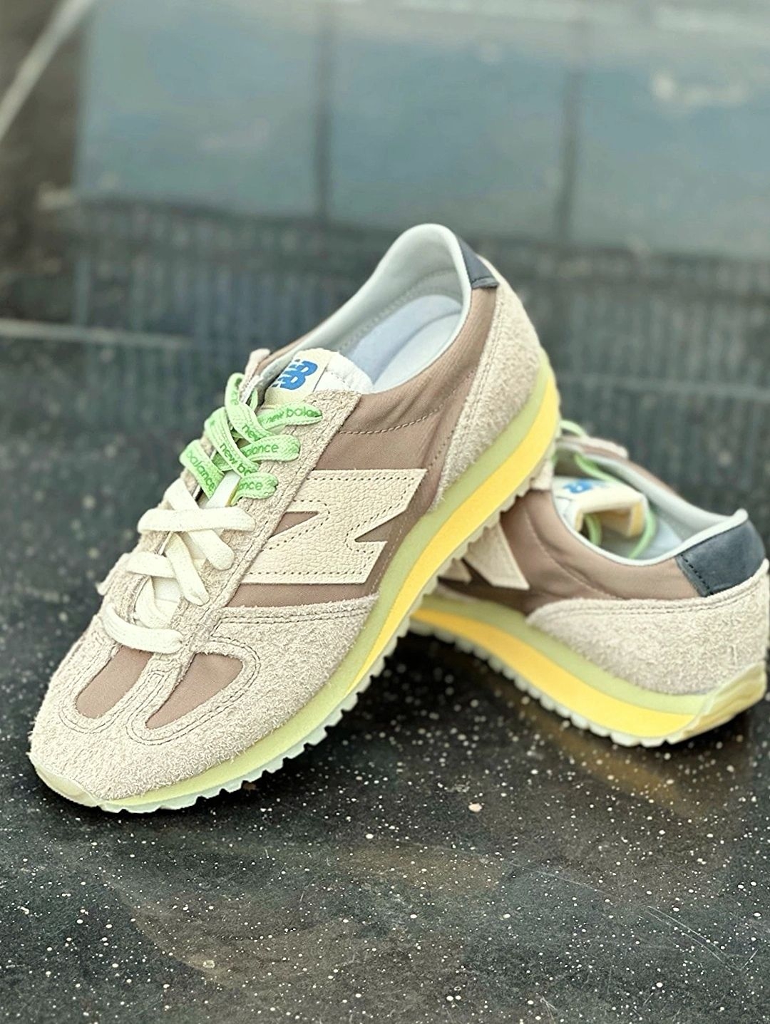 双色鞋带很清新的感觉🍥 而且可以 DIY 出不同的系法 搭配出不一样的感觉! 三层颜色的鞋底,棕色系配色 整个鞋面都是用的翻毛皮的材质 脚感也不错,不说踩屎感但也算比较舒服的! 穿搭很百搭,而且越看越耐看!比较经典! 刚入手的时候🌳,我开心的穿着它在操场上走了一大圈,搭配我穿的粉色运动服,整体看起来很有活力,朋友也夸我的鞋子好看。这双鞋穿在脚上一点也不觉得累脚