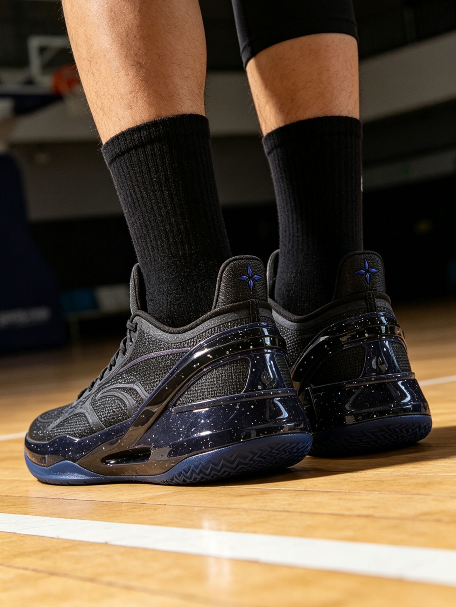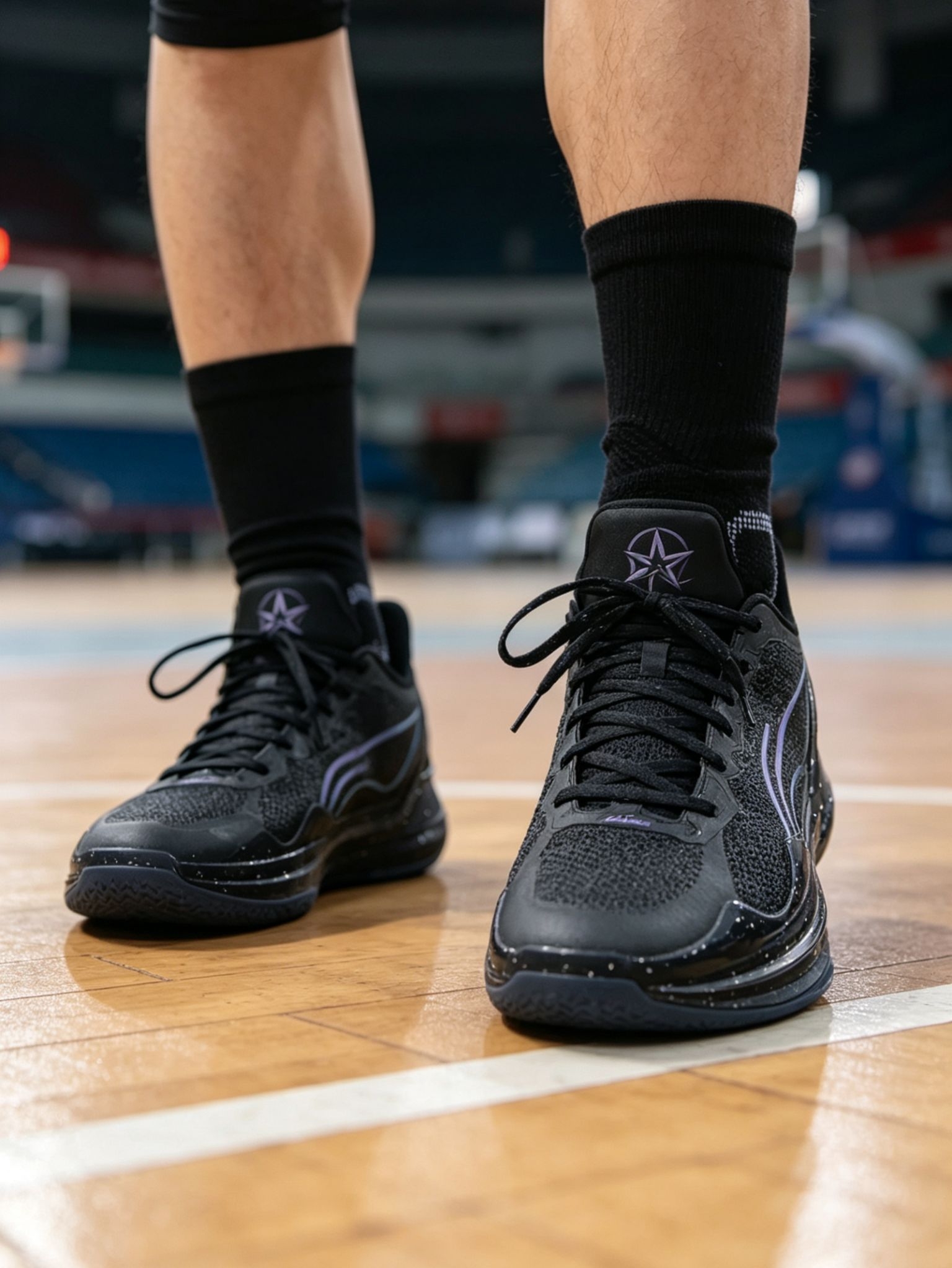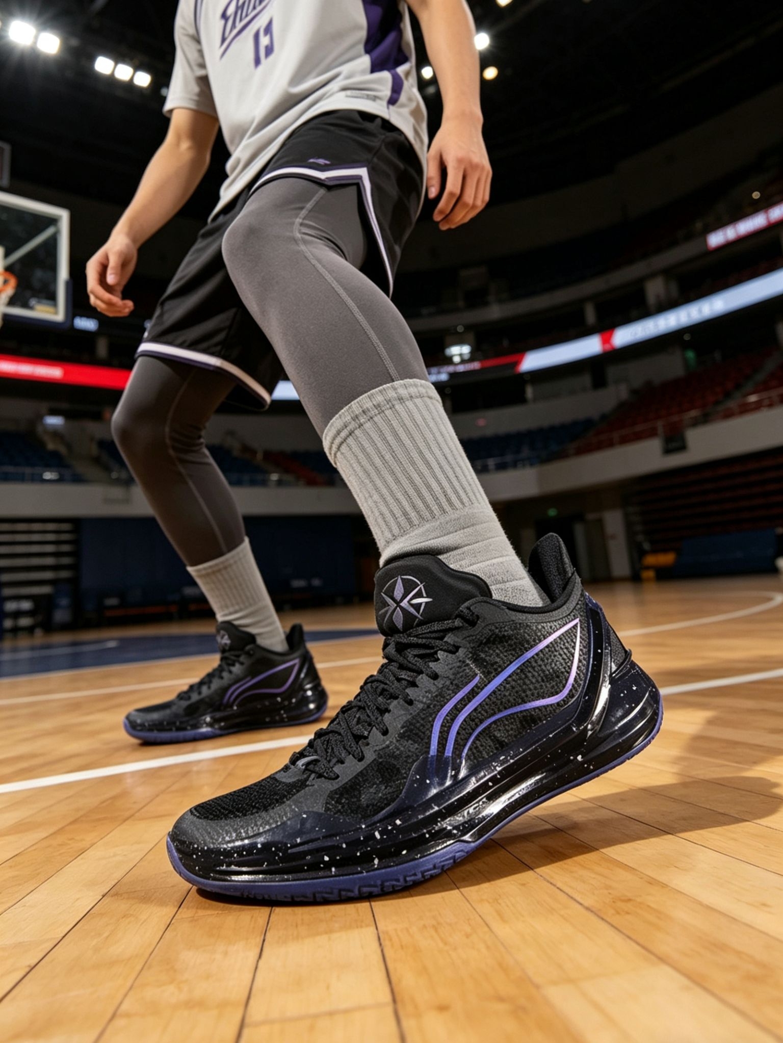 颜值堪称「低调实战天花板」:鞋身以纯黑工程网布为基底,搭配星空泼墨TPU装饰条,紫蓝渐变李宁Logo点缀,低调不张扬;后跟印有专属利刃星标,鞋舌、鞋垫印有品牌标识,细节拉满;半透明冰晶蓝外底+锯齿状人字纹,上脚辨识度拉满,打球、日常穿搭都能hold住,男女同款,情侣款首选。