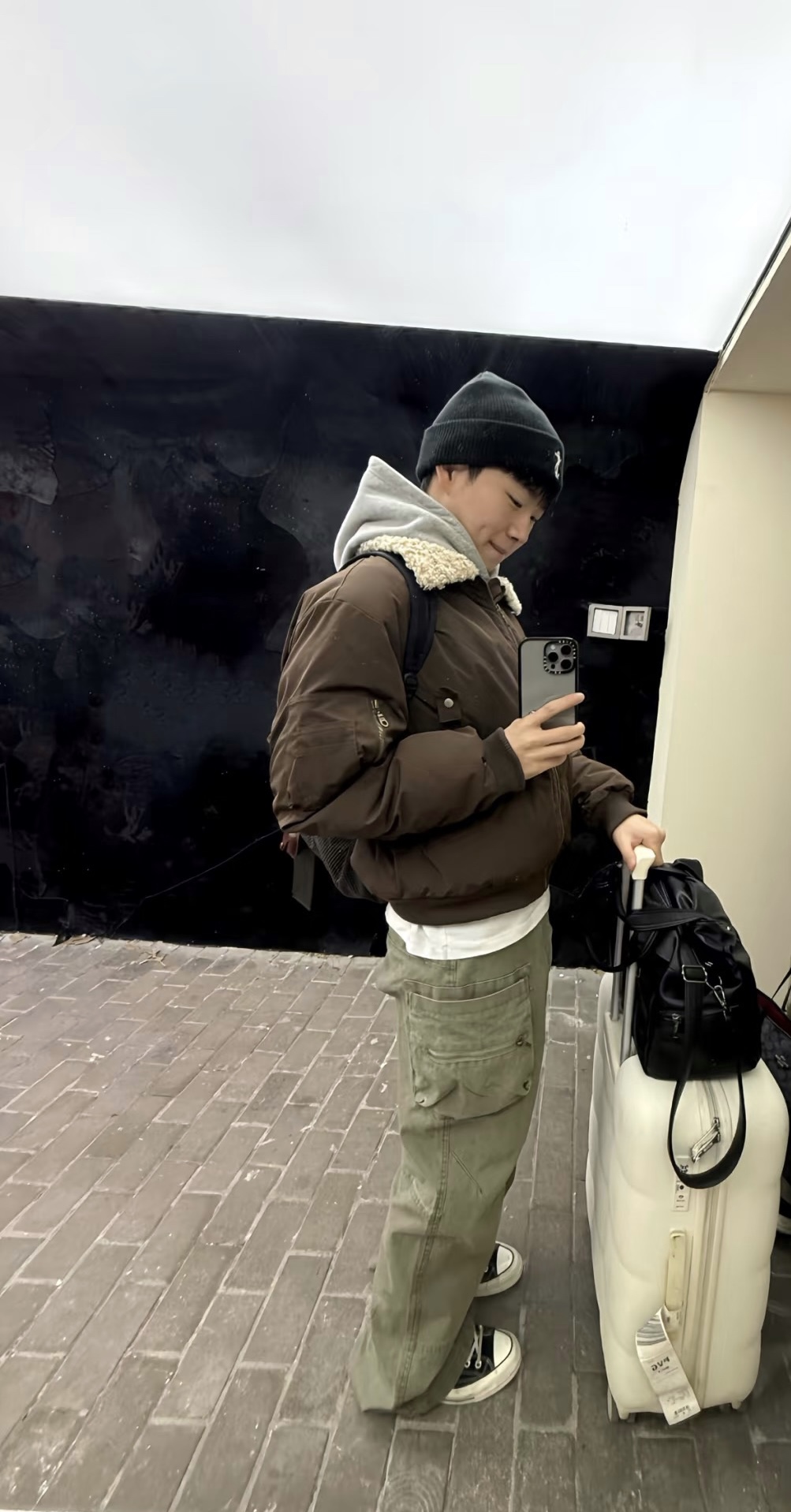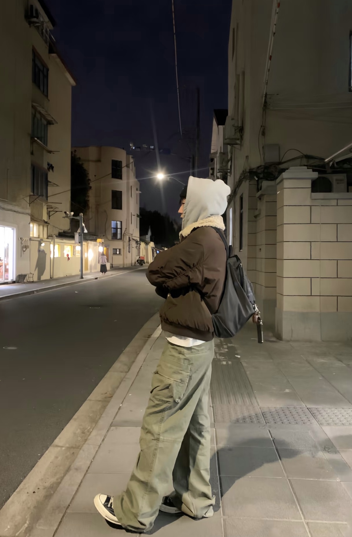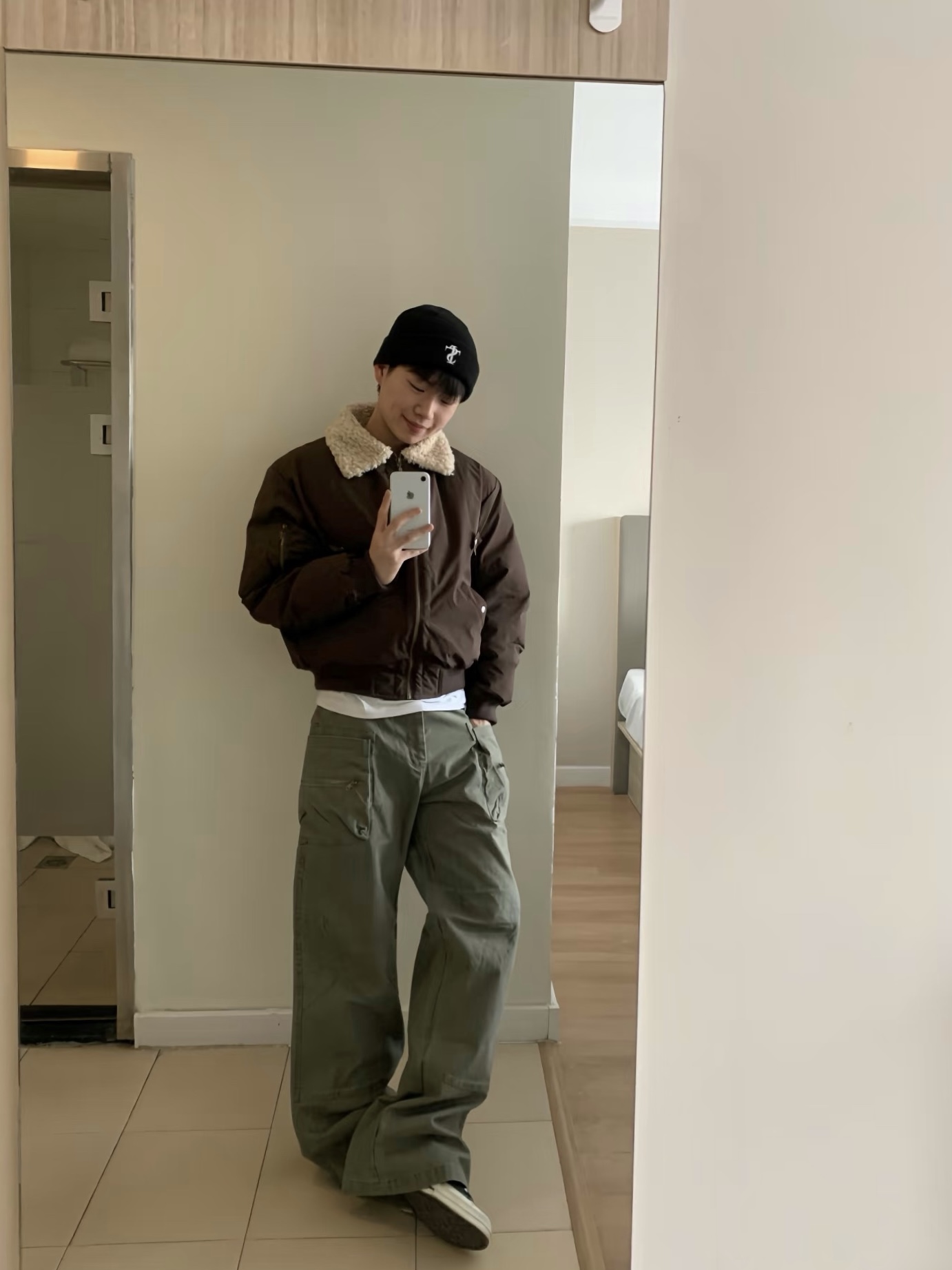 开春炸街就靠这套!棕色羊羔毛领飞行夹克太顶了😜 复古做旧质感拉满,羊羔毛领细节感拉满,叠穿灰帽衫层次感直接拉满🏄🏼♂️ 军绿色工装阔腿裤+经典帆布鞋,宽松版型帅到犯规 整套美式街头感拉满,早春出街、通勤都能打,酷感少年感双在线🤩