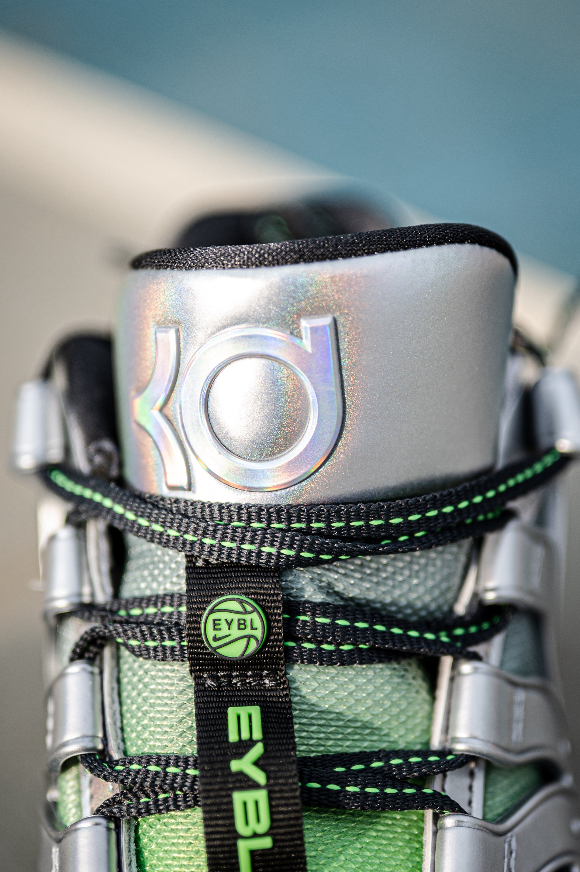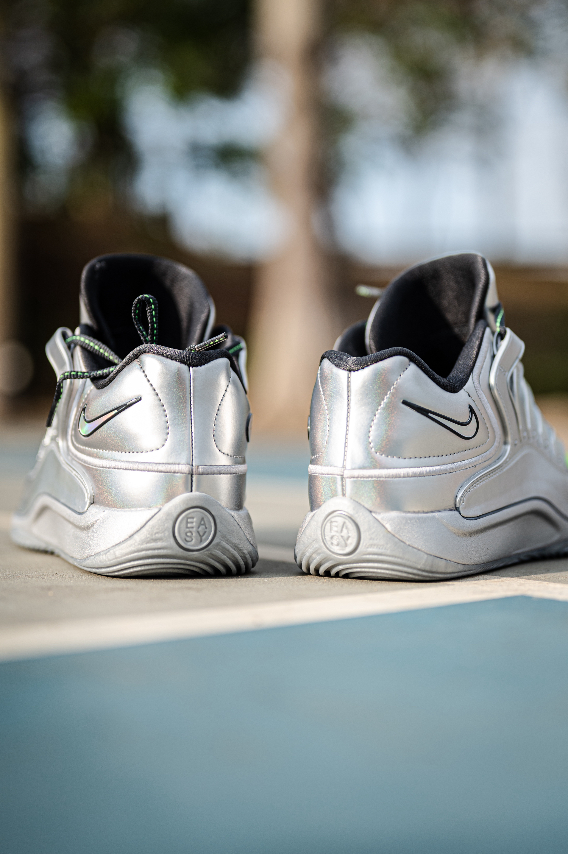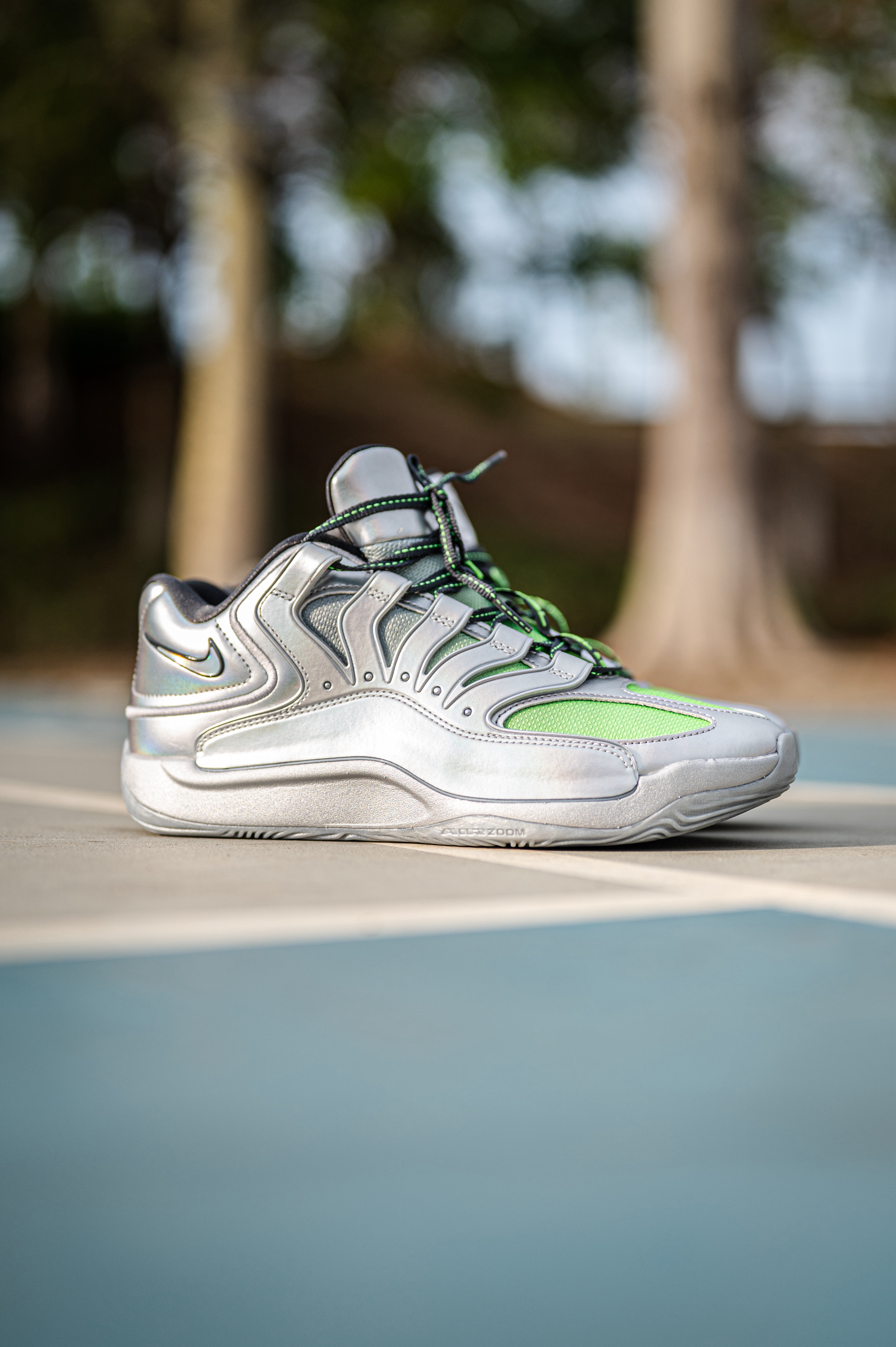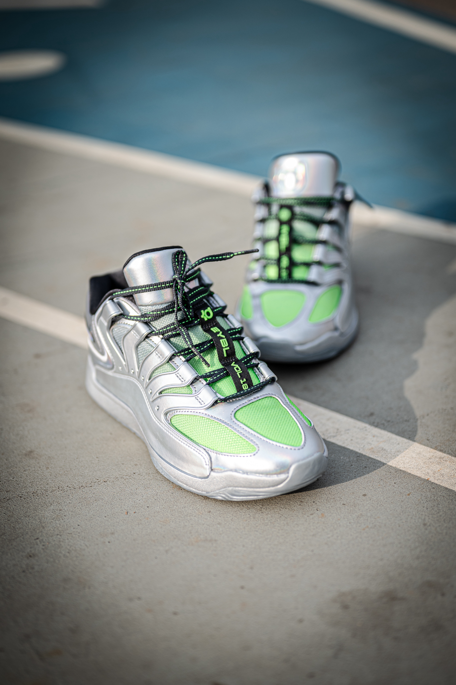 这款杜兰特18不适合后卫穿着,重心虽然不高,但它是适合锋线投射打法的特点。 EYBL配色其实是采用了银色和绿色的搭配,鞋身上有着一些EYBL和NIKE的LOGO。 透气一般,舒适度还行,但对于我宽脚脚型不会觉得太贴合。 AIR ZOOM和Nike Air的缓震配置,适合体重偏大一些的锋线。