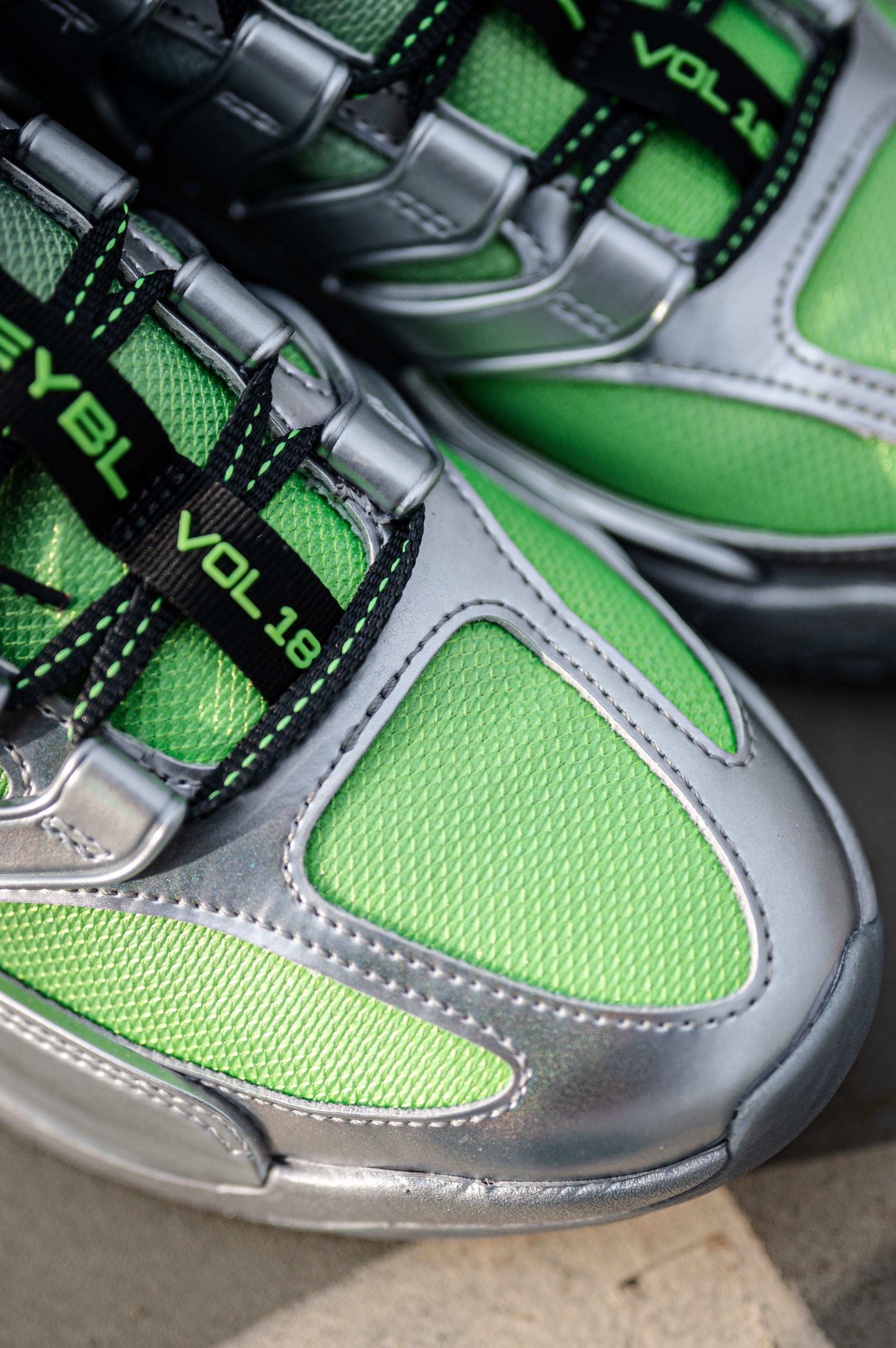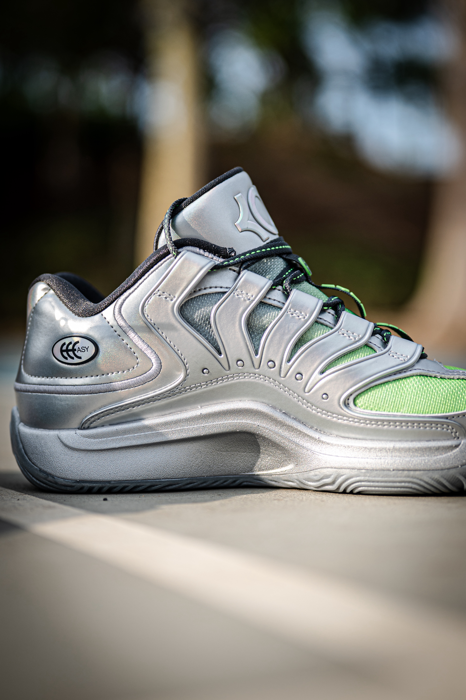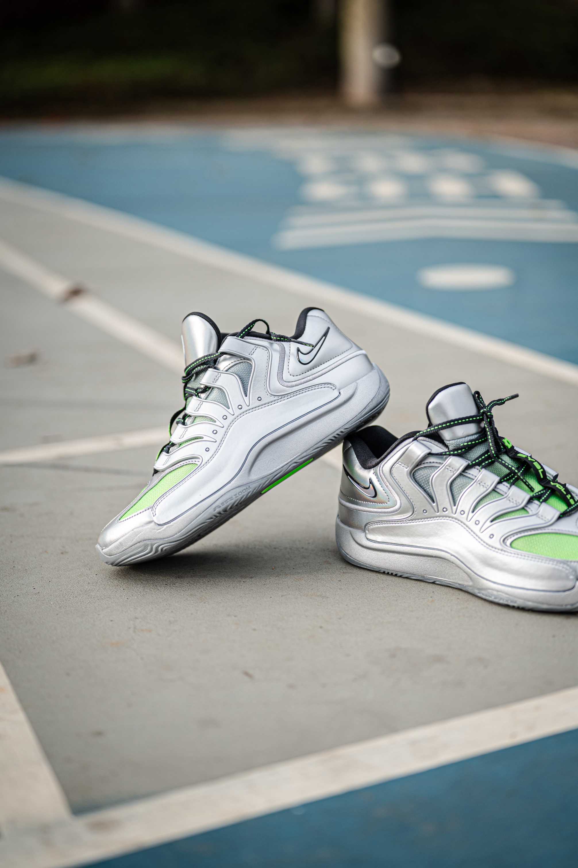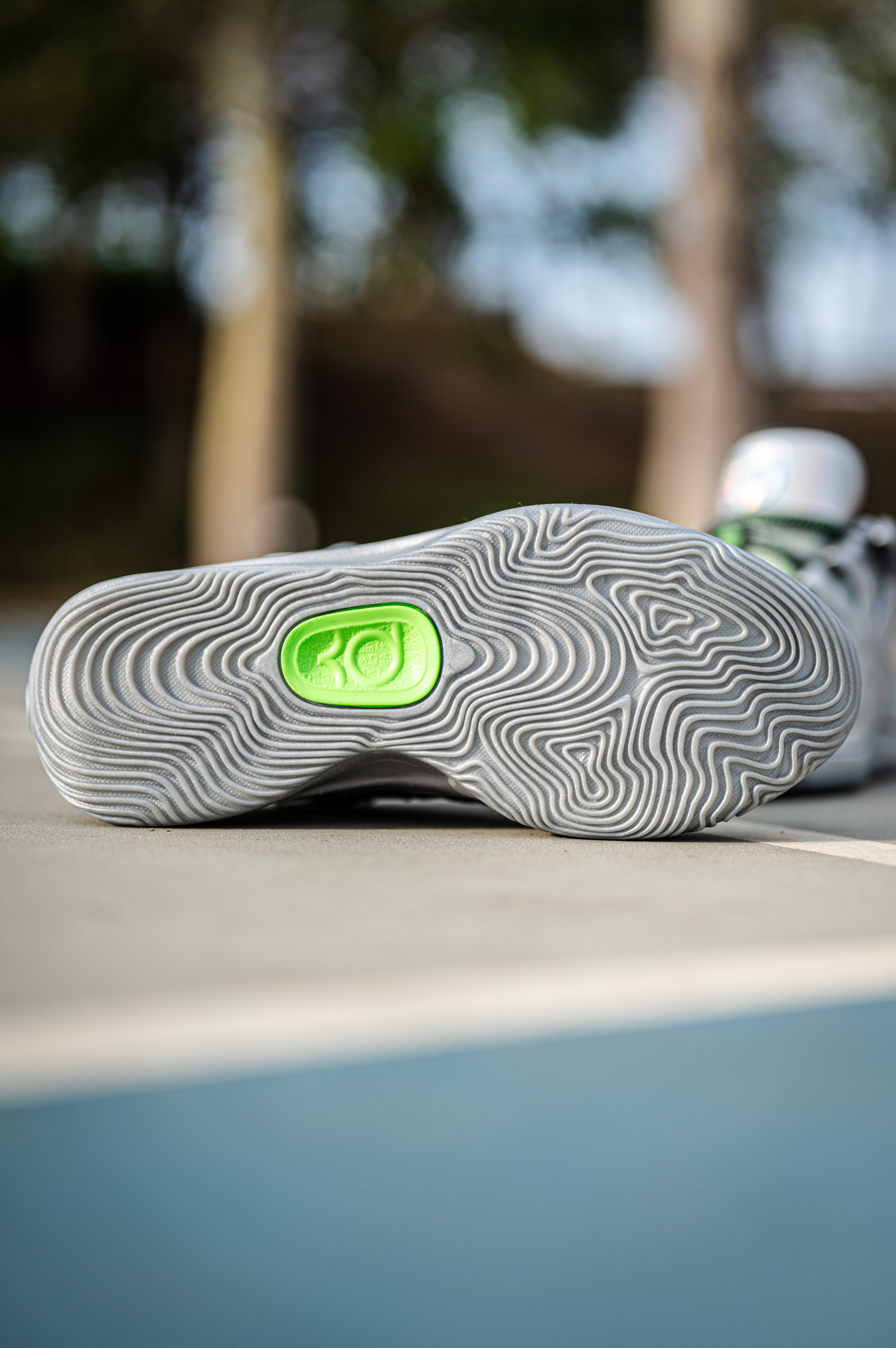 这款杜兰特18不适合后卫穿着,重心虽然不高,但它是适合锋线投射打法的特点。 EYBL配色其实是采用了银色和绿色的搭配,鞋身上有着一些EYBL和NIKE的LOGO。 透气一般,舒适度还行,但对于我宽脚脚型不会觉得太贴合。 AIR ZOOM和Nike Air的缓震配置,适合体重偏大一些的锋线。