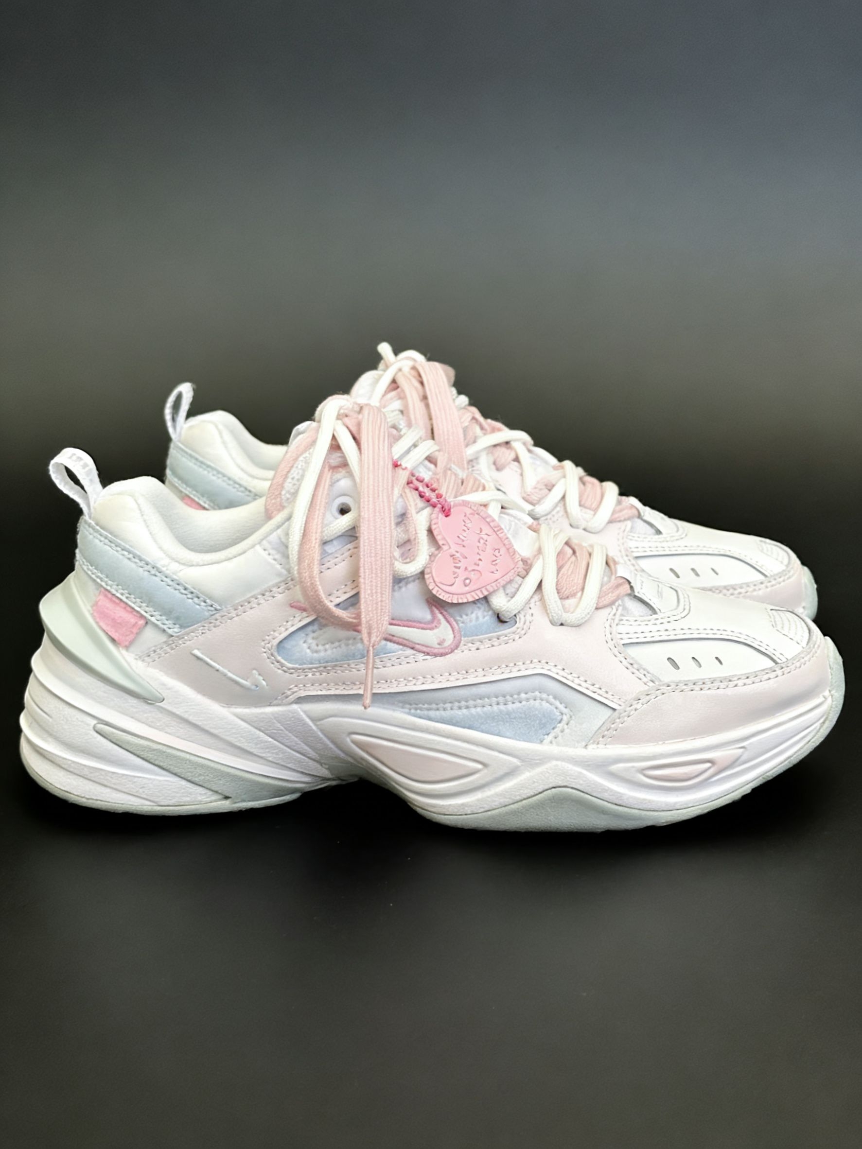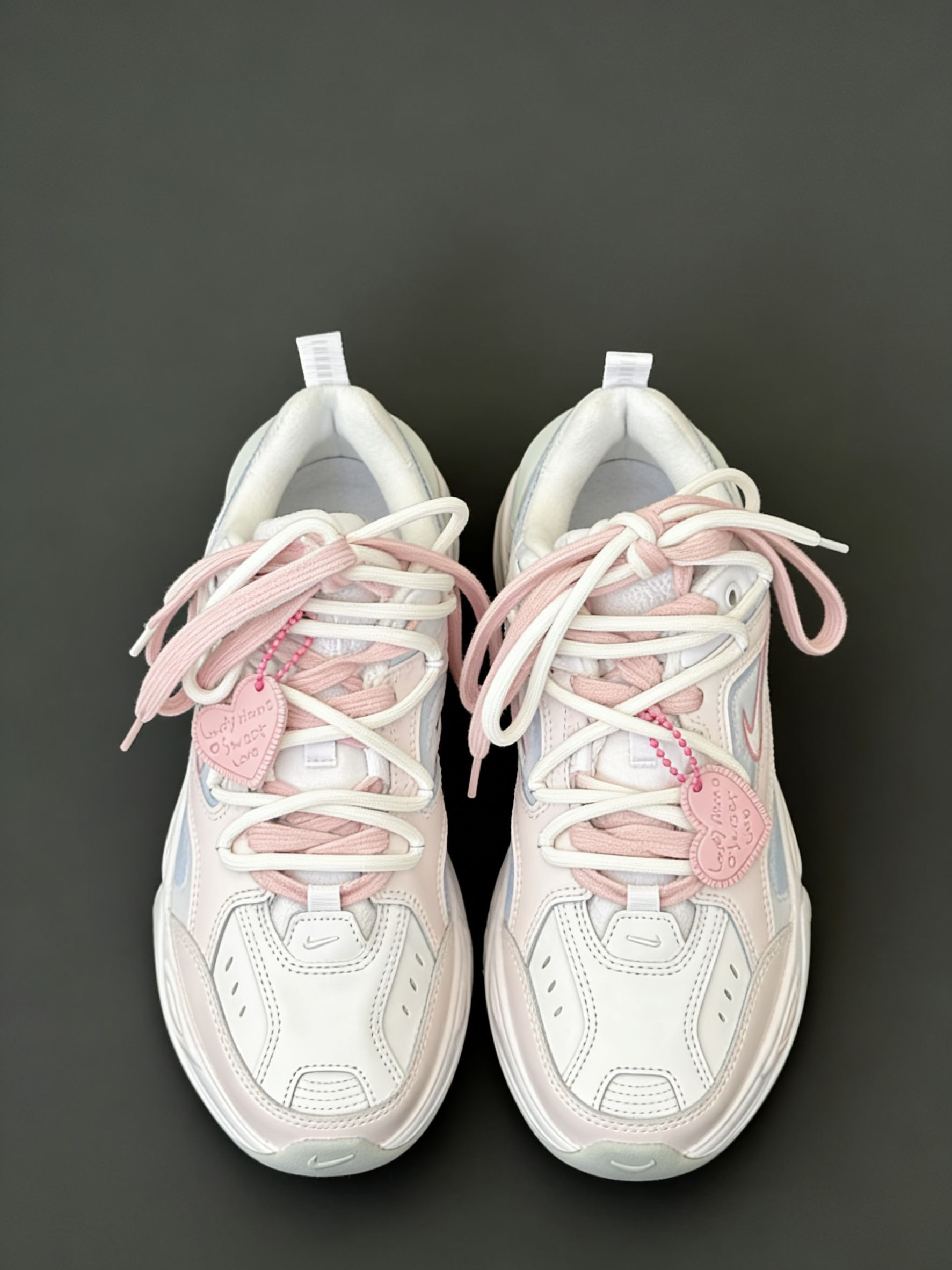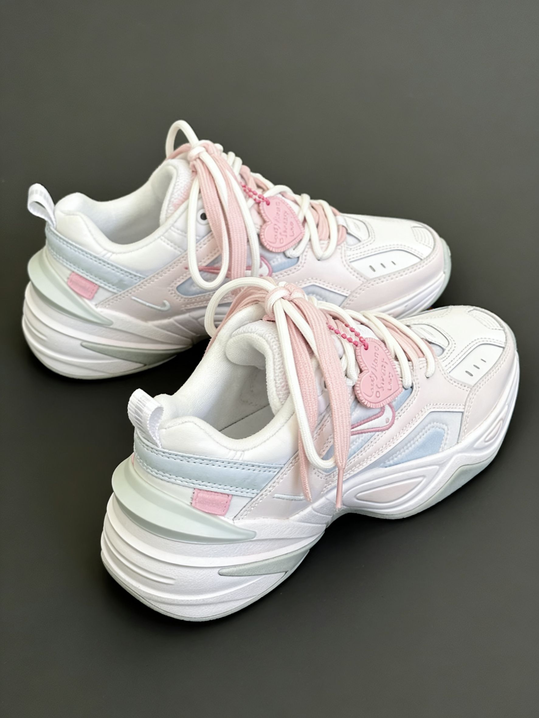 一、颜值暴击:少女心炸裂的“多巴胺”老爹鞋 第一眼看到这双Nike M2K Tekno“亿点点甜”定制款,就被它奶fufu的粉蓝马卡龙配色击中!鞋身以米白为基底,搭配浅粉、淡蓝的渐变拼接,像把彩虹揉进了鞋里,甜而不腻。最戳我的是鞋带上的粉色爱心挂饰,写着“Lovely Home of Sweet Love”,细节拉满,少女心直接爆棚!上脚后,厚底设计悄悄拉长腿部线条,搭配短裙、牛仔裤都超显腿细,...
