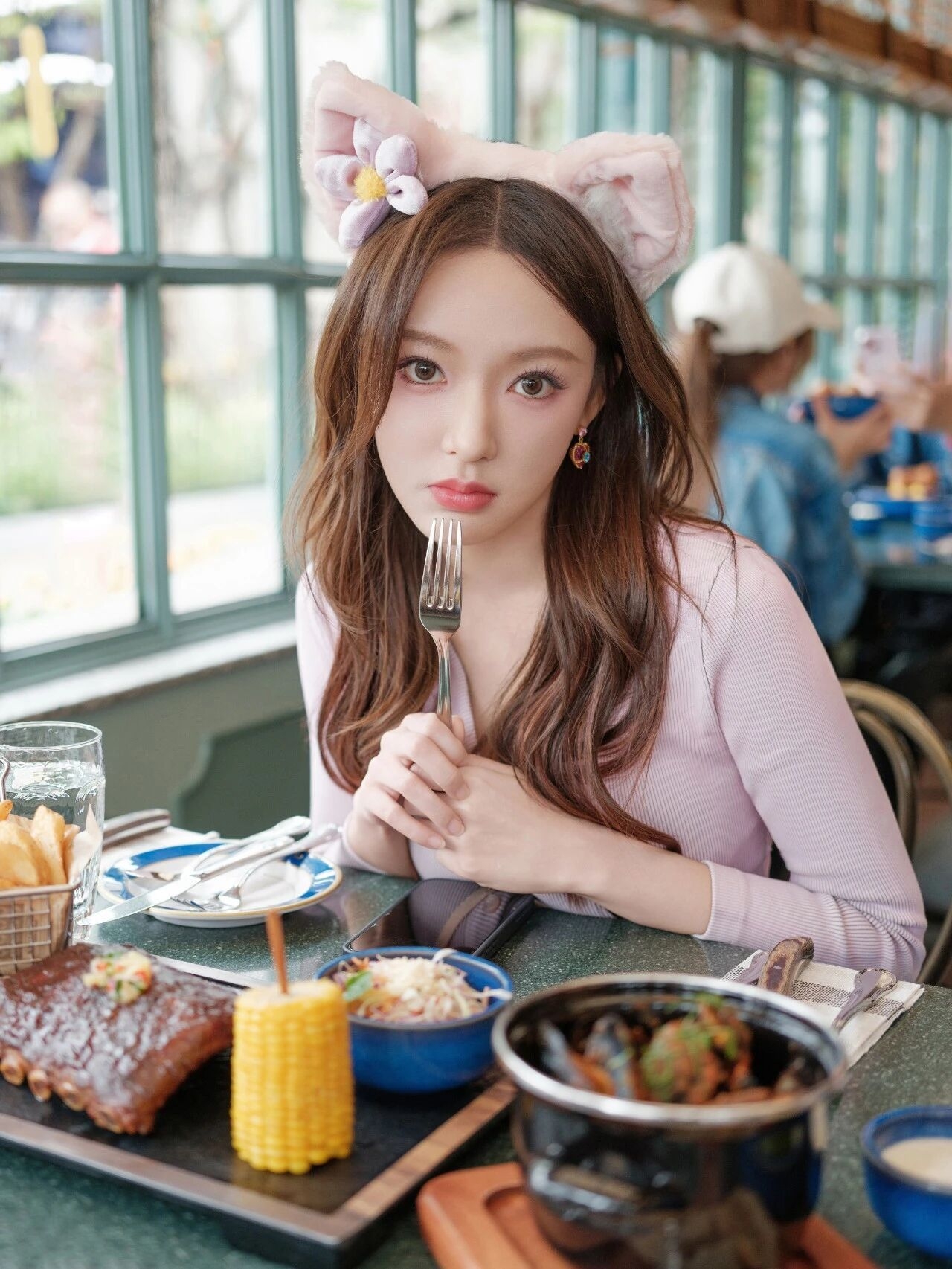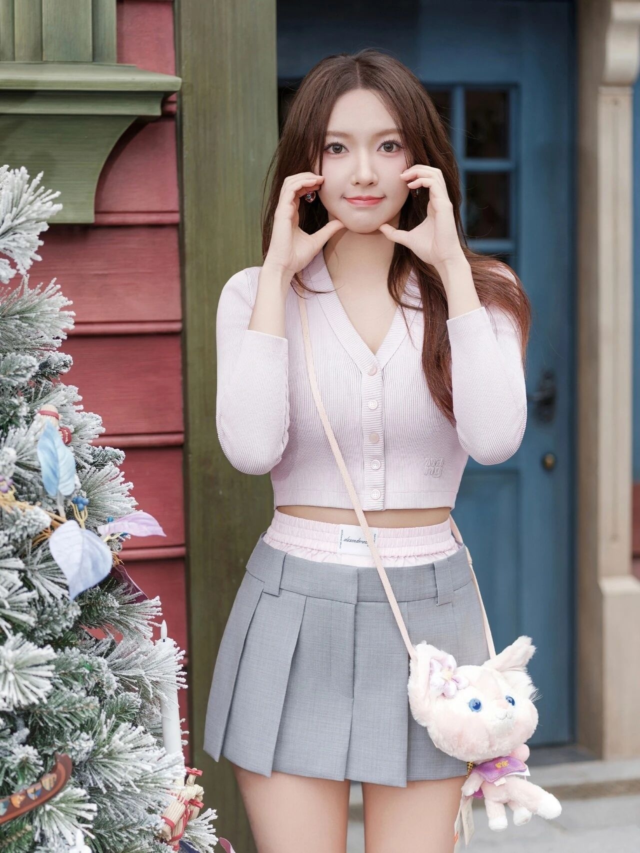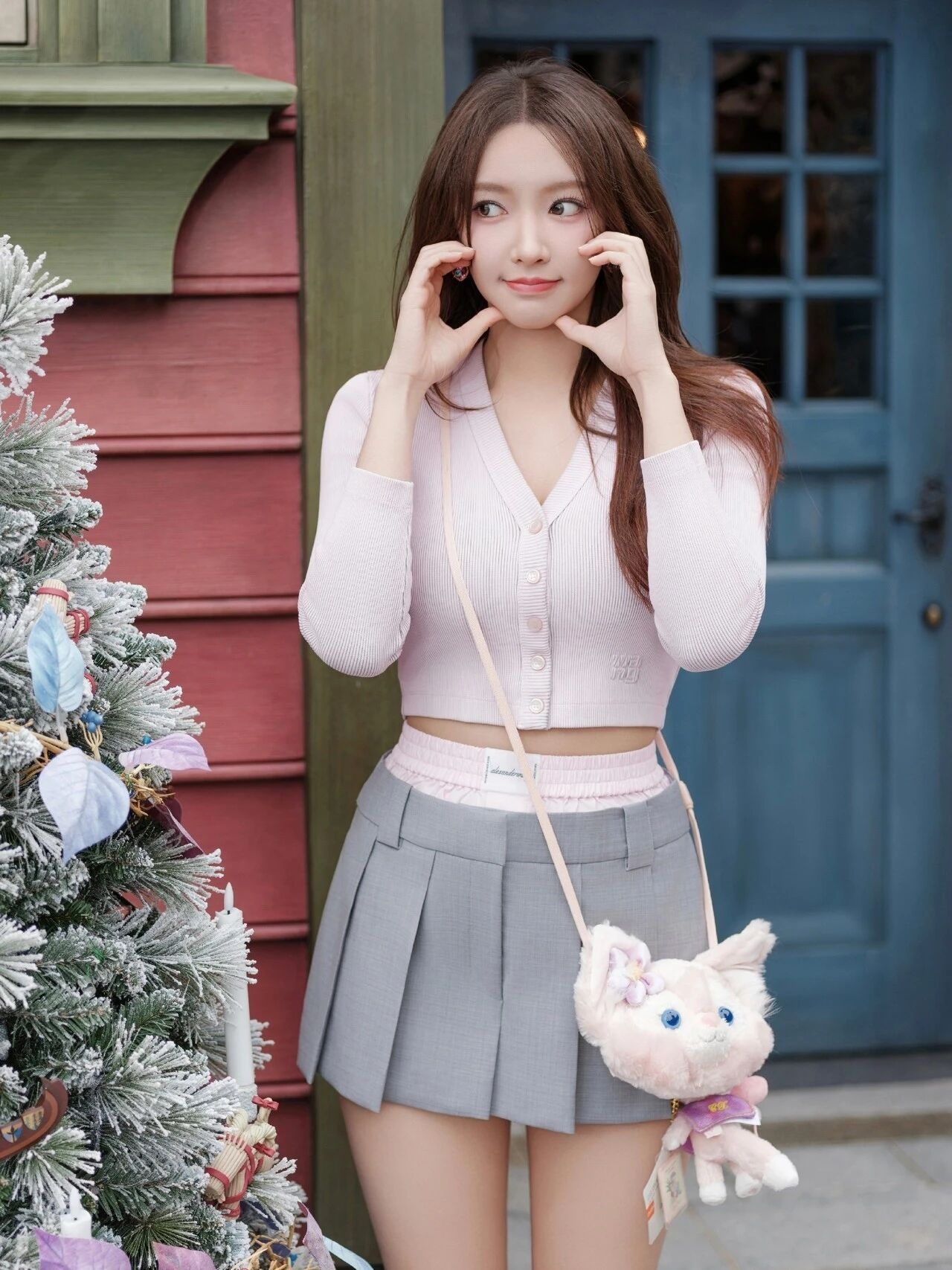 想要一键解锁程潇同款甜美元气少女感?这套粉灰配色穿搭可以直接照搬!💕 上身选择一件淡粉色短款针织开衫,V领设计悄悄拉长脖颈线条,微微露腰更显灵动。搭配一条基础款浅灰色百褶短裙,瞬间穿出清爽又青春的学院气息。 配饰是整体灵魂!一个毛绒绒的猫咪斜挎包,或是一只超大的玲娜贝儿玩偶,立刻注入梦幻童话感。别忘了用粉色猫耳发箍或蝴蝶结发饰点缀发型,甜度瞬间加成。👒 脚踩一双白色或浅灰色厚底运动鞋,搭配中...