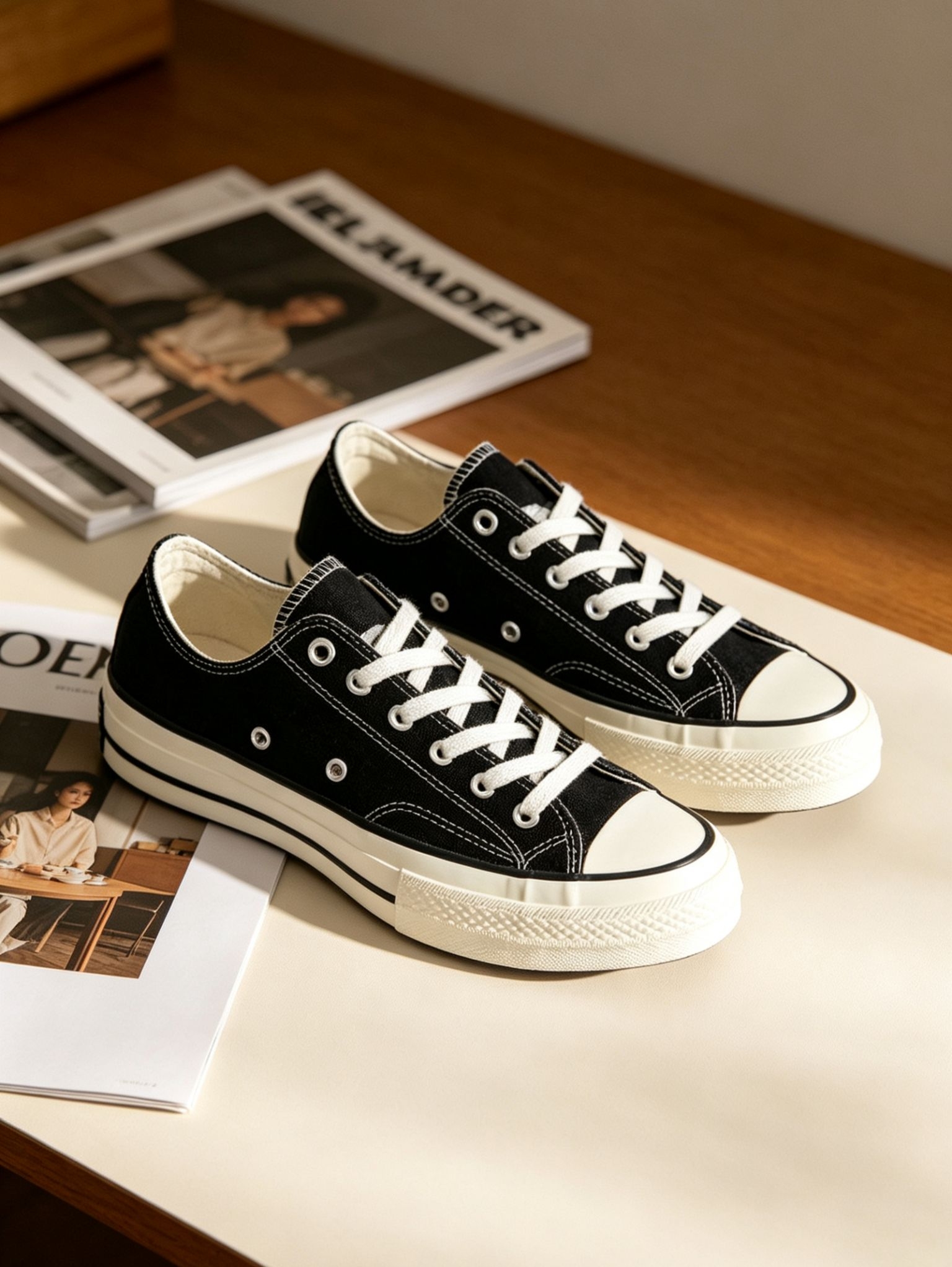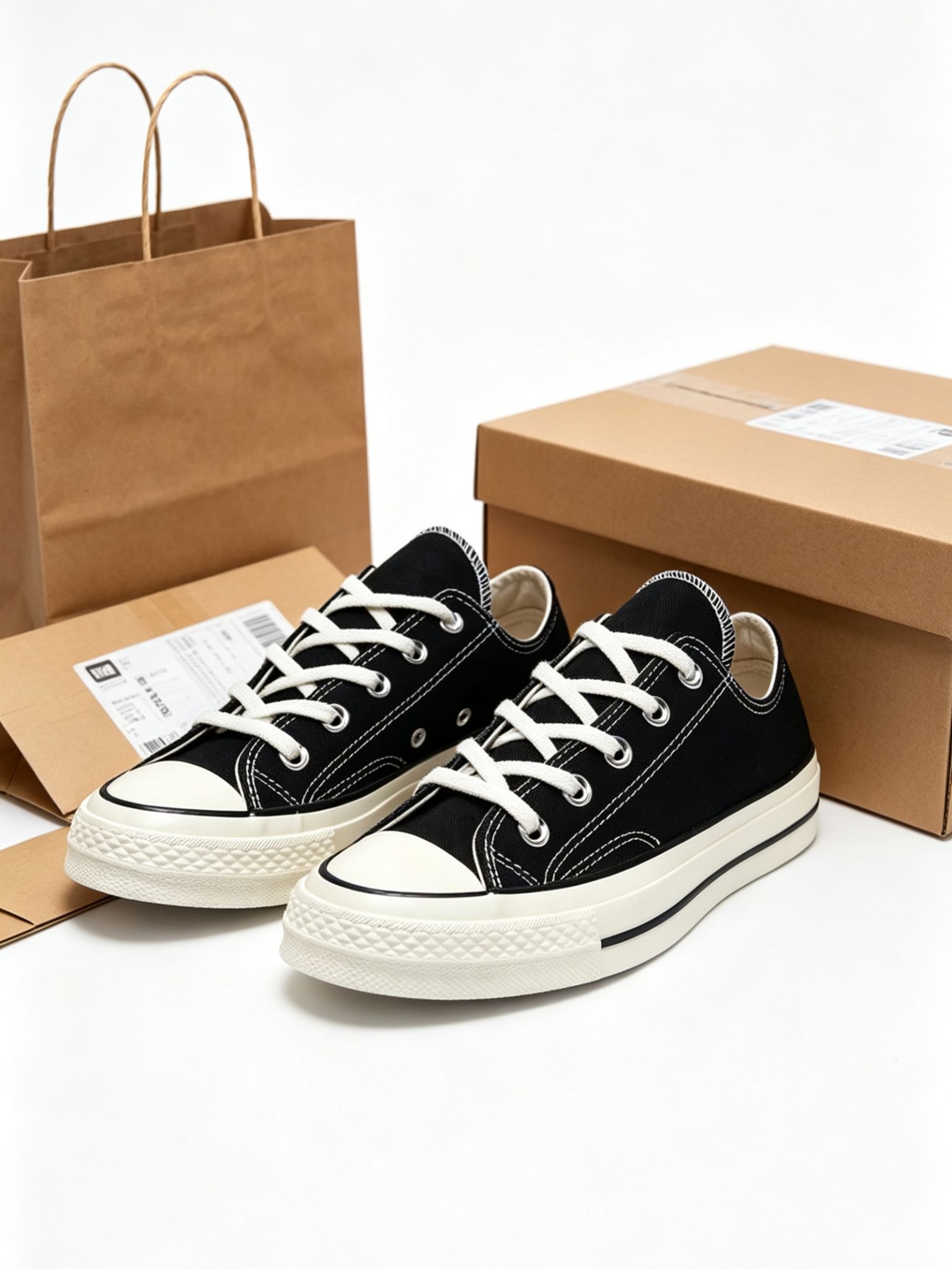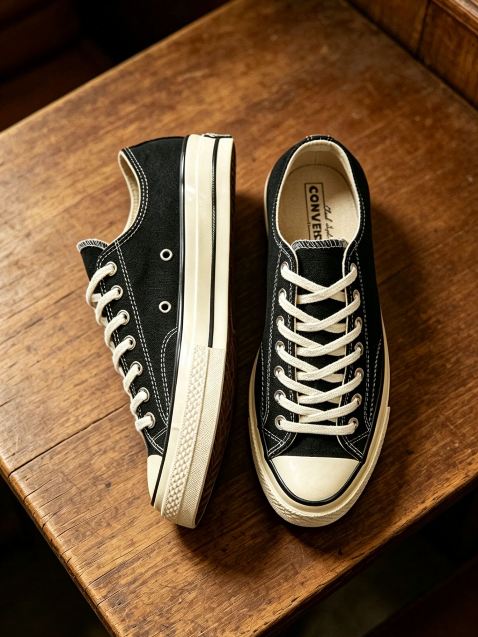 鞋柜里永远缺一双百搭鞋?匡威1970s 黑色低帮,从学生党到职场人都在穿,复古颜值+轻便脚感,日常出街、轻度通勤全hold住,闭眼入不踩雷! ✨ 核心配置速览 - 经典黑色低帮:米白硫化中底+黑色帆布鞋面,标志性星箭Logo,复古感拉满 - 优质帆布鞋面:透气不闷脚,四季适配,越穿越有质感 - 硫化橡胶大底:防滑耐磨,纹路清晰,日常走路、轻度运动都稳 - 经典鞋楦设计:窄长鞋头+...