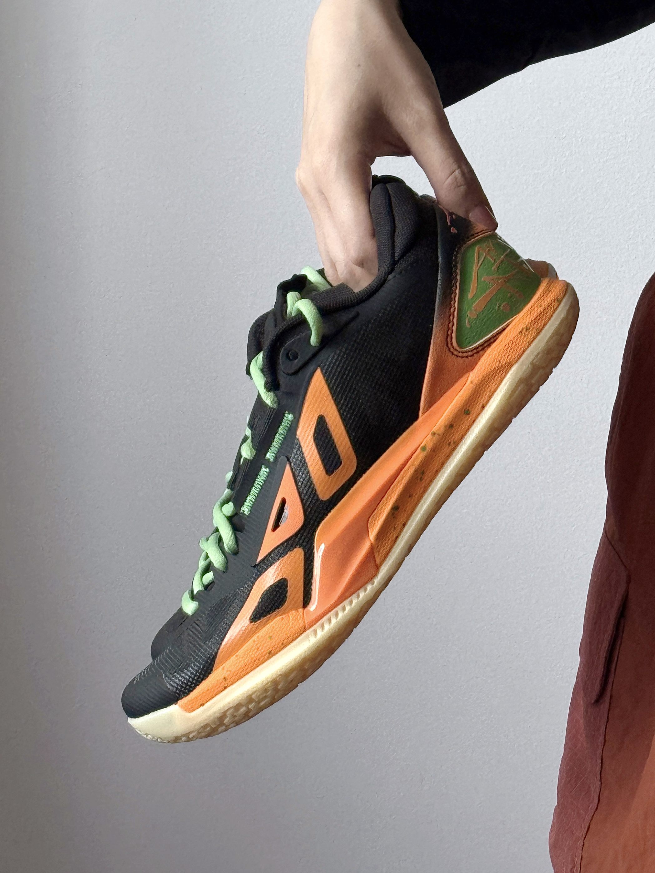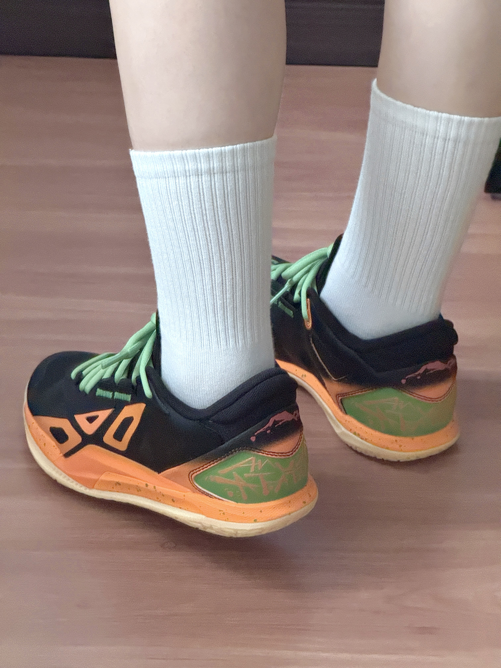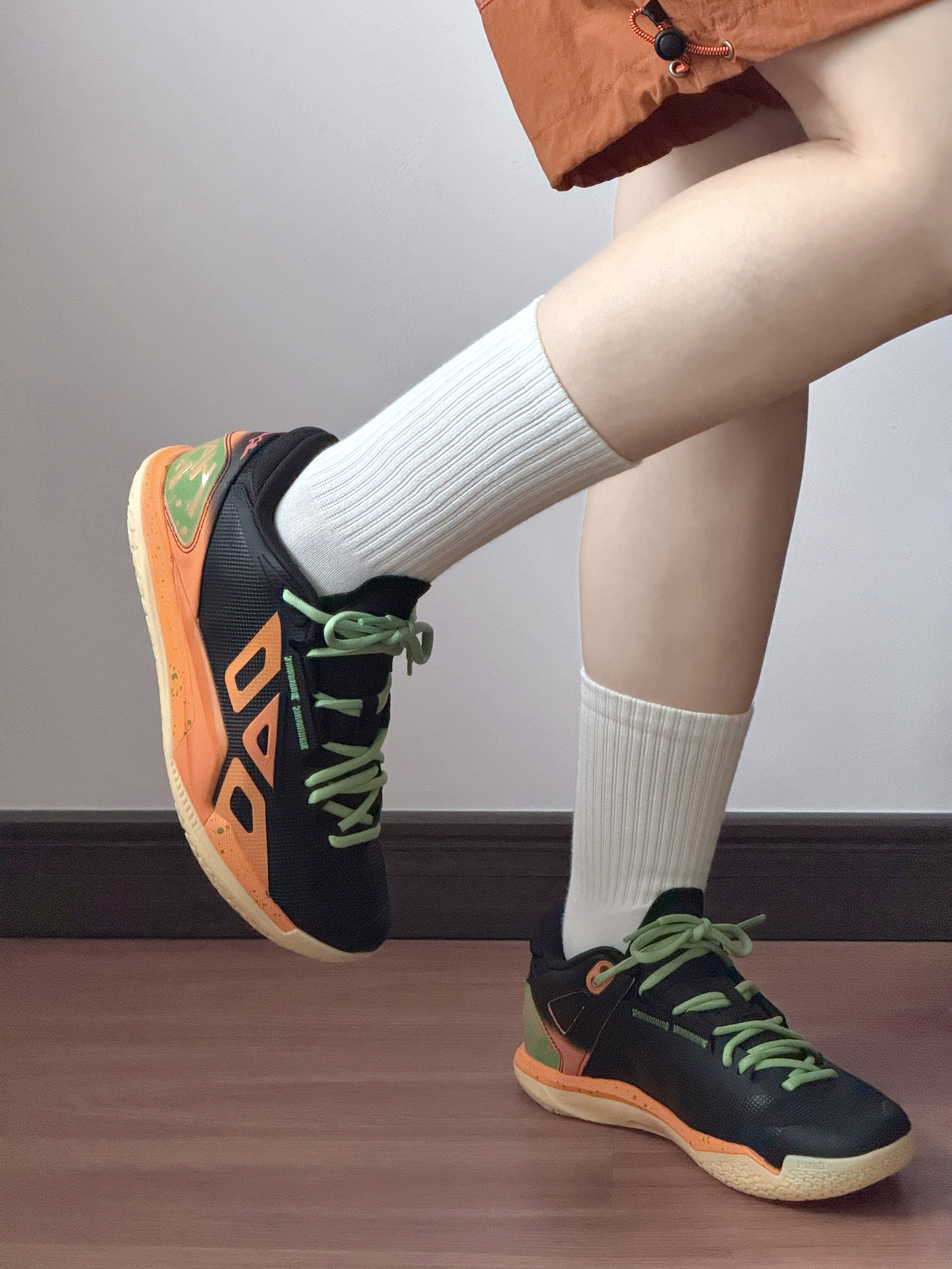 今日是运动girl👧🏻 这双黑橙篮球鞋真的帅炸了!🔆 撞色设计+薄荷绿鞋带 上脚直接氛围感拉满✨ 穿上立get帅气运动女生感 透气不闷脚,打球出街都能穿!