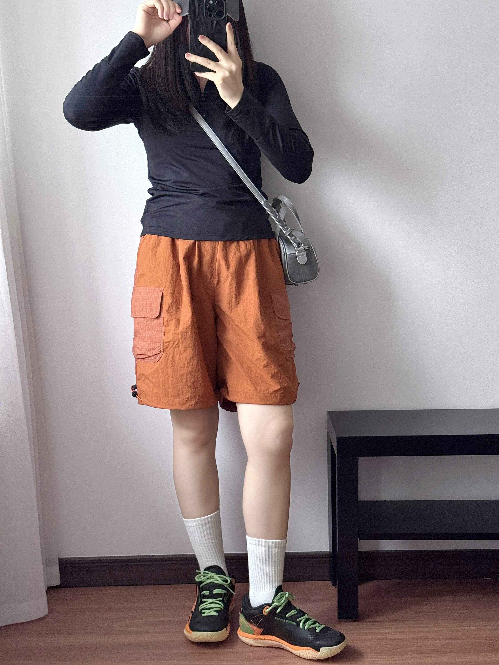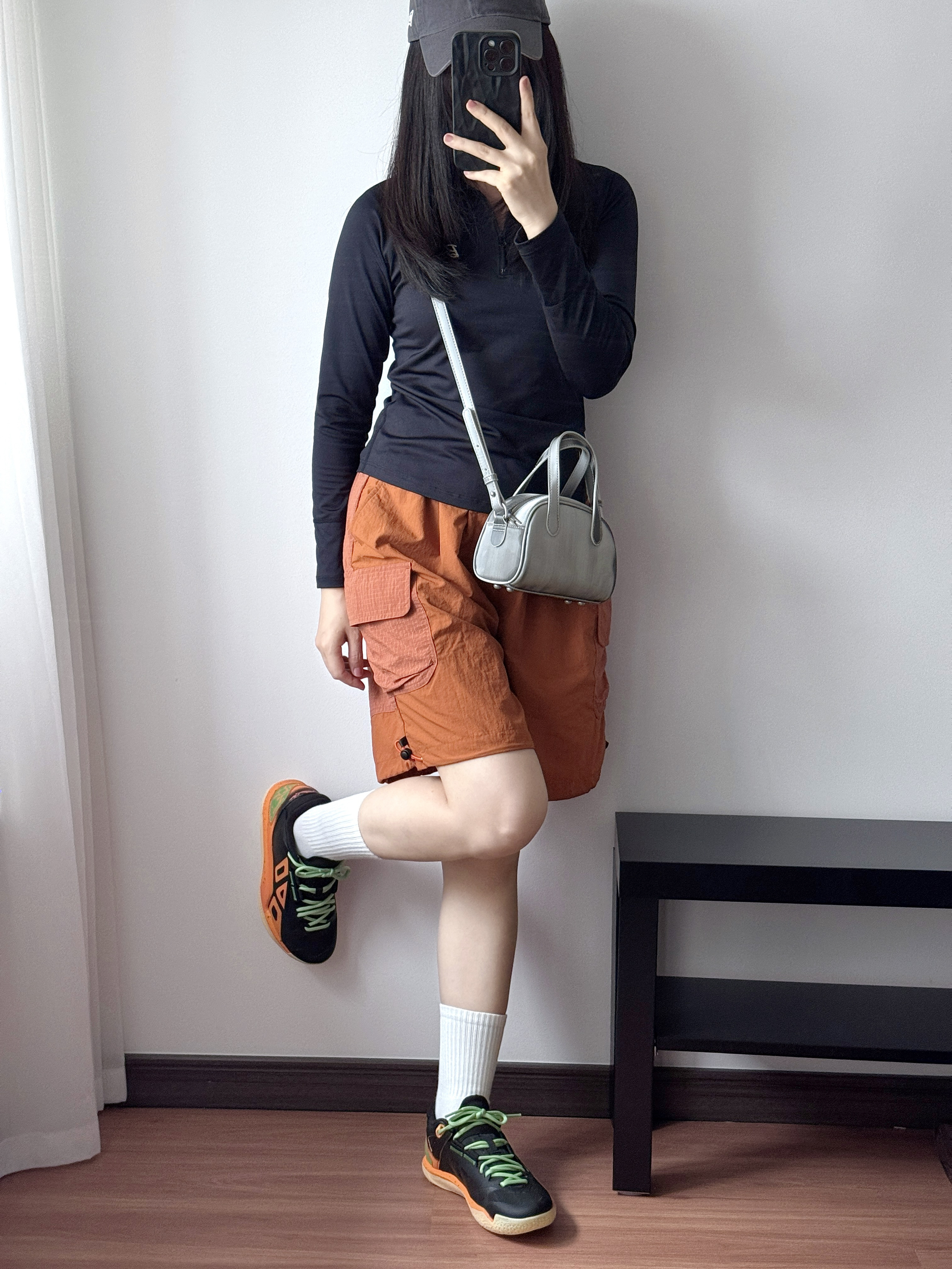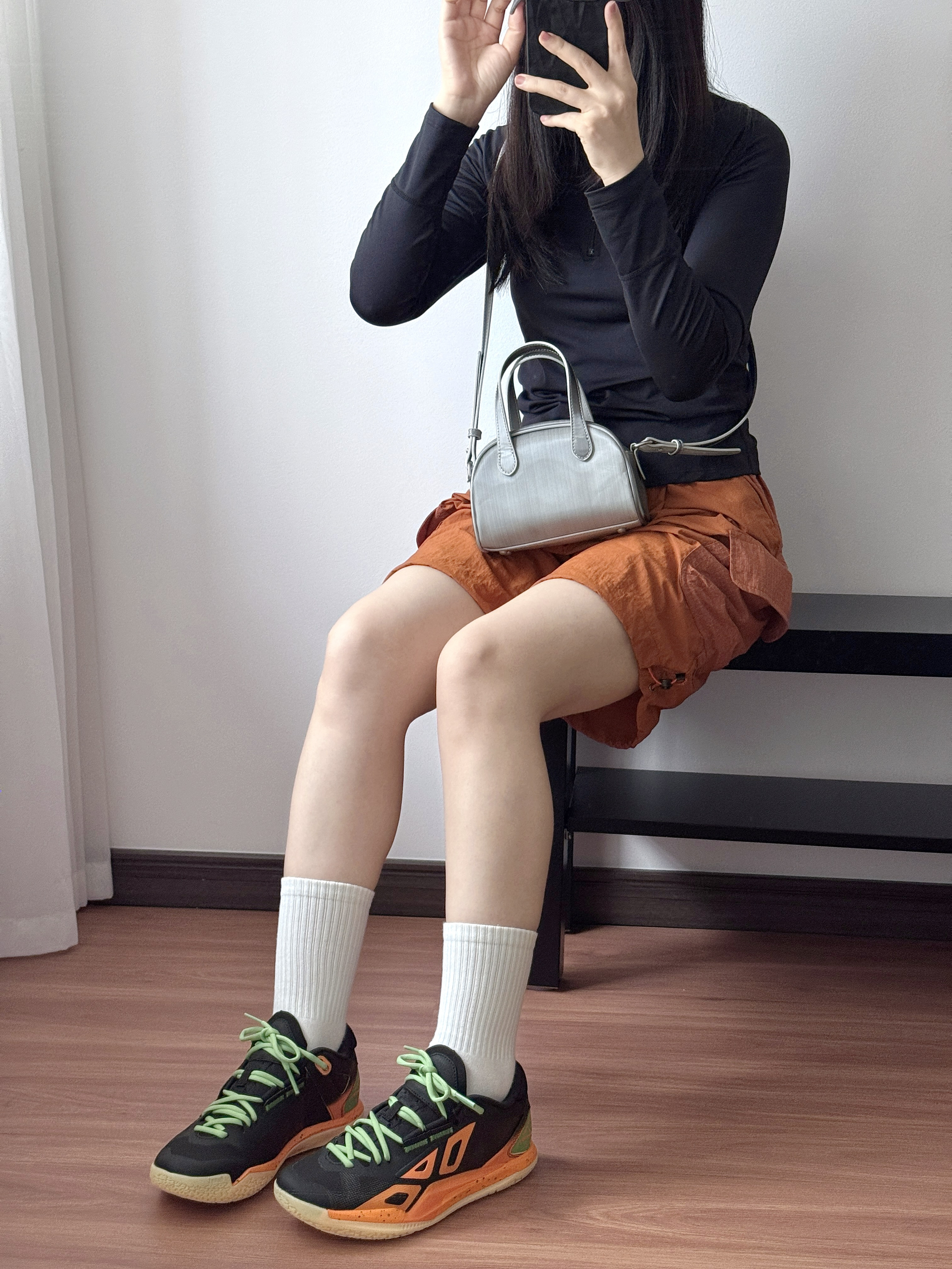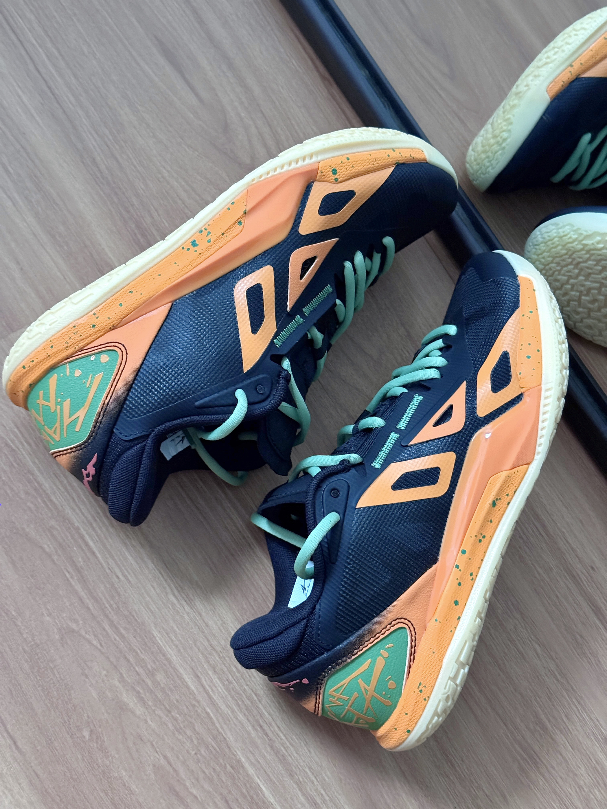 今日是运动girl👧🏻 这双黑橙篮球鞋真的帅炸了!🔆 撞色设计+薄荷绿鞋带 上脚直接氛围感拉满✨ 穿上立get帅气运动女生感 透气不闷脚,打球出街都能穿!