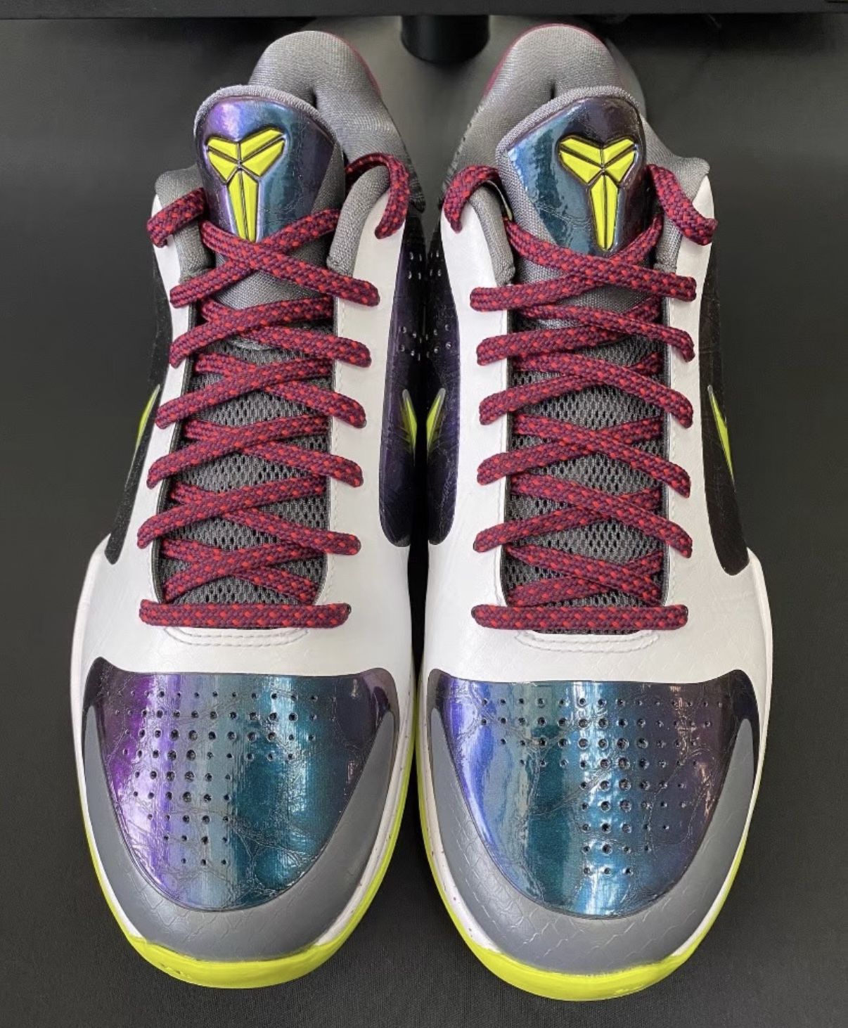 谁懂科蜜的快乐啊!终于蹲到心心念念的Kobe 5小丑,上脚那一刻直接被颜值和质感狠狠拿捏,必须按头安利给所有球鞋党和实战党! 这双鞋的颜值真的长在我的审美点上!鞋头自带幻彩珠光质感,不同角度下折射出紫蓝渐变的光泽,低调又吸睛;白灰基底搭配荧光绿Swoosh,再加上酒红色编织鞋带,撞色设计高级感拉满,不管是搭配运动装出街,还是换上长袜实战,回头率都直接爆表。鞋舌的曼巴logo细节超精致,质感满满,...
