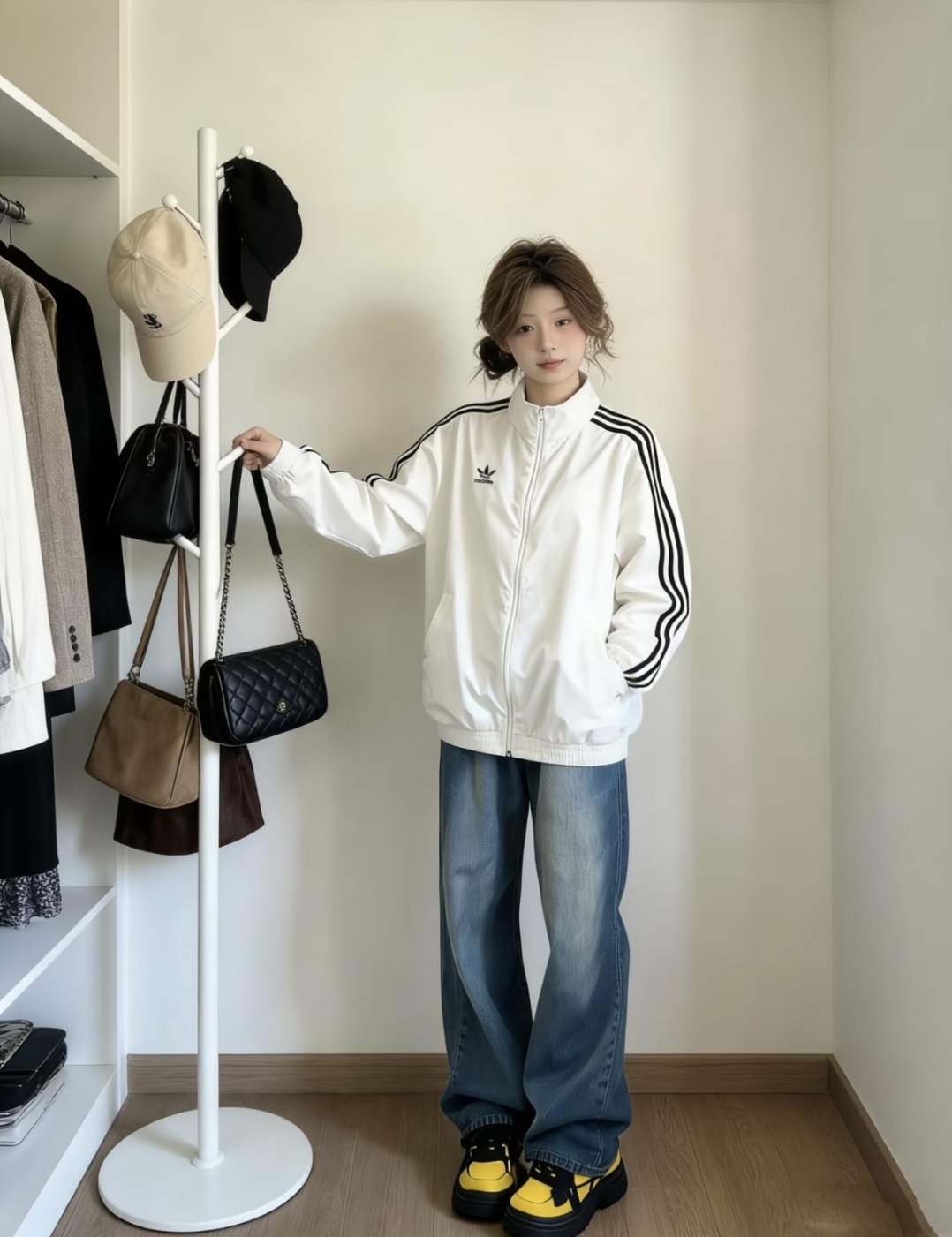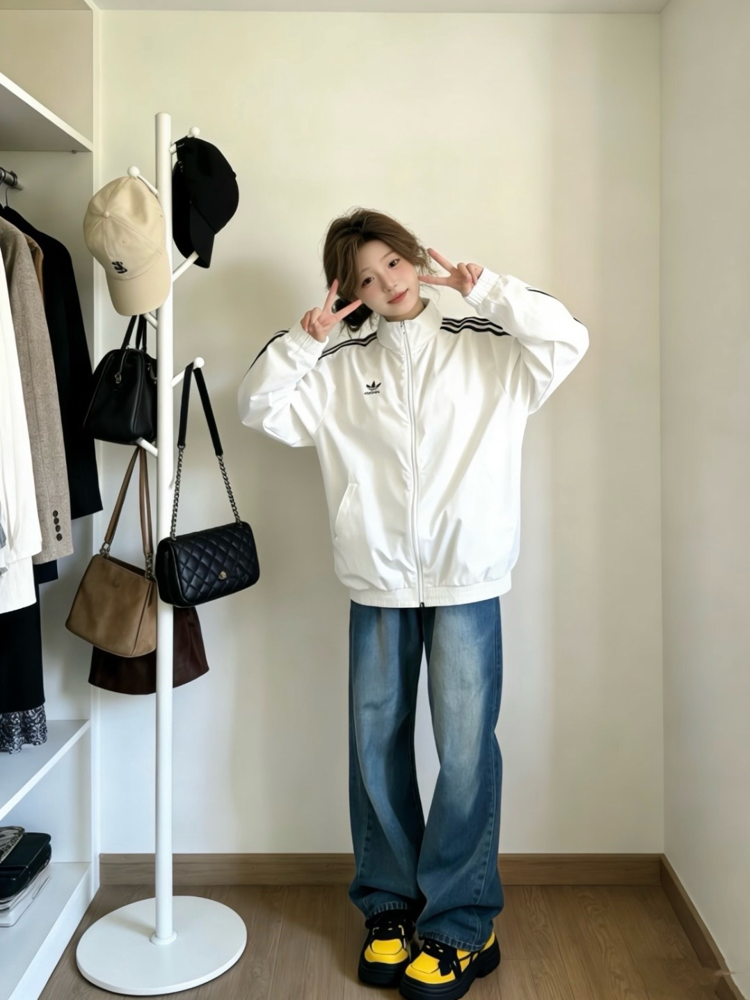 谁懂啊家人们!这件三叶草经典立领外套真的是衣柜里的常青款✨ 经典白色基底+三条杠设计,把复古运动风焊在身上,立领版型超显利落,宽松剪裁不挑身材,藏肉显瘦一绝!!轻松穿出松弛感,日常通勤、出街炸街全hold住。 面料顺滑透气,上身轻盈不闷汗,春秋单穿、冬天内搭都合适,穿个三五年都不会过时。真正的经典款从来不用跟风,识货的都懂它有多百搭好穿!